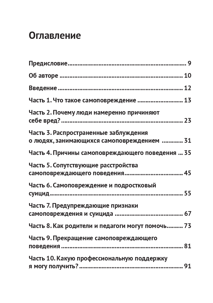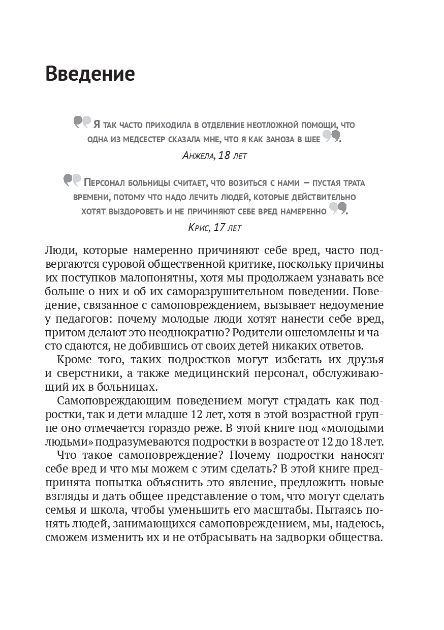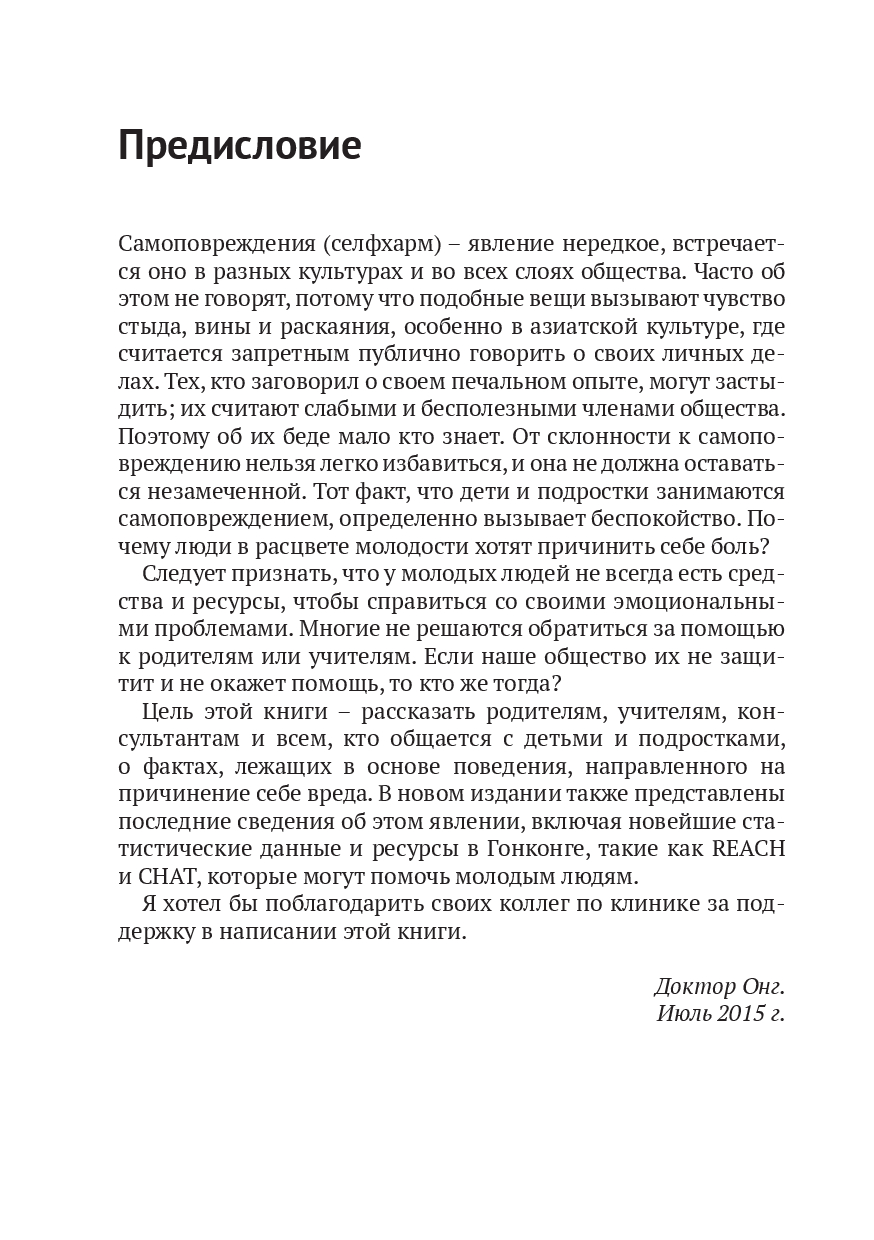 У молодых людей не всегда есть средства и ресурсы, чтобы справиться со своими эмоциональными проблемами. Многие не решаются обратиться за помощью к родителям или учителям. Книга подскажет, как вовремя заметить, что ребенок прибегает к самоповреждениям, и научить его адекватным образом контролировать свои эмоции и грамотно снимать стресс, не проявляя аутоагрессию.