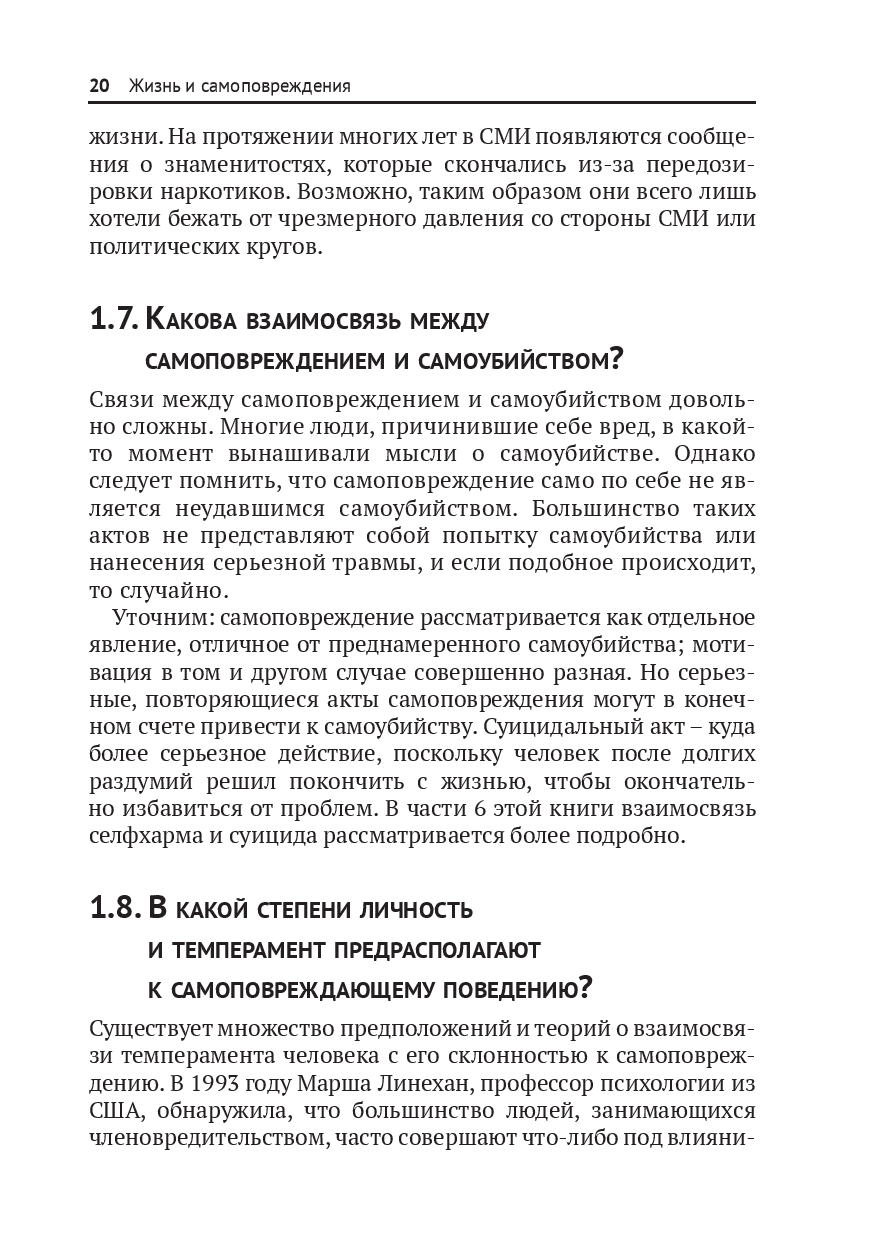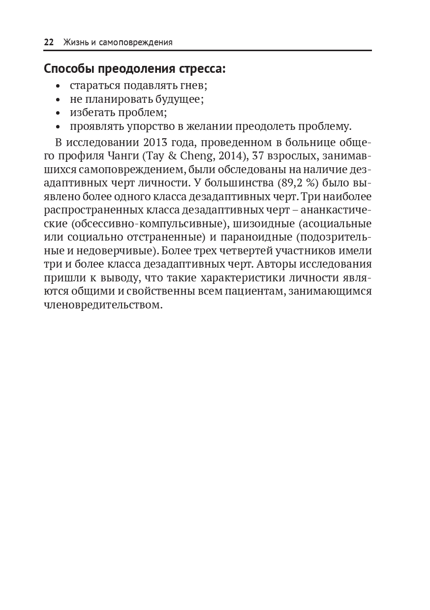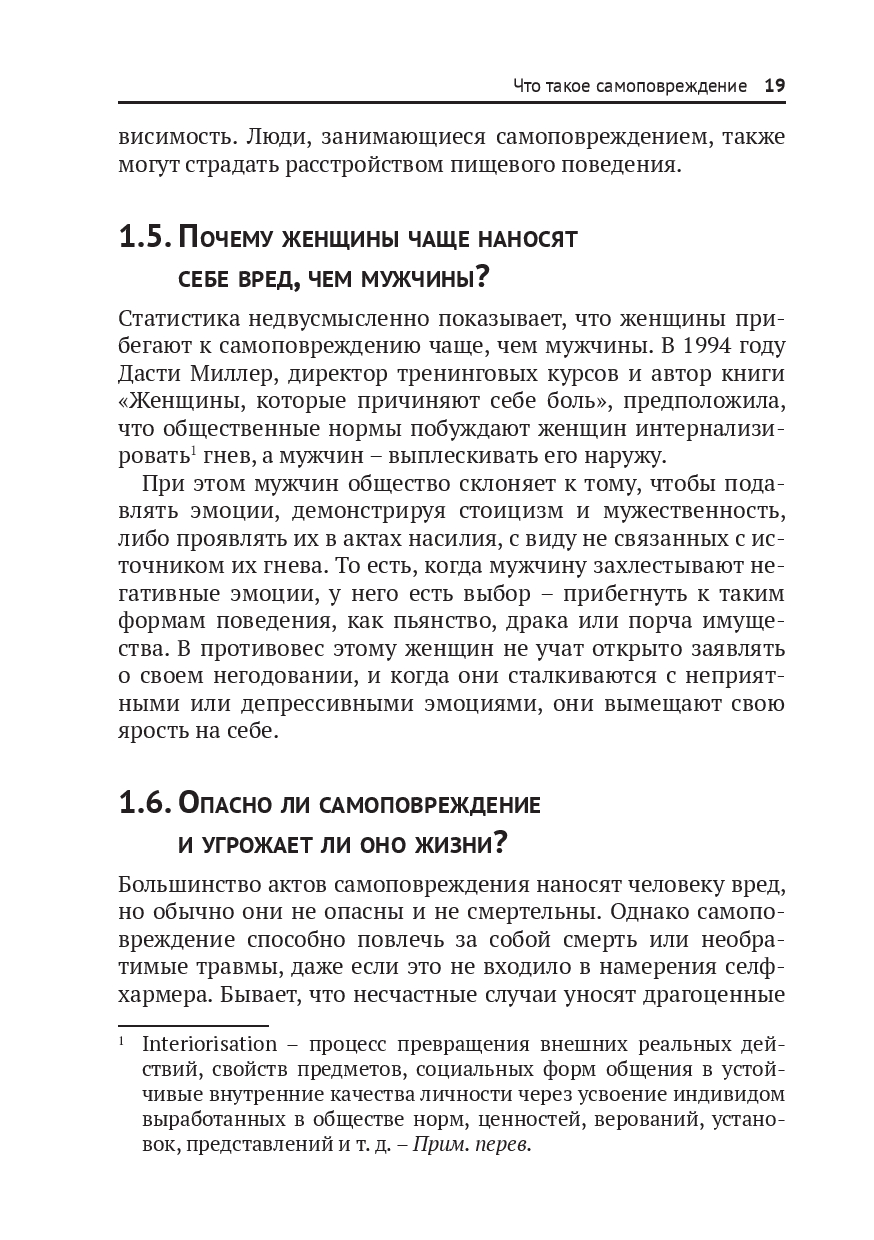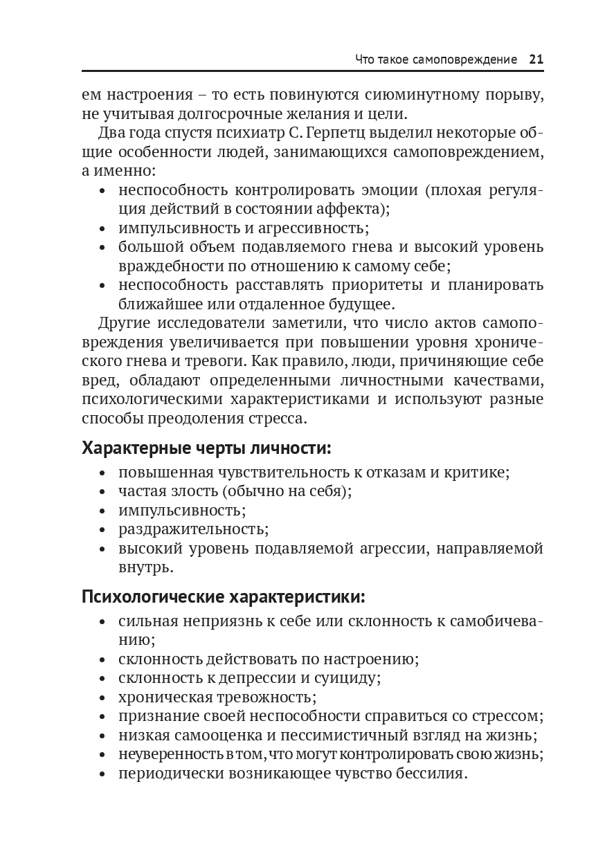 У молодых людей не всегда есть средства и ресурсы, чтобы справиться со своими эмоциональными проблемами. Многие не решаются обратиться за помощью к родителям или учителям. Книга подскажет, как вовремя заметить, что ребенок прибегает к самоповреждениям, и научить его адекватным образом контролировать свои эмоции и грамотно снимать стресс, не проявляя аутоагрессию.
