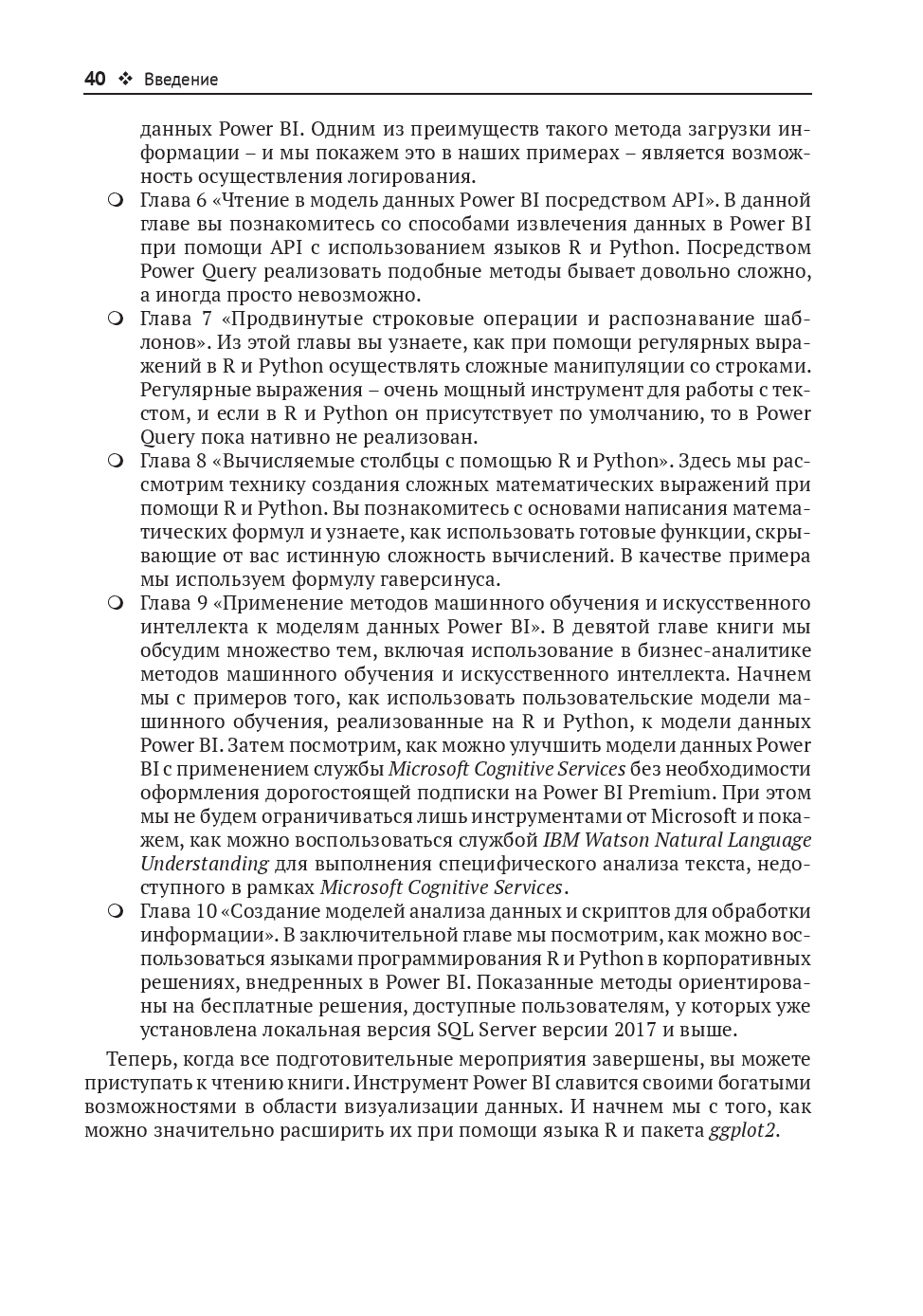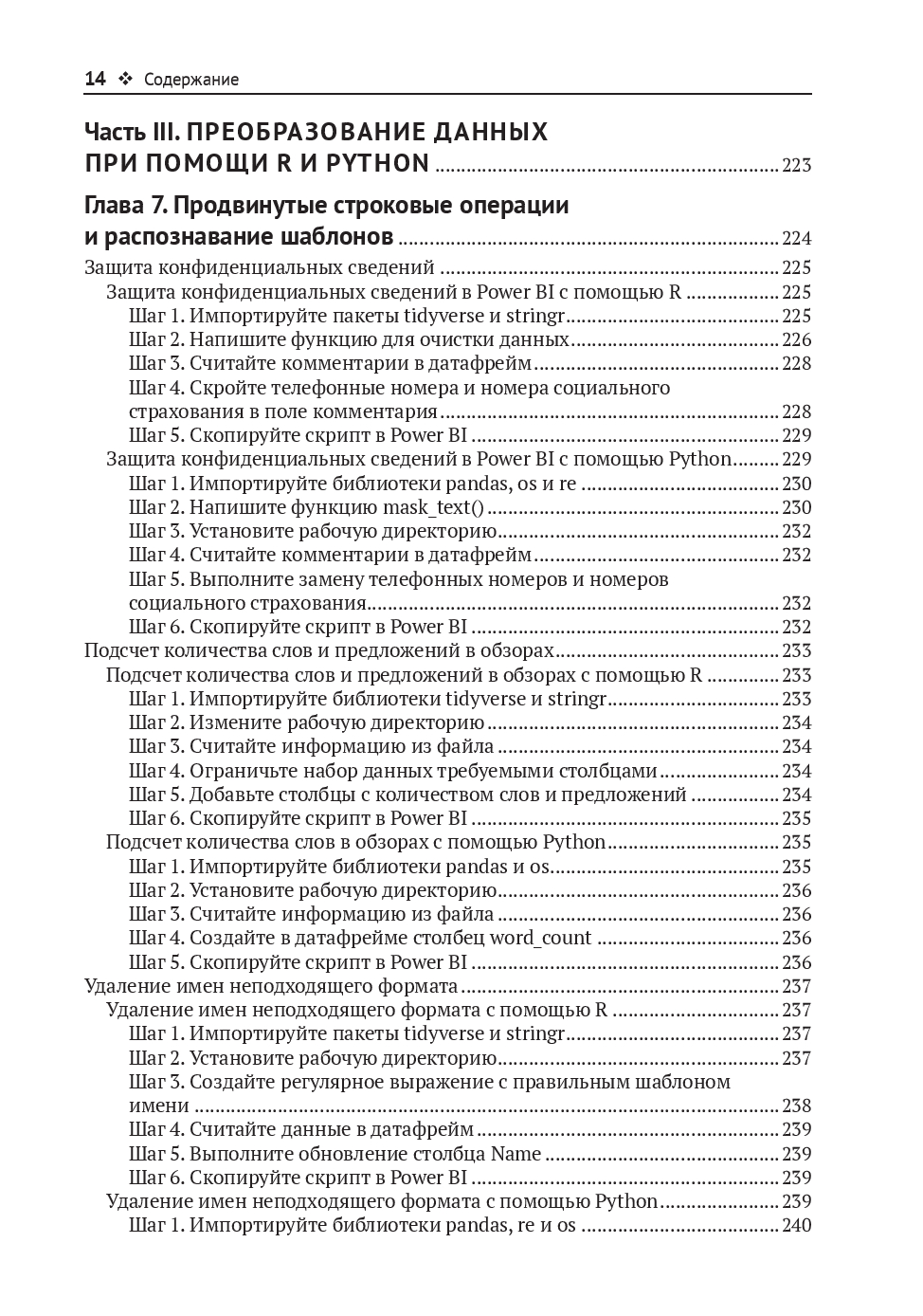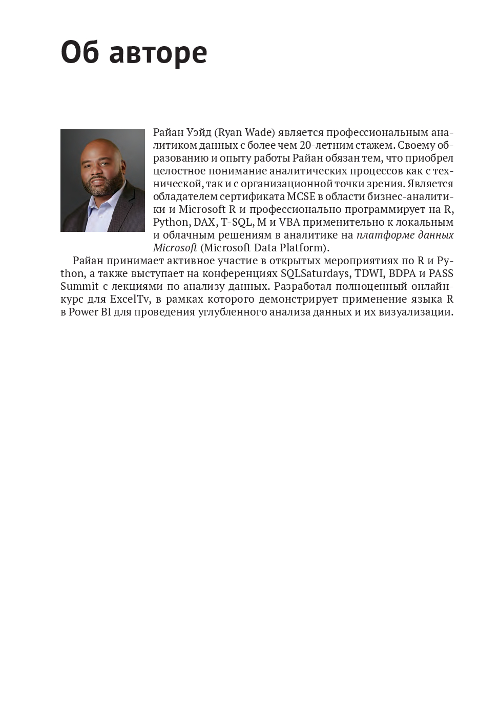 Данная книга поможет вам научиться использовать языки программирования R и Python в аналитике совместно с Microsoft Power BI. Эксперт в области анализа данных и автор книги Райан Уэйд продемонстрирует на примерах, как можно легко и просто применить R и Python там, где стандартных средств Power BI просто недостаточно. Помимо прочего, вы научитесь анализировать данные в Power BI с применением пользовательских моделей машинного обучения и мощных моделей из состава службы Microsoft Cognitive Services.