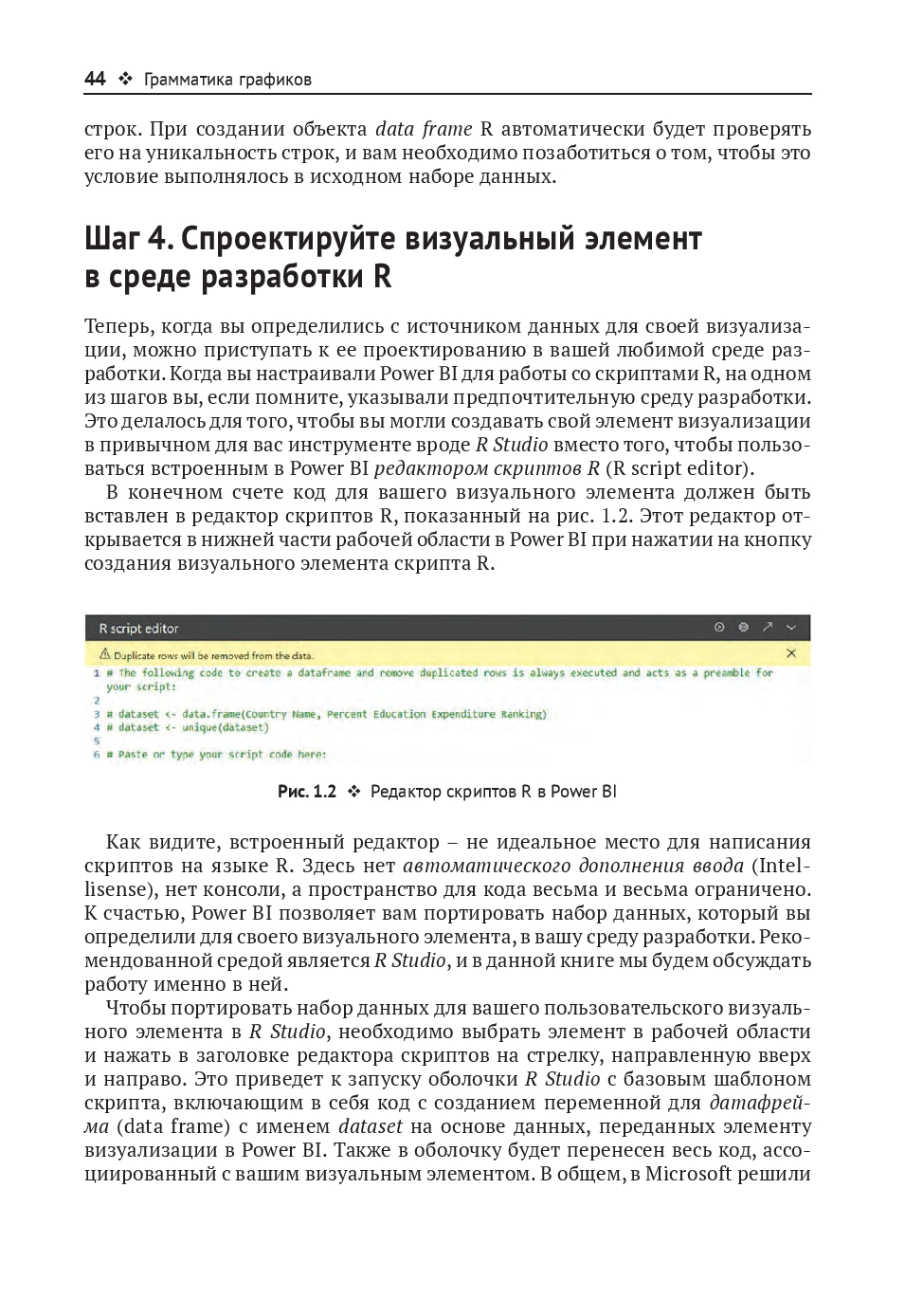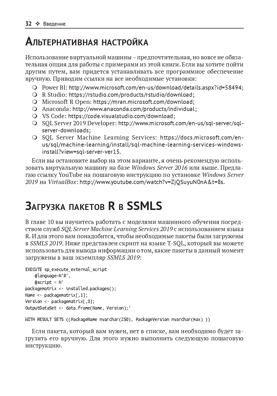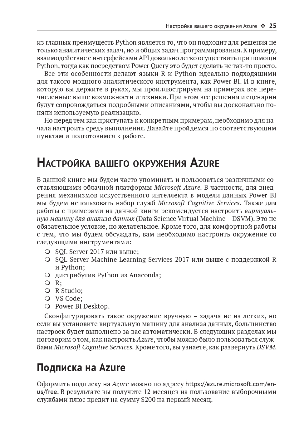 Данная книга поможет вам научиться использовать языки программирования R и Python в аналитике совместно с Microsoft Power BI. Эксперт в области анализа данных и автор книги Райан Уэйд продемонстрирует на примерах, как можно легко и просто применить R и Python там, где стандартных средств Power BI просто недостаточно. Помимо прочего, вы научитесь анализировать данные в Power BI с применением пользовательских моделей машинного обучения и мощных моделей из состава службы Microsoft Cognitive Services.
