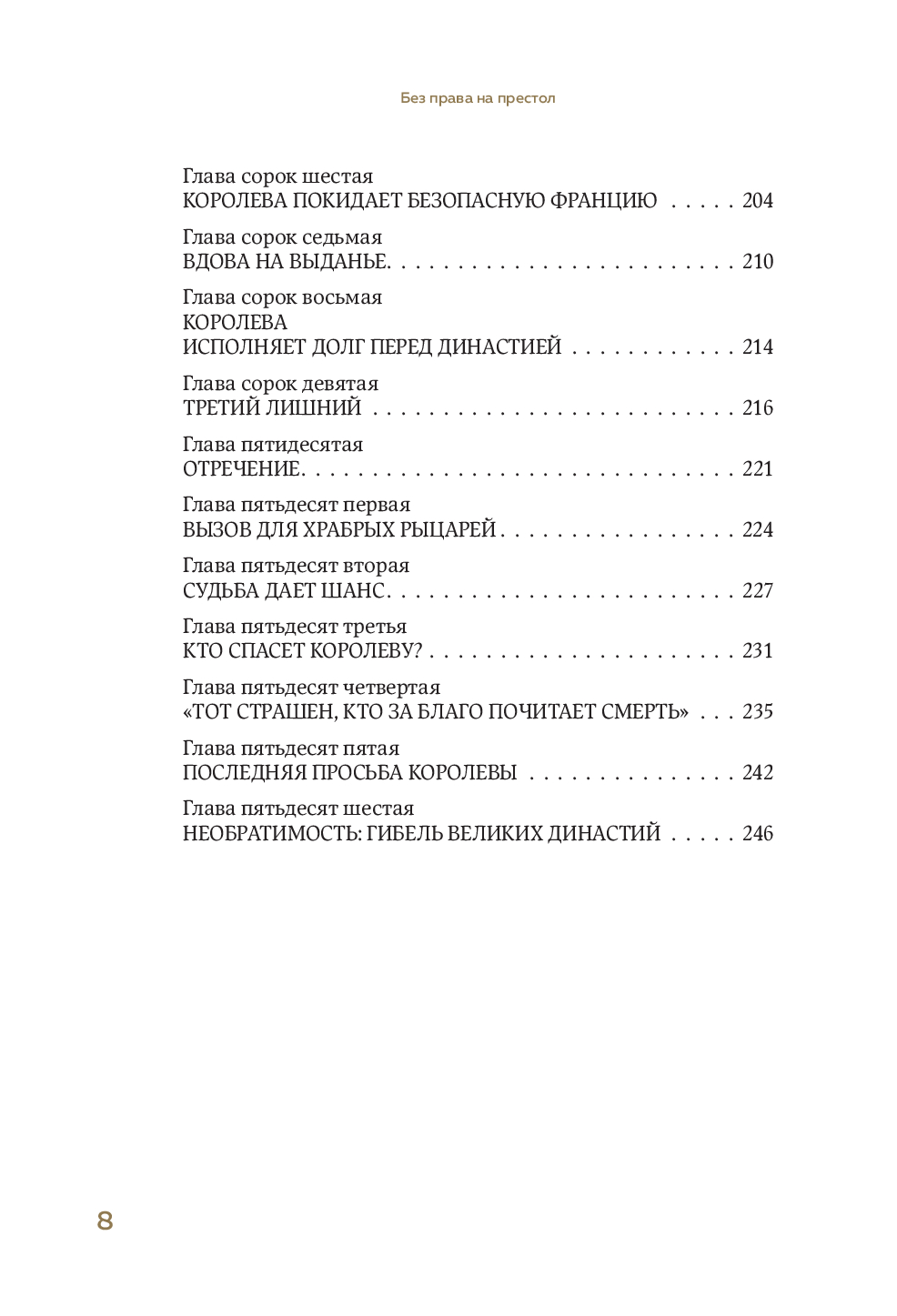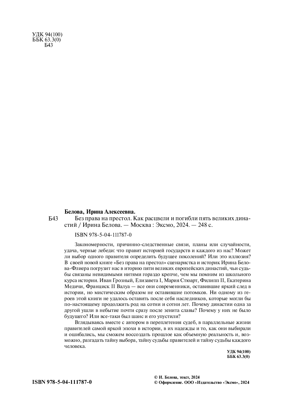 Закономерности, причинно-следственные связи, планы или случайности, удача, черные лебеди: что правит историей государств и каждого из нас? Может ли выбор одного правителя определить будущее поколений? Или это иллюзия? В своей новой книге "Без права на престол" сценаристка и историк Ирина Белова-Флиера погрузит нас в иторию пяти великих европейских династий, чьи судьбы связаны невидимыми нитями гораздо крепче, чем мы помним из школьного курса истории. Иван Грозный, Елизавета I, Мария Стюарт, Филипп II, Екатерина Медичи, Франциск II Валуа – все они современники, оставившие яркий след в истории, но мистическим образом не оставившие потомков. Ни одному из героев этой книги не удалось оставить по-сле себя наследников, которые могли бы по-настоящему продолжить род на сотни и сотни лет. Почему династии одна за другой ушли в небытие почти сразу после зенита славы? Почему у них не было будущего? Или все‑таки был шанс и его упустили?