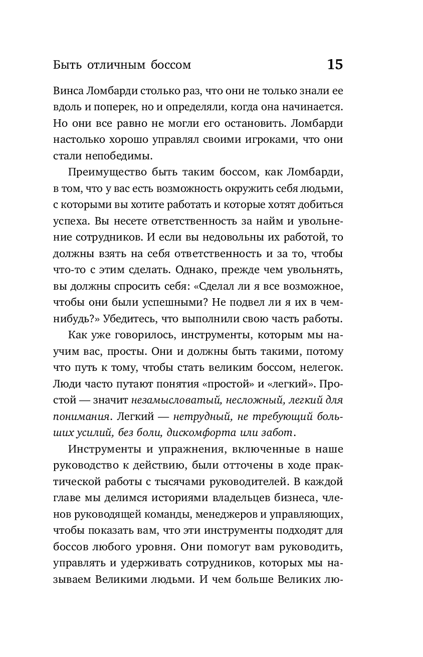 "Действительно полезная книга для каждого, кто хочет совершенствовать свои навыки руководителя. Это не просто практический гид, а целый запас полезных советов по ключевым управленческим вопросам. А главное, нет ни капли лишней информации, читается на одном дыхании". – Павел Сивожелезов, эксперт по управленческому мастерству, гендиректор консалтинга "Второй пилот", автор книги "Мягкий босс – жесткий босс"
