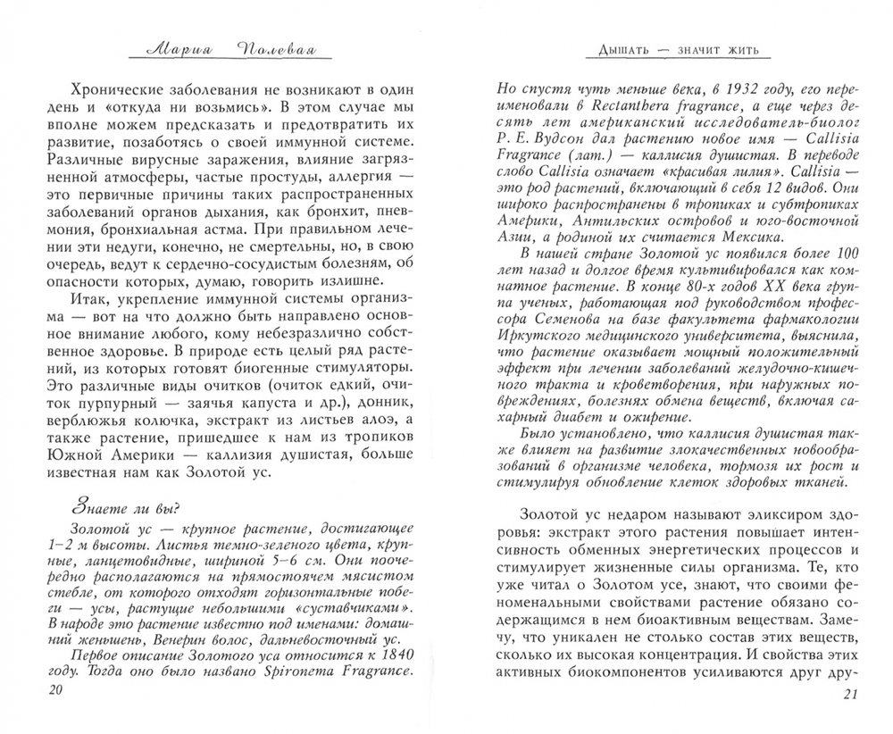 На страницах читатель найдёт ответы на многие болезненные (в самом прямом смысле!) вопросы. Как развиваются болезни органов дыхания? Существуют ли группы риска среди населения? Как предупредить нарушения в дыхательной системе? Каким образом золотой ус помогает бороться с такими недугами, как бронхит, астма и другими? Какие препараты являются наиболее эффективными в сочетании с уникальными свойствами этого растения?