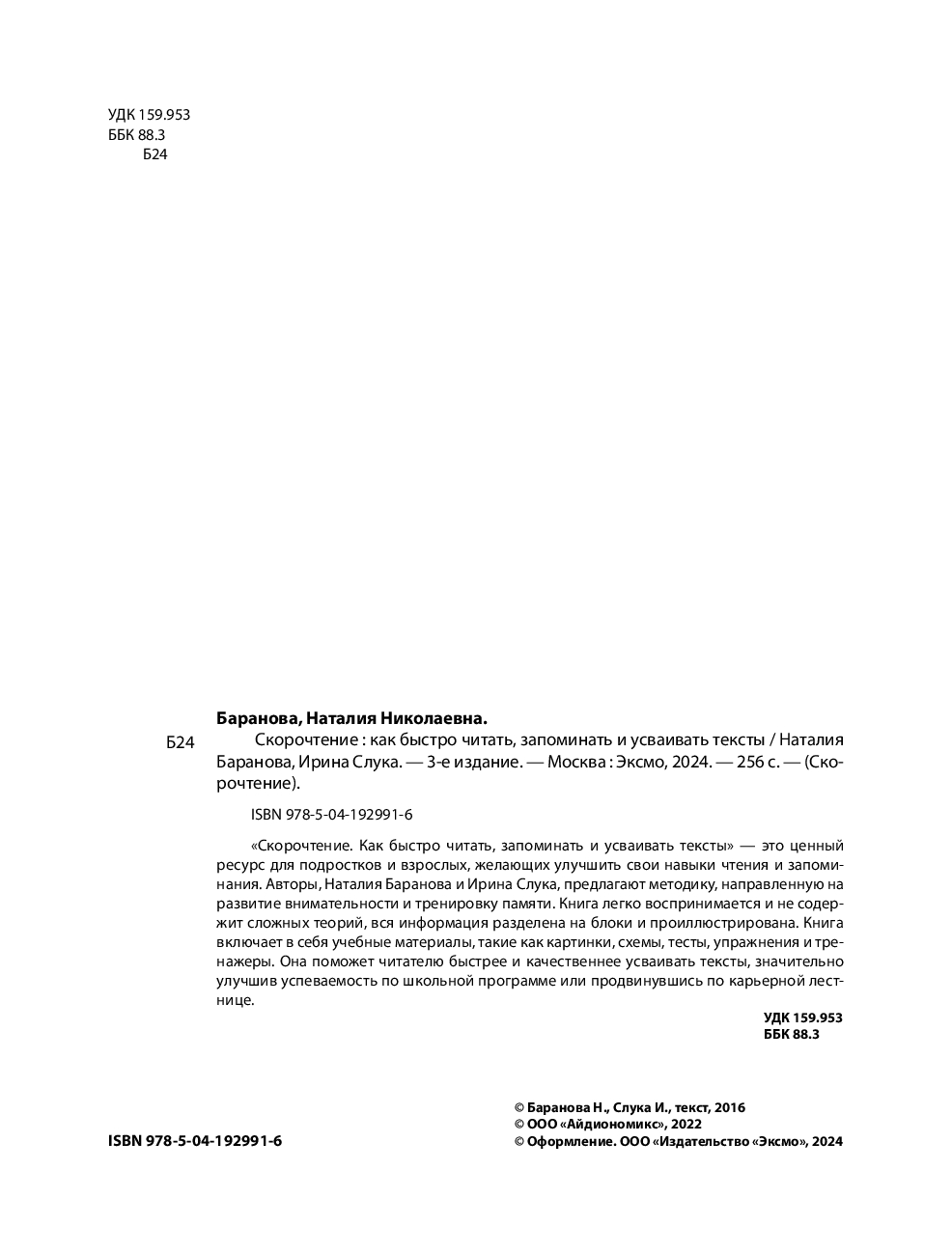 "Скорочтение. Как быстро читать, запоминать и усваивать тексты" – это ценный ресурс для подростков и взрослых, желающих улучшить свои навыки чтения и запоминания. Авторы, Наталия Баранова и Ирина Слука, предлагают методику, направленную на развитие внимательности и тренировку памяти. Книга легко воспринимается и не содержит сложных теорий, вся информация разделена на блоки и проиллюстрирована. Книга включает в себя учебные материалы, такие как картинки, схемы, тесты, упражнения и тренажёры. Она поможет читателю быстрее и качественнее усваивать тексты, значительно улучшив успеваемость по школьной программе или продвинувшись по карьерной лестнице.