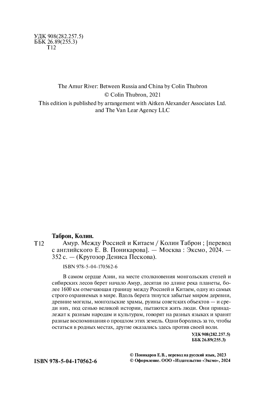 Колин Таброн, один из самых известных на Западе авторов книг о путешествиях, начинал свою более чем полувековую литературную карьеру именно с посещения Китая и СССР. "Река Амур" становится кульминацией его замечательной карьеры.
