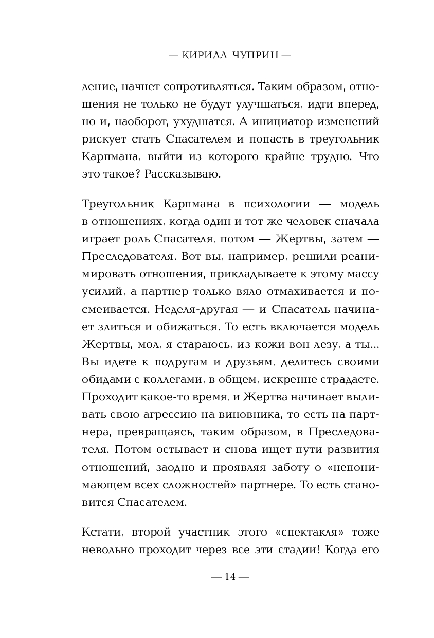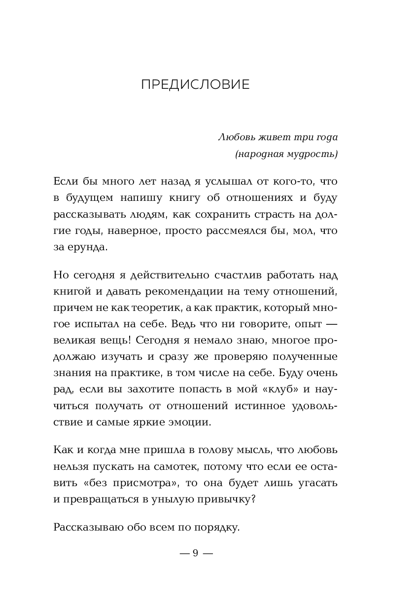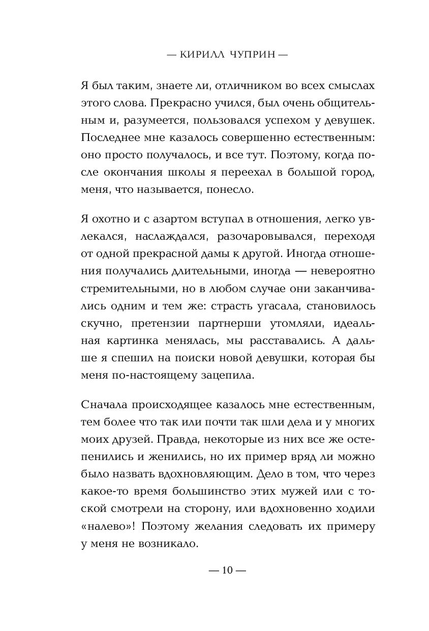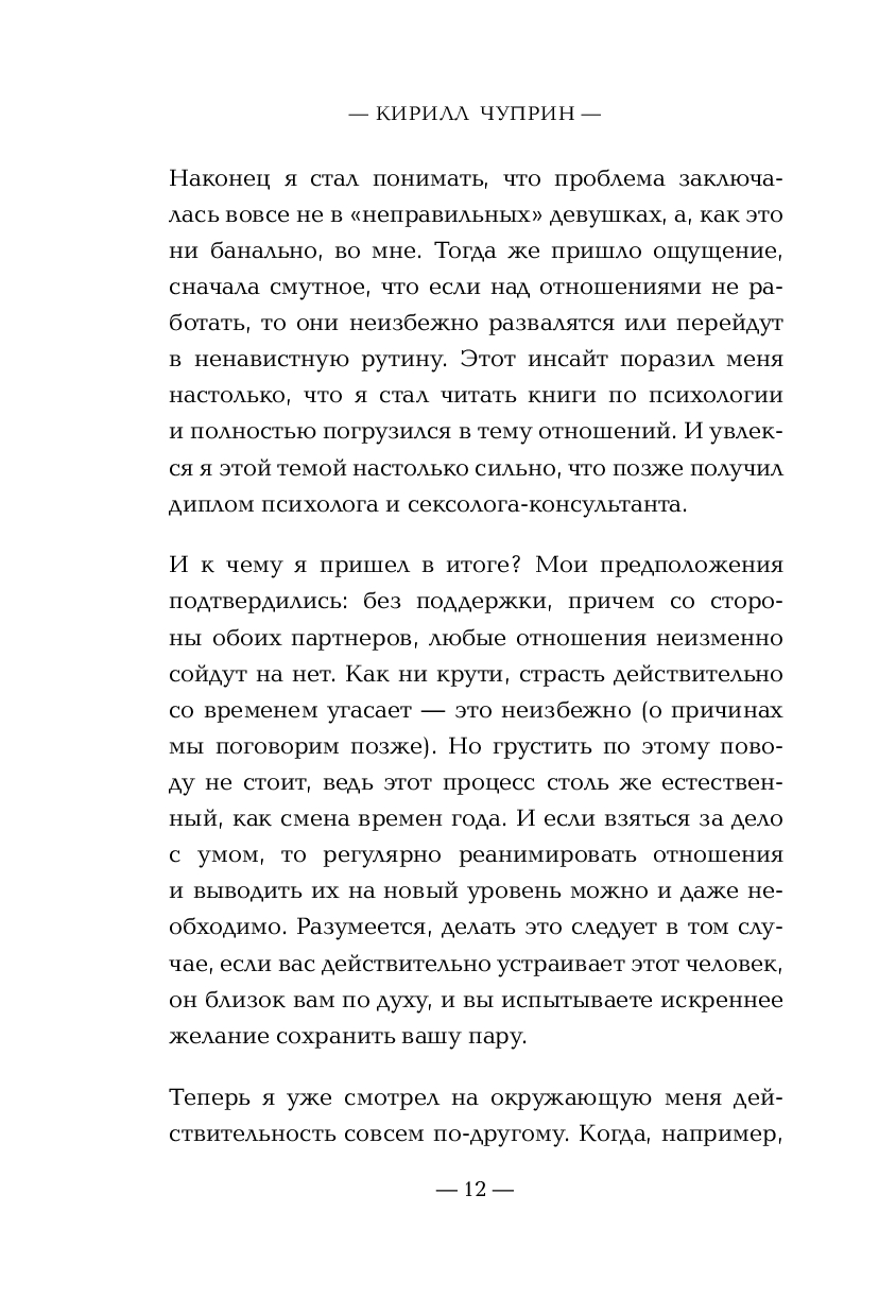 Любовь живет три года? Кирилл Чуприн, психолог, сексолог-консультант, автор популярного блога, не согласен с данным утверждением. Он раскрывает тайну счастливых отношений, подробно разбирая причины их увядания. Автор рассказывает об ошибках, убивающих страсть, и о том, как их не допустить. Эта книга поможет вам разобраться в себе и своих чувствах, а также в чувствах партнера, что значительно улучшит качество вашей жизни и поможет вернуть гармонию в отношения. Вы познакомитесь с практическими упражнениями, которые помогут лучше узнать партнера и наладить конструктивный диалог.