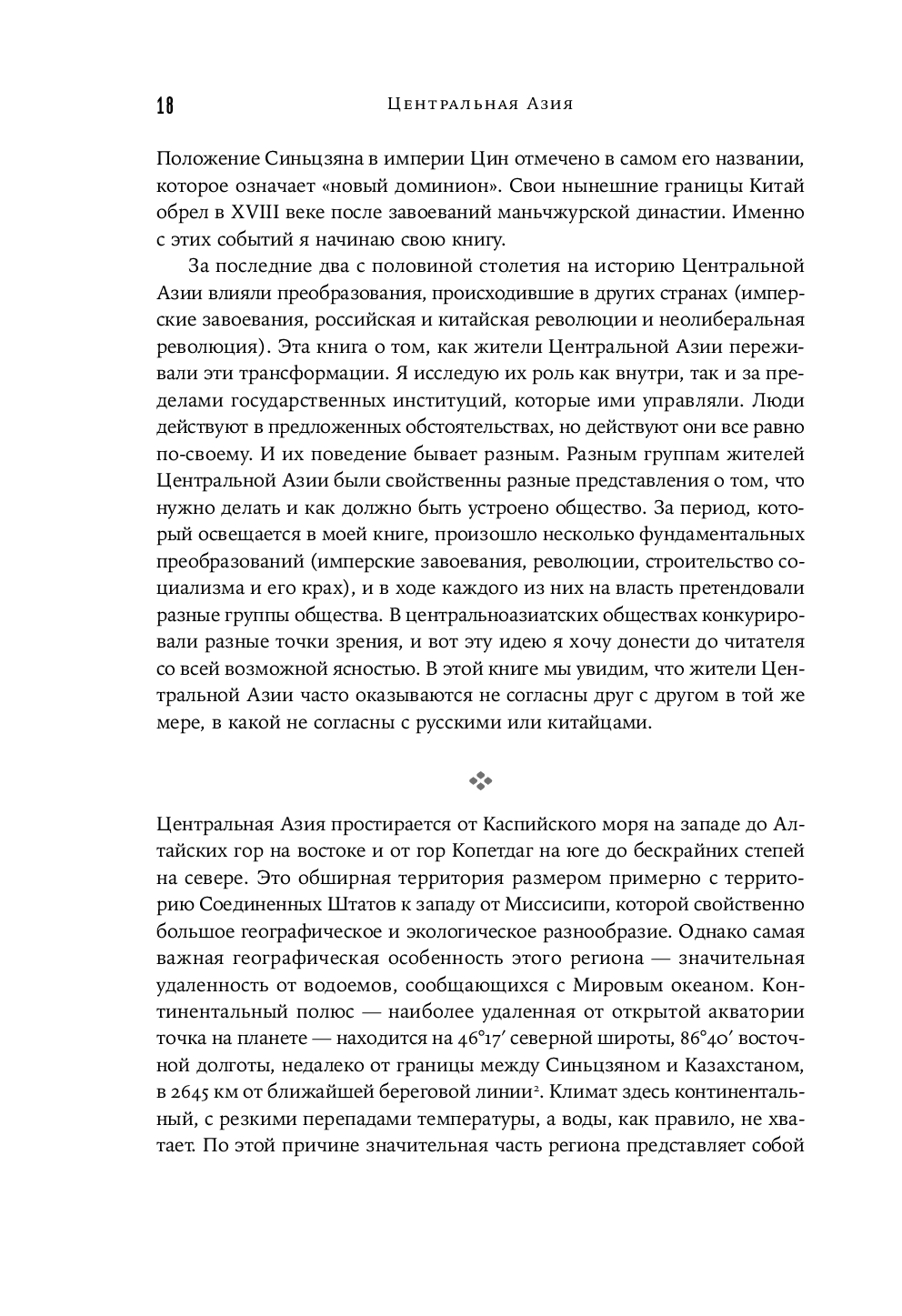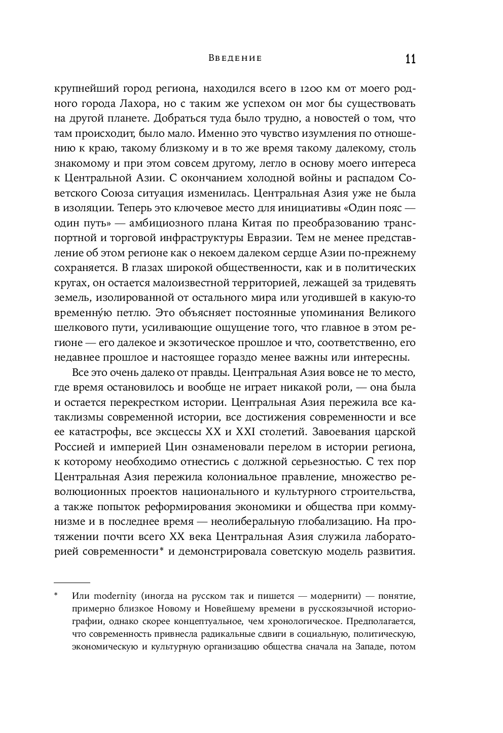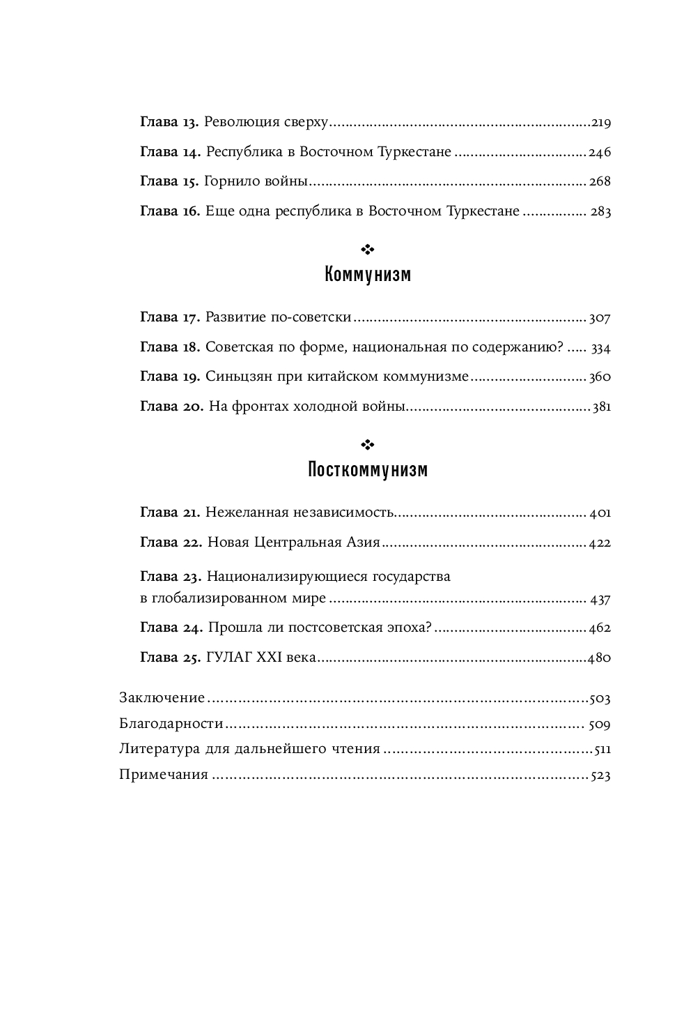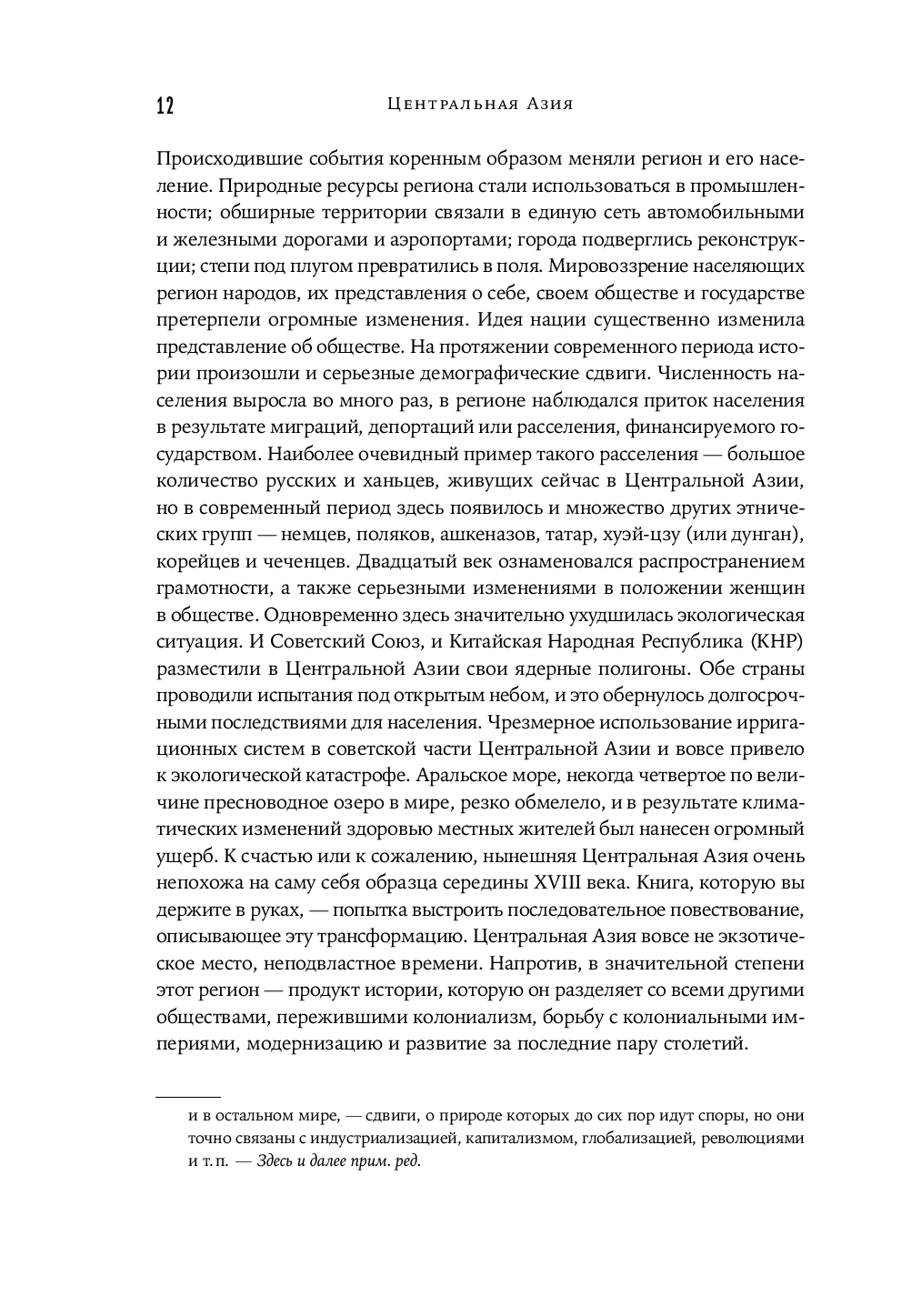 После 1700-х годов народы региона попали под власть России и Китая. Американский ученый-историк пакистанского происхождения, Халид показывает, как иностранное завоевание вовлекло жителей Центральной Азии в глобальный обмен товарами и идеями и привело к установлению более тесных связей с остальным миром. В фокусе его исследования и то, как империи-завоевательницы, а потом коммунистические государства СССР и КНР справлялись с этнической неоднородностью региона, с присущими ему национальными и культурными различиями, а также то, как исторические силы и тренды, от колониализма и социальных революций до национализма и государственной политики модернизации, сформировали современный облик Центральной Азии.