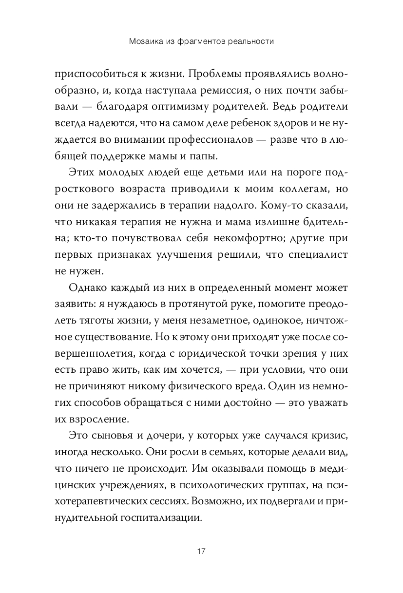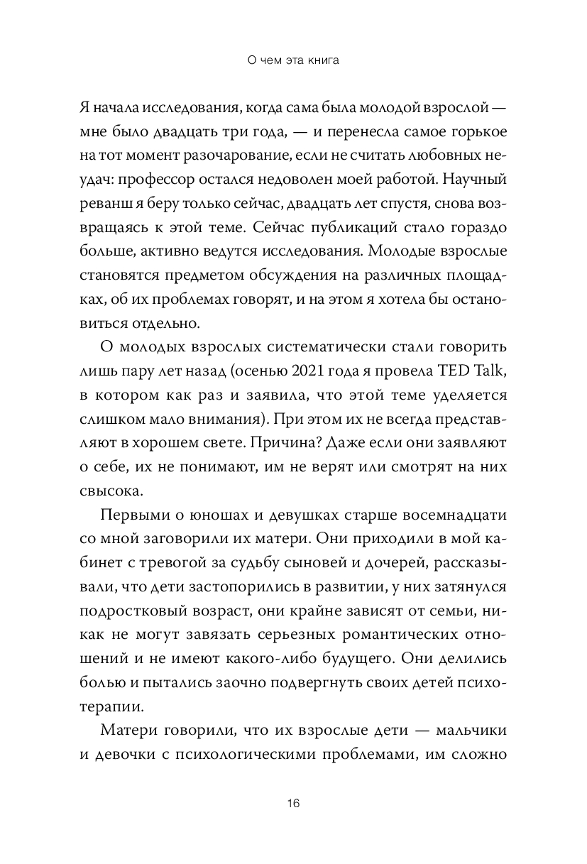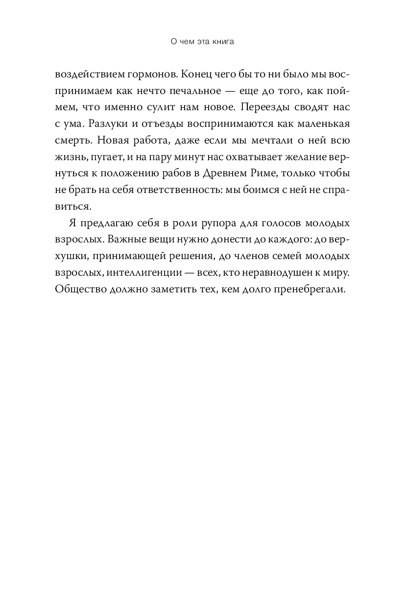Под обложкой – тема сепарации и психологического взросления. Популярный итальянский психотерапевт Стефания Андреоли разбирает типичные проблемы молодых взрослых: тревогу, конфликты со старшим поколением, поиск своего собственного места в жизни, трудности профессионального развития и романтических отношений.