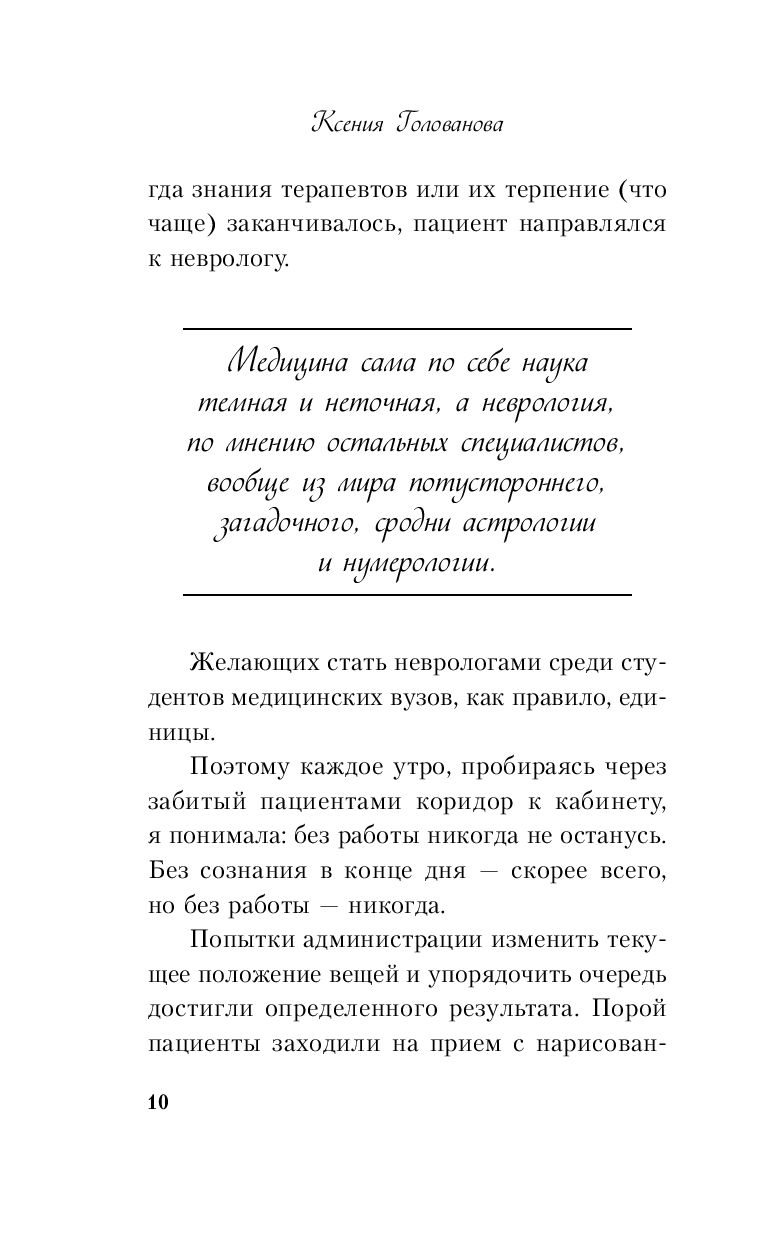 Вы не поверите, как много необычных историй из практики может рассказать врач: колдуны, похищенные трупы, буйные пациенты и рассыпавшиеся скелеты. Когда Ксения Голованова, врач-невролог, окончила интернатуру и отправилась работать врачом в провинциальный город N, вряд ли она представляла, с какими удивительными людьми сведет ее судьба, и на сколько изобретательной ей придется быть. К такому жизнь не готовит, а уж фундаментальное академическое образование в университете тем более.