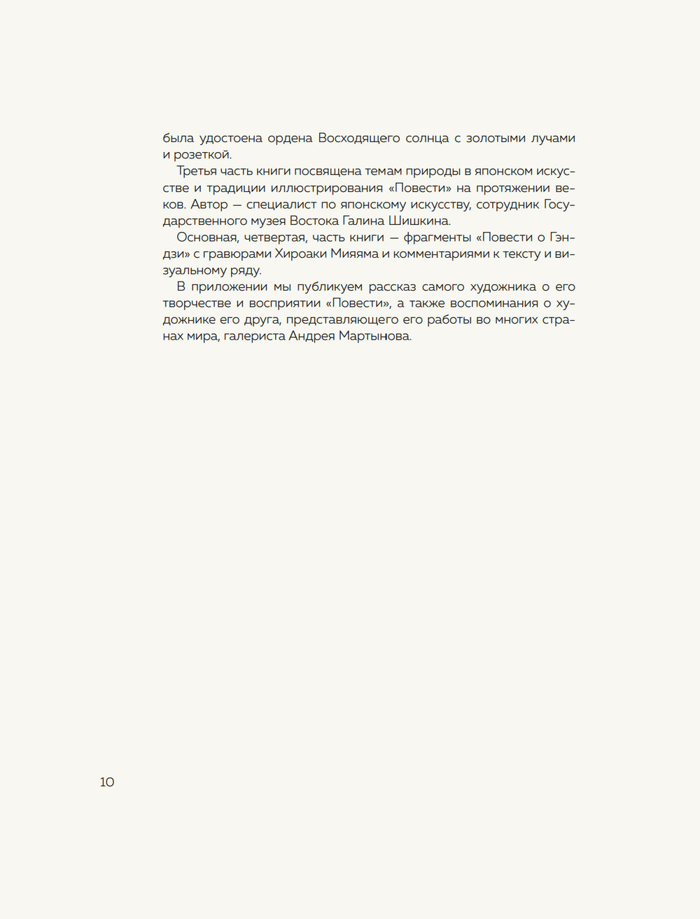 Герои "Повести о Гэндзи" любят, страдают, слагают стихи, и это удивительным образом запечатлел современный японский художник Хироаки Мияяма. Его уникальные гравюры к бессмертной "Повести о Гэндзи" – подлинное наслаждение для ценителей.