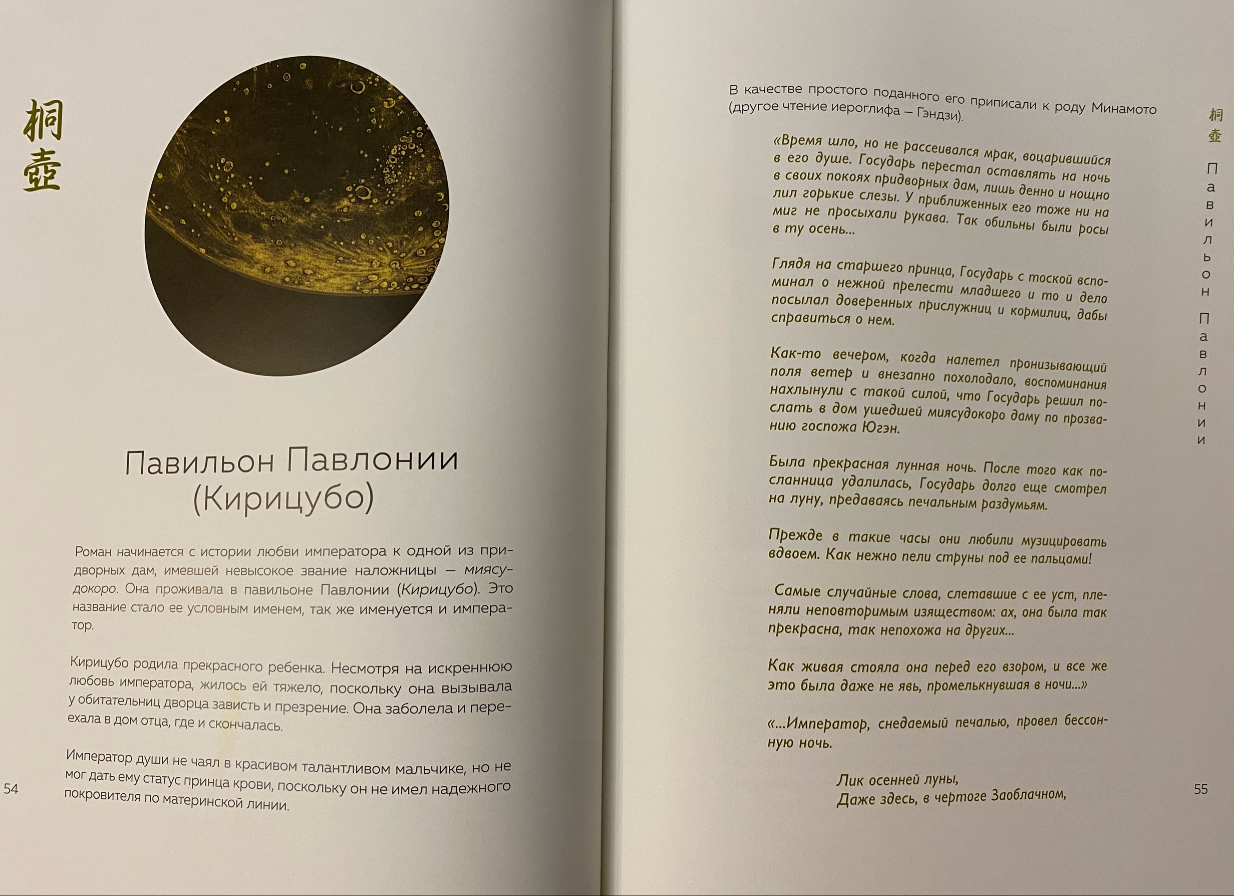 Поэтичная, завораживающая "Повесть о Гэндзи" написана в самом начале XI века в Японии. Принц Гэндзи влюбляется, встречается с друзьями, взрослеет и вот уже его дети ведут беседы о любви и складывают стихи. Удивительный мир японского общества и природы описан, скорее всего, придворной дамой по имени Мурасаки Сикибу. Благодаря своей наблюдательности и таланту, вращаясь в высшем обществе Японии, она сохранила для нас моду, праздники и обычаи эпохи Хэйан; запечатлела тонкости мировосприятия и взаимоотношений между людьми.