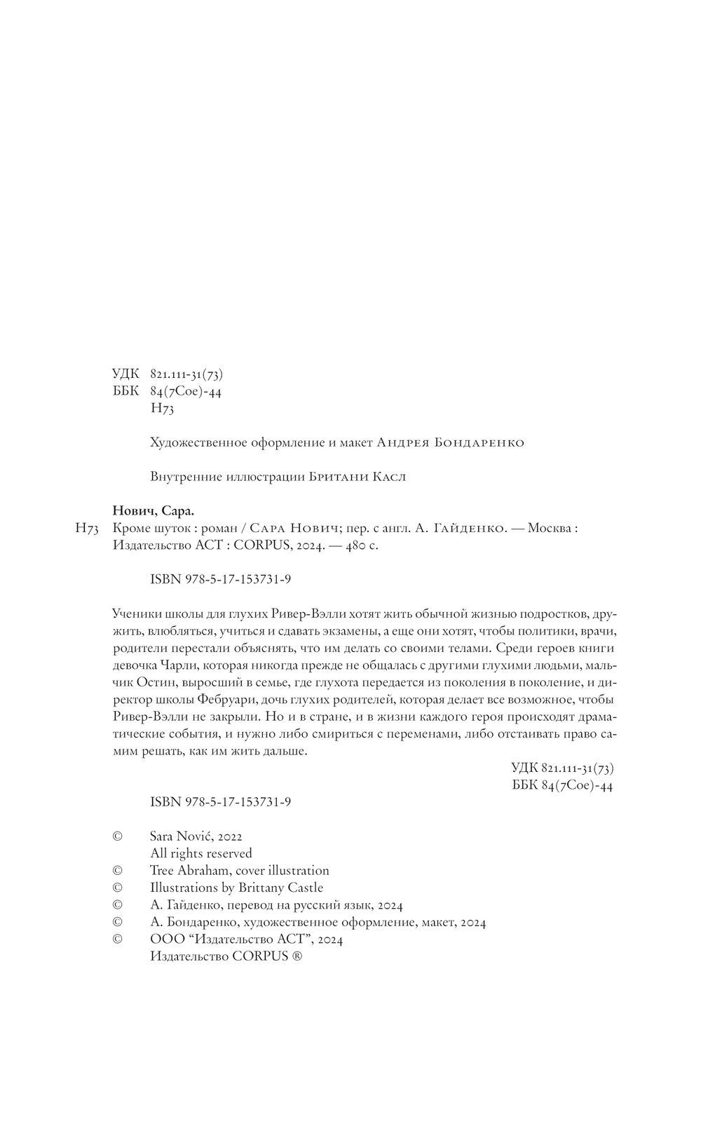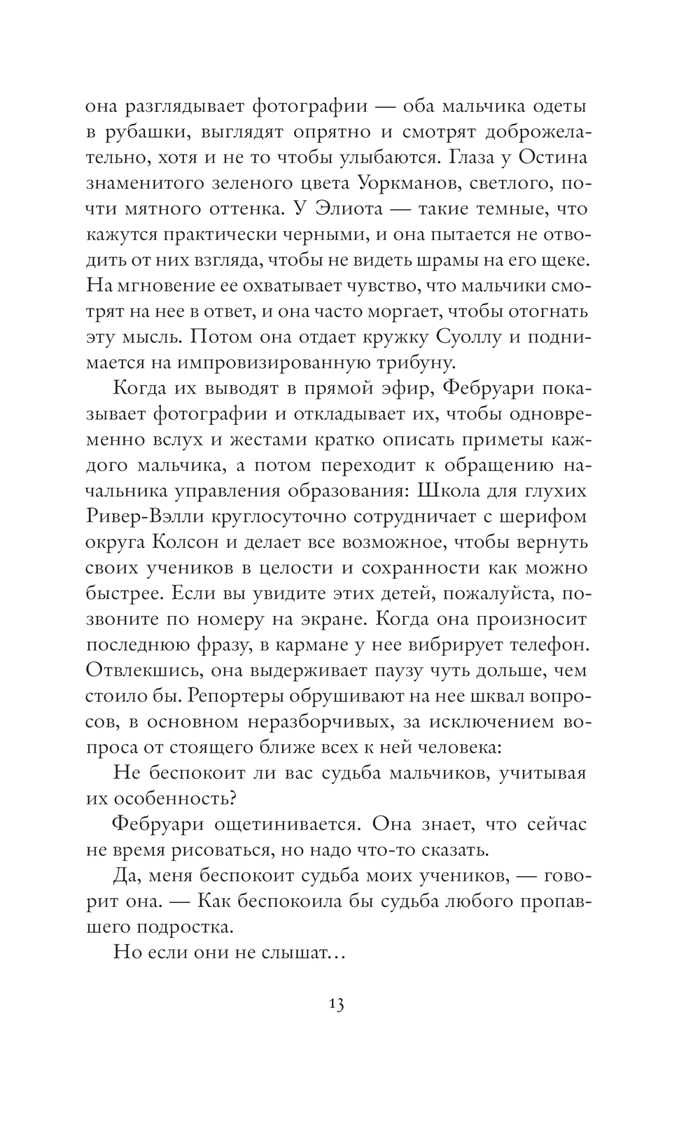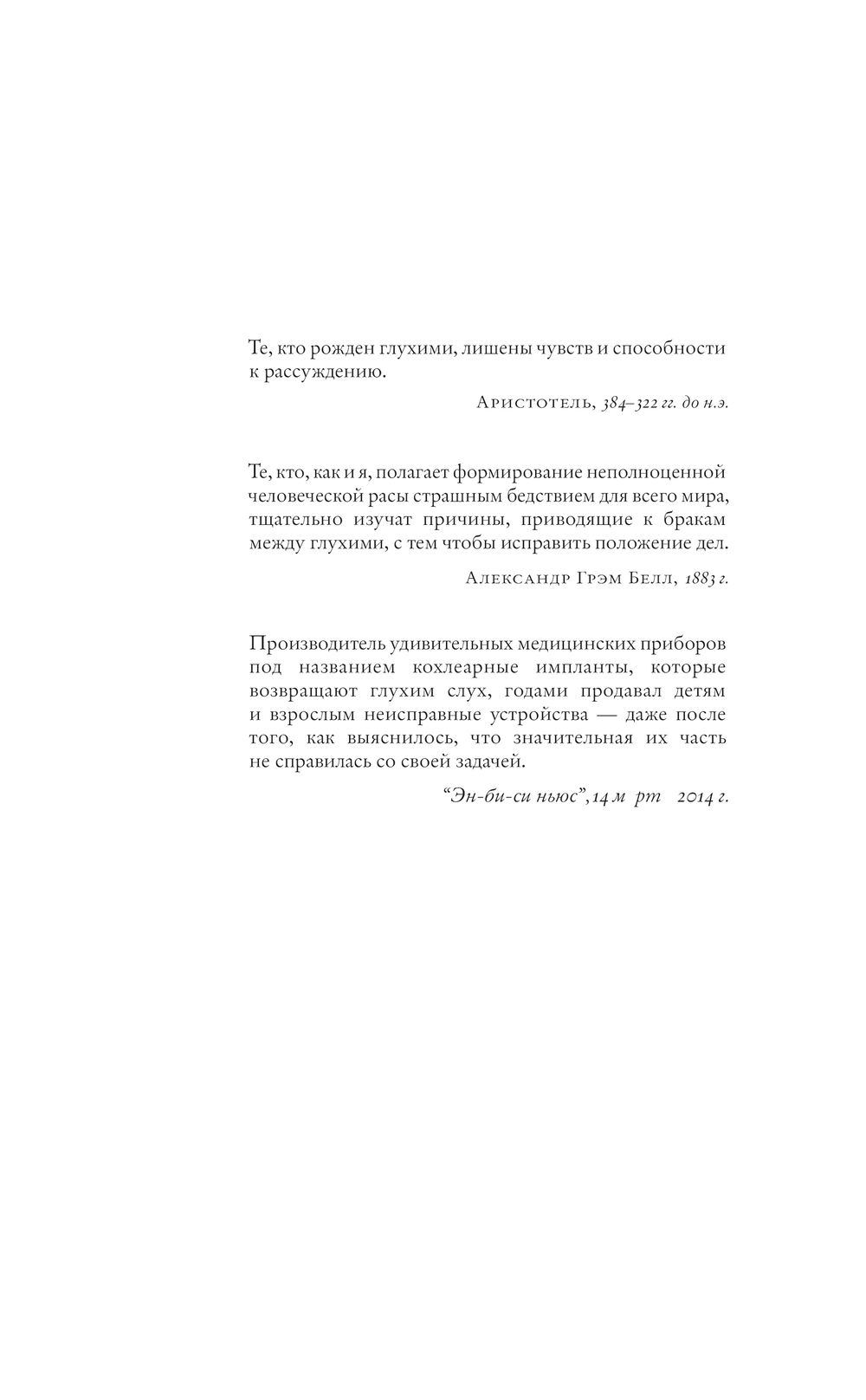 Ученики школы для глухих Ривер-Вэлли хотят жить обычной жизнью подростков, дружить, влюбляться, учиться и сдавать экзамены, а еще они хотят, чтобы политики, врачи, родители перестали объяснять, что им делать со своими телами. Среди героев книги девочка Чарли, которая никогда прежде не общалась с другими глухими людьми, мальчик Остин, выросший в семье, где глухота передается из поколения в поколение, и директор школы Фебруари, дочь глухих родителей, которая делает все возможное, чтобы Ривер-Вэлли не закрыли. Но и в стране, и в жизни каждого героя происходят драматические события, и нужно либо смириться с переменами, либо отстаивать право самим решать, как им жить дальше.