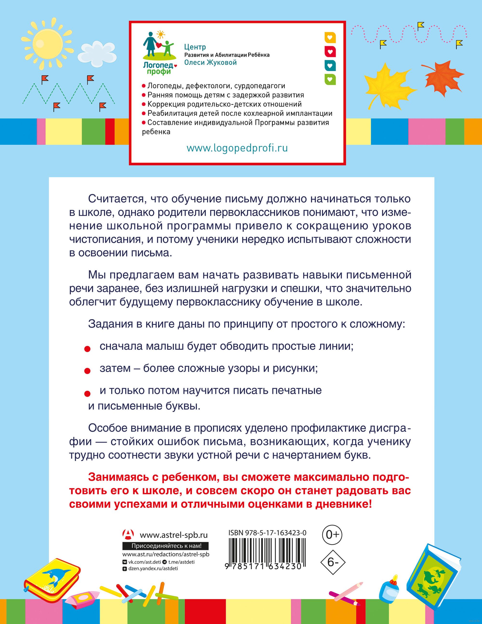 В этой книге вы найдете упражнения, которые помогут вашему ребенку овладеть навыками письма. Задания даны по принципу от простого к сложному: сначала малыш будет обводить простые линии, затем – более сложные узоры и рисунки и лишь в завершении курса перейдет к освоению письма: научится писать печатные и письменные буквы. Особое внимание в прописях уделено профилактике дисграфии – стойких ошибок письма, возникающих, когда ученику трудно соотнести звуки устной речи с начертанием букв.