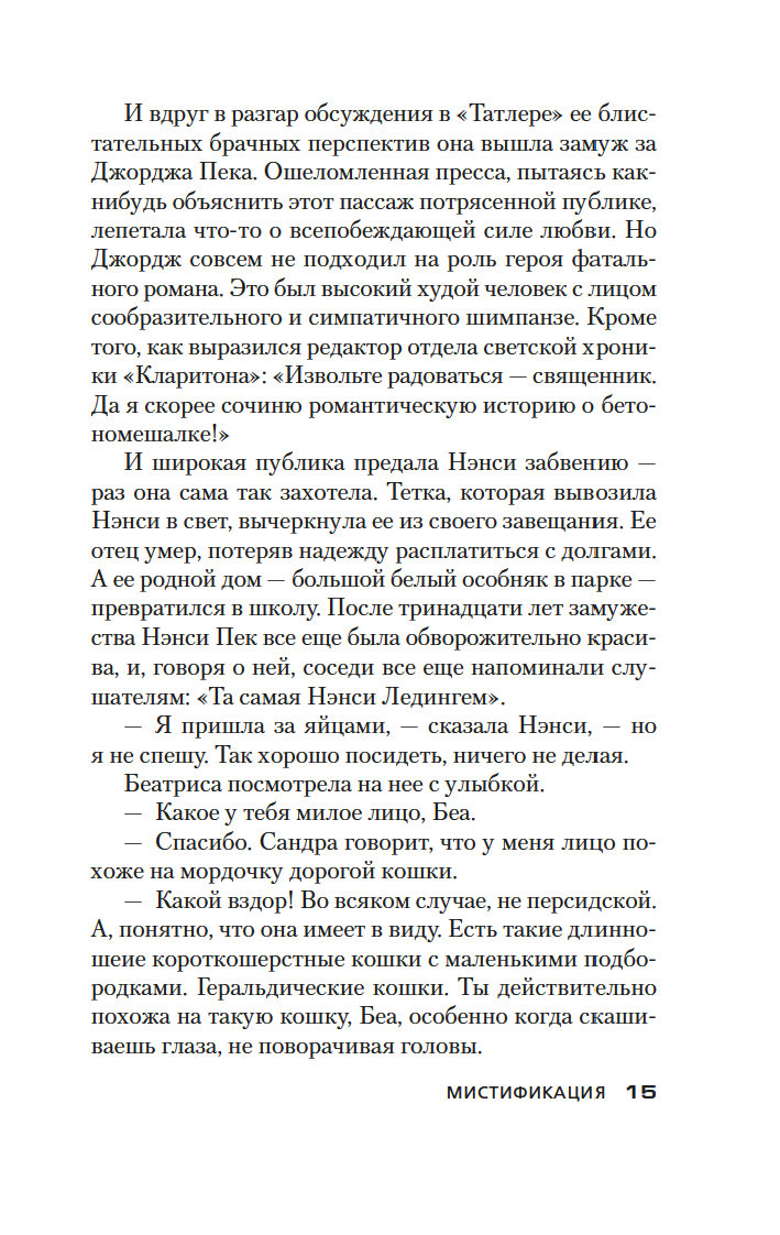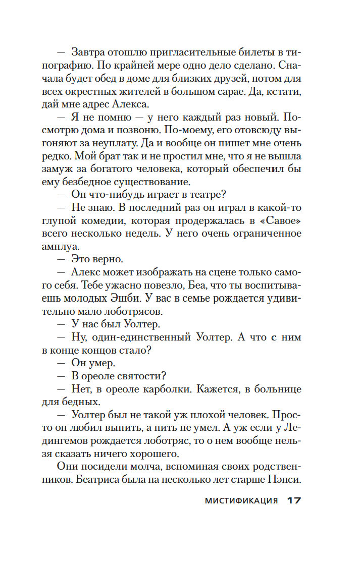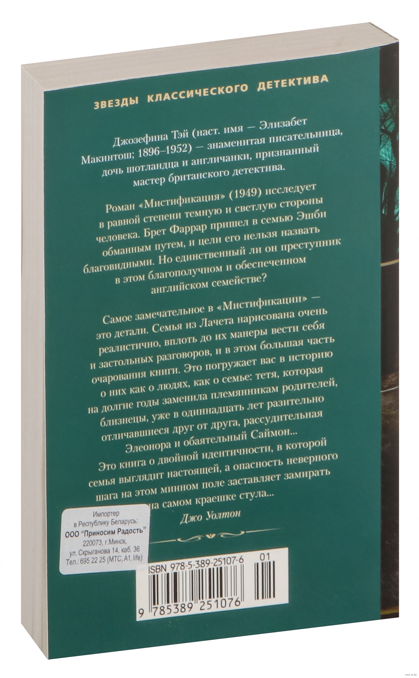 Роман "Мистификация" (1949) исследует в равной степени темную и светлую стороны человека. Брет Фаррар пришел в семью Эшби обманным путем, и цели его нельзя назвать благовидными. Но единственный ли он преступник в этом благополучном и обеспеченном английском семействе?