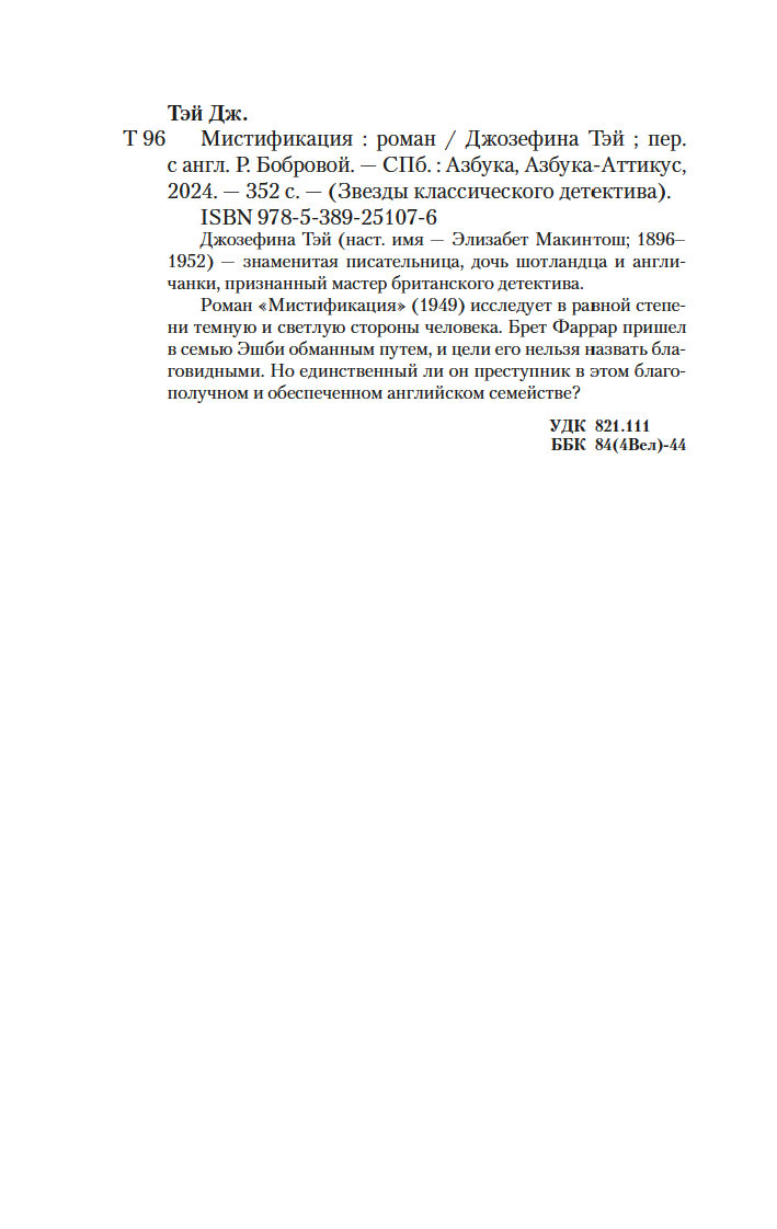 Джозефина Тэй (наст. имя – Элизабет Макинтош; 1896-1952) – знаменитая писательница, дочь шотландца и англичанки, признанный мастер британского детектива.