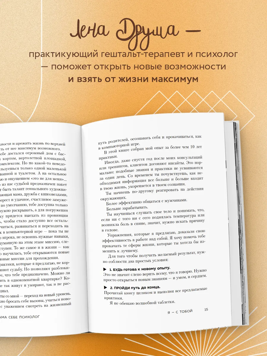 Лена Друма, практикующий гештальт-терапевт и психолог, приготовила авторские практики, психологические приемы, тесты. С этой книгой вы станете психологом, подругой и наставником для самой себя. Она поможет вам открыть новые возможности и взять от жизни максимум.