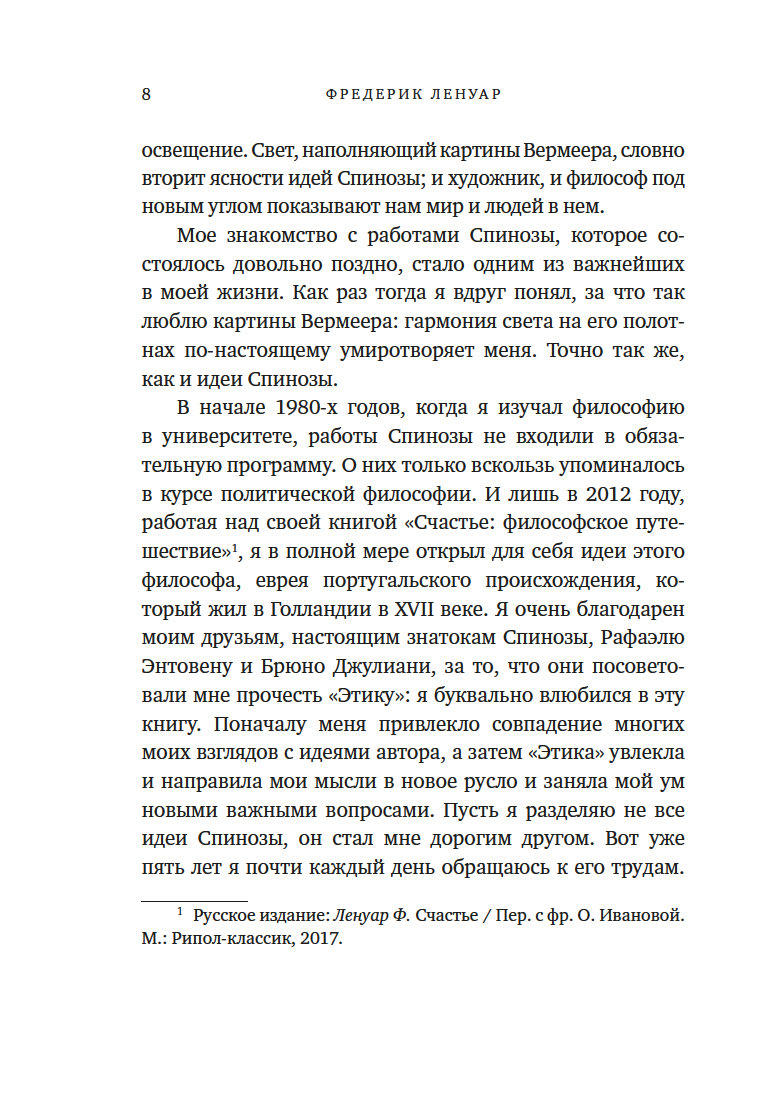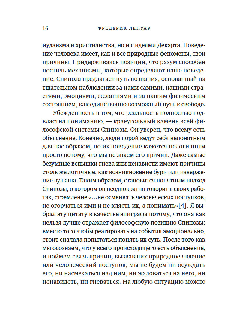 Книга маститого французского автора Фредерика Ленуара предлагает тонкий, блестящий анализ мировоззрения Спинозы, отраженного в его главной работе, "Этика" (1675), и других сочинениях, исследует факты биографии, повлиявшие на формирование его философской системы, и взаимосвязи с современниками. Также в книге приводится ценная переписка автора с Робером Мисраи, одним из крупнейших современных исследователей философского наследия Спинозы.