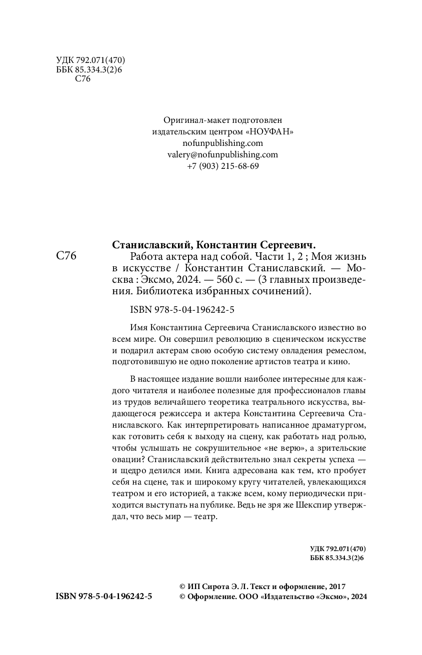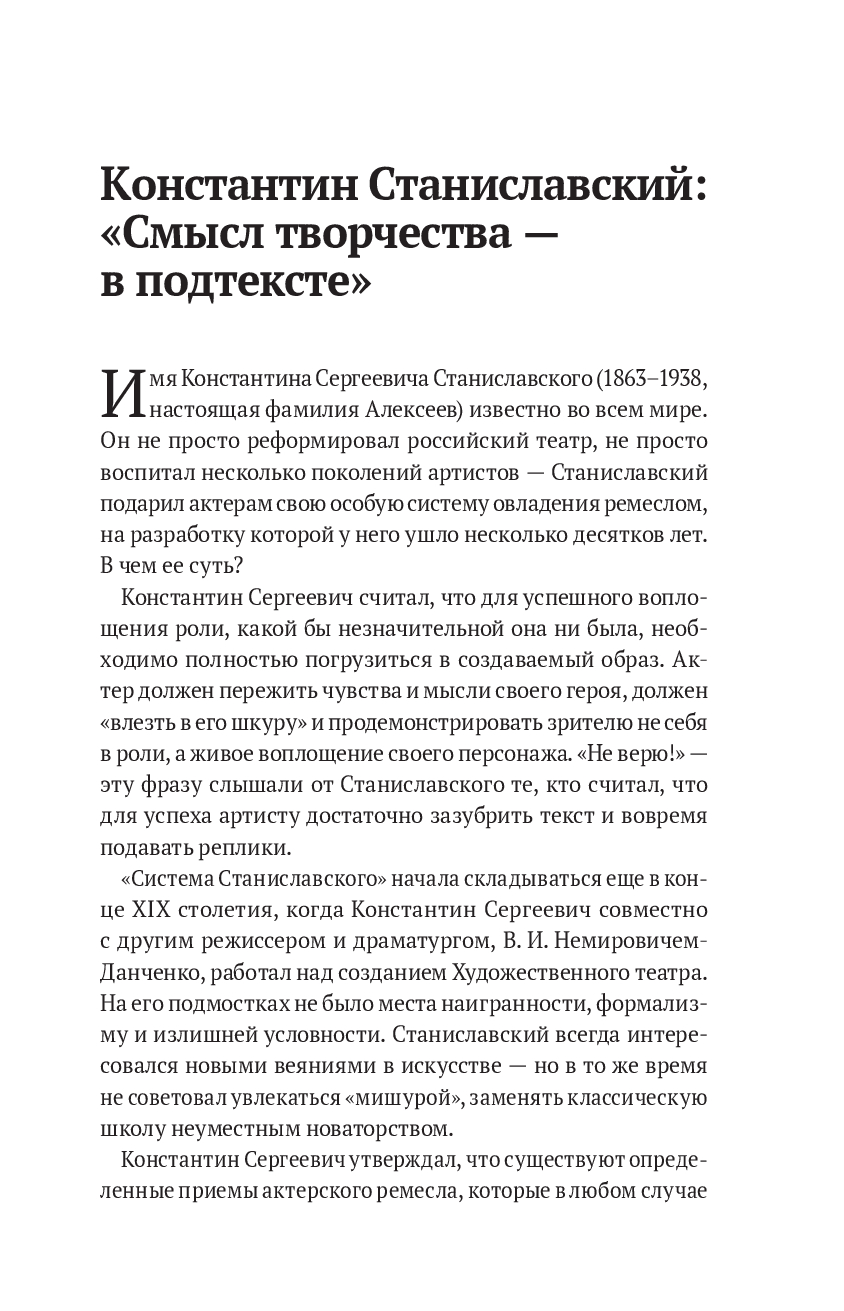 В настоящее издание вошли наиболее интересные для каждого читателя и наиболее полезные для профессионалов главы из трудов величайшего теоретика театрального искусства, выдающегося режиссера и актера Константина Сергеевича Станиславского. Как интерпретировать написанное драматургом, как готовить себя к выходу на сцену, как работать над ролью, чтобы услышать не сокрушительное "не верю", а зрительские овации? Станиславский действительно знал секреты успеха – и щедро делился ими. Книга адресована как тем, кто пробует себя на сцене, так и широкому кругу читателей, увлекающихся театром и его историей, а также всем, кому периодически приходится выступать на публике. Ведь не зря же Шекспир утверждал, что весь мир – театр.
