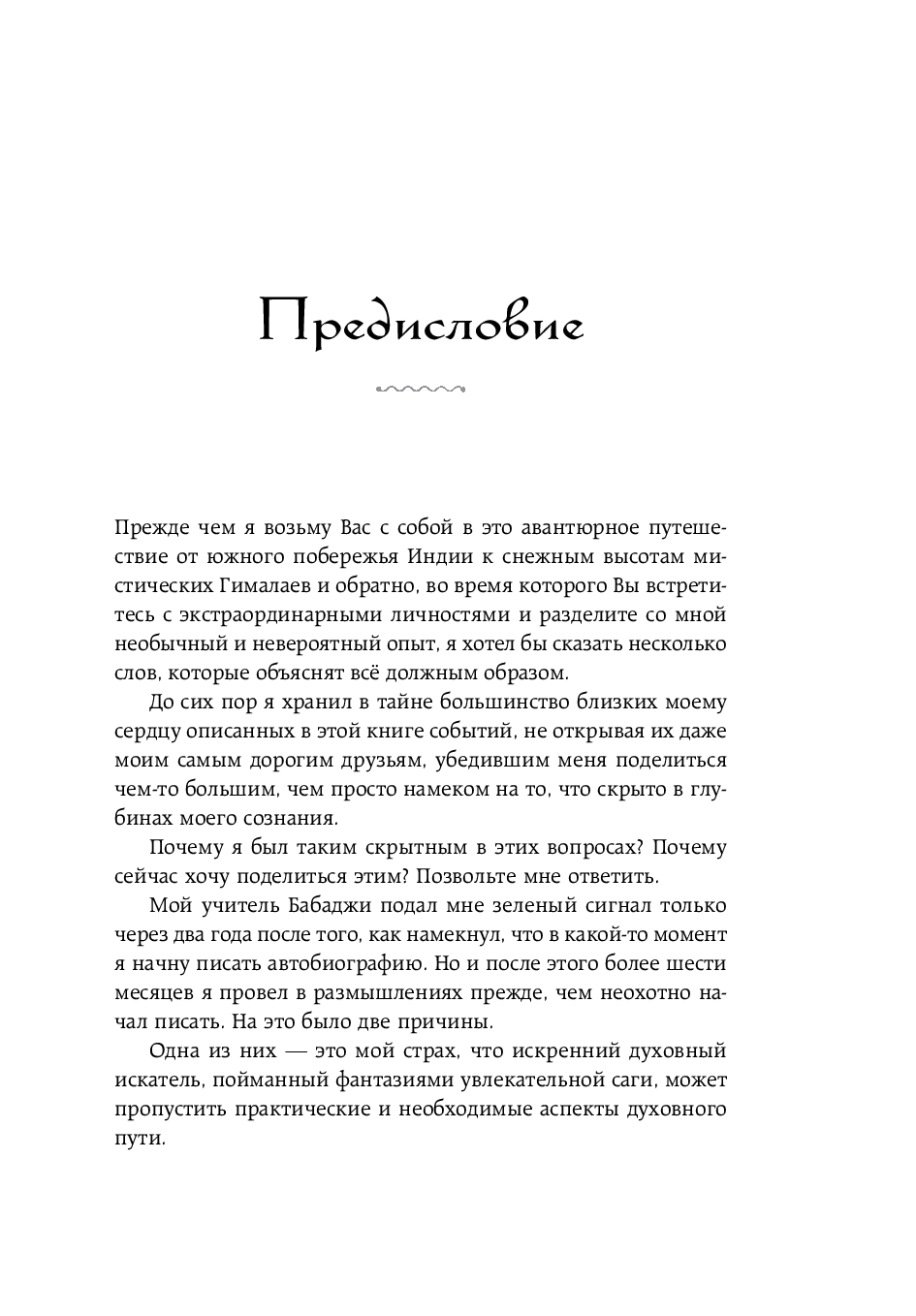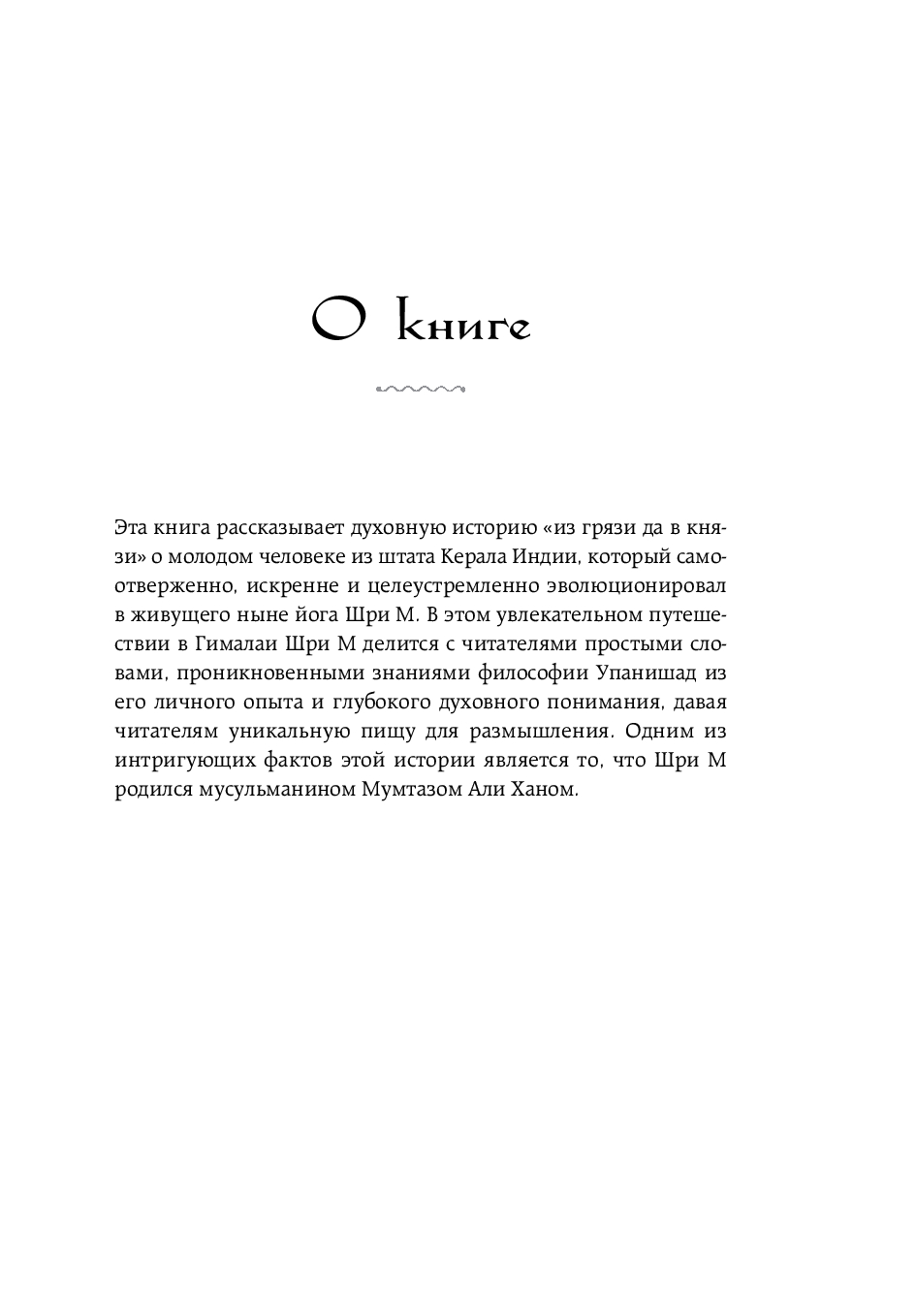 Эта книга рассказывает духовную историю "из грязи да в князи" о молодом человеке из индийского штата Керала, который самоотверженно, искренне и целеустремленно эволюционировал в ныне живущего йога Шри М. В этом увлекательном путешествии в Гималаи Шри М простыми словами делится с читателями проникновенными знаниями философии Упанишад, опираясь на личный опыт и глубокое духовное понимание, давая читателям уникальную пищу для размышления.