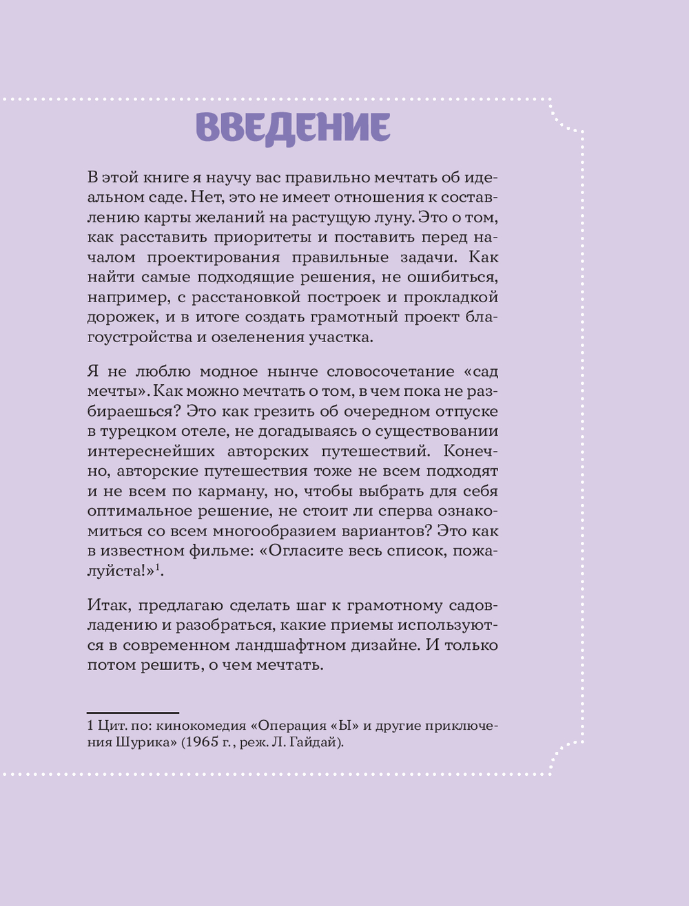 Первая часть книги посвящена стилистике сада и доступным дизайнерским решениям – от изящных дорожек до искусственных водоемов. Во второй части, после определения ваших желаний, автор учит создавать уникальный ландшафтный проект в соответствии с размерами и другими особенностями участка. Эта книга – не просто сборник идей, а пошаговое руководство, заботливо сопровождающее на пути к созданию сада вашей мечты.