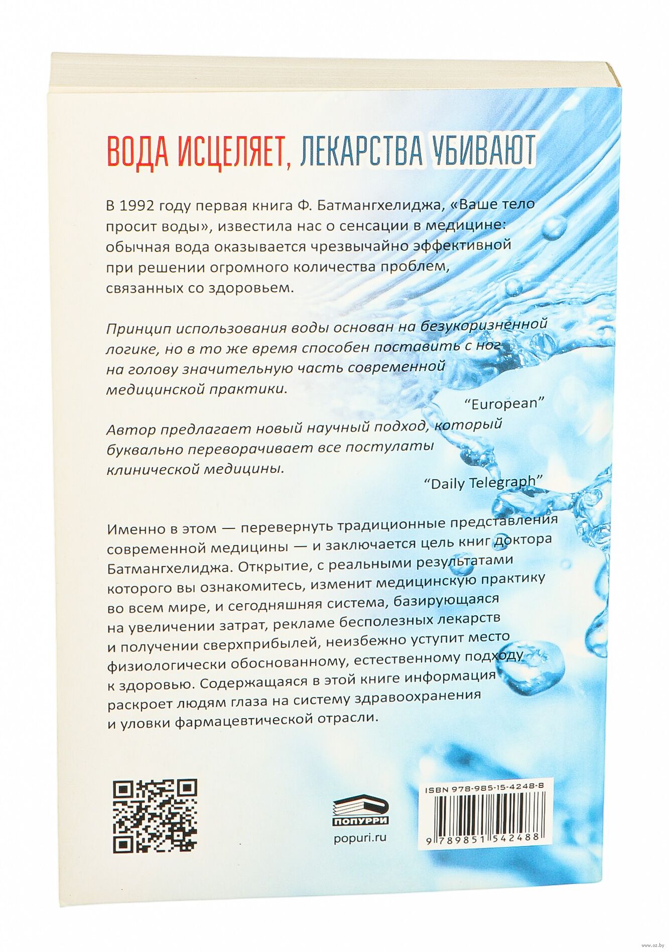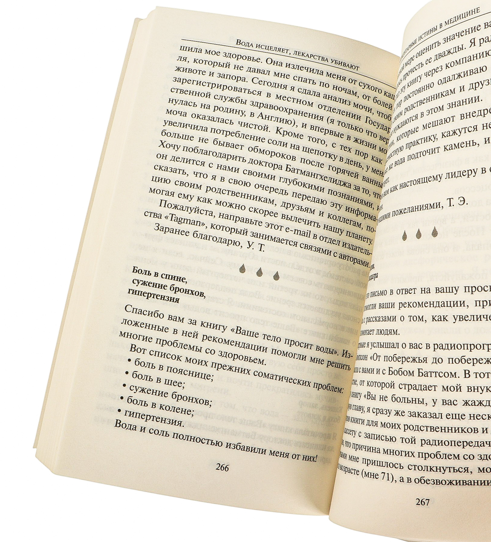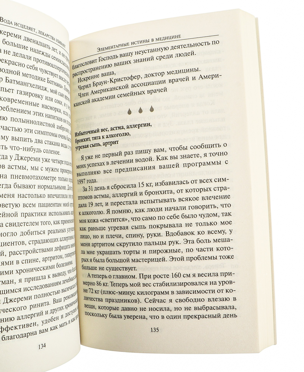 Вам больше не придётся ходить в аптеку и тратить сумасшедшие деньги на лекарства! Книга доктора Батмангхелиджа переворачивает традиционные представления современной медицины: оказывается, обычная вода невероятно эффективна при лечении и профилактике множества заболеваний. Откажитесь от ненужных лекарств и станьте здоровыми благодаря целебной силе воды!