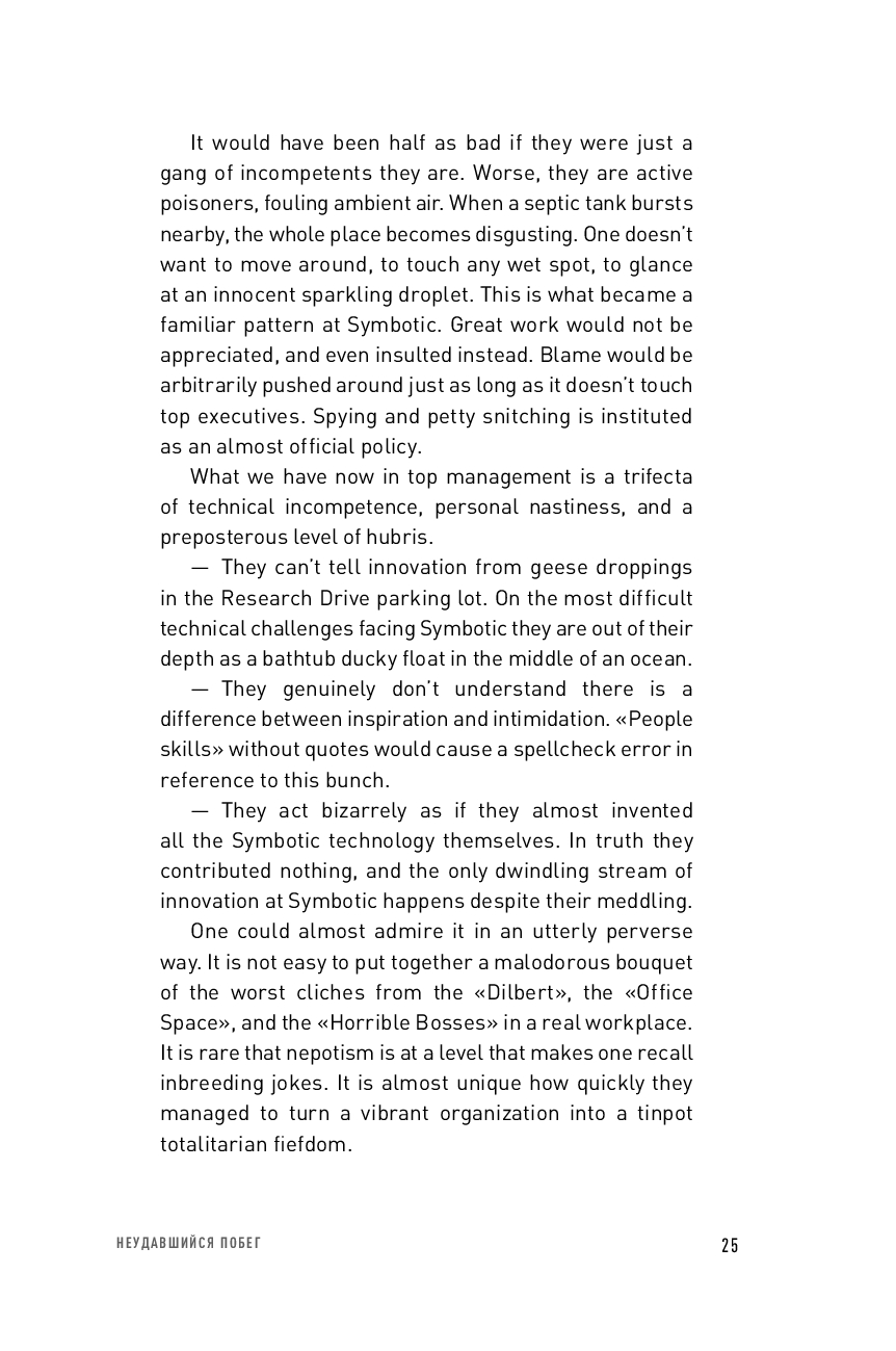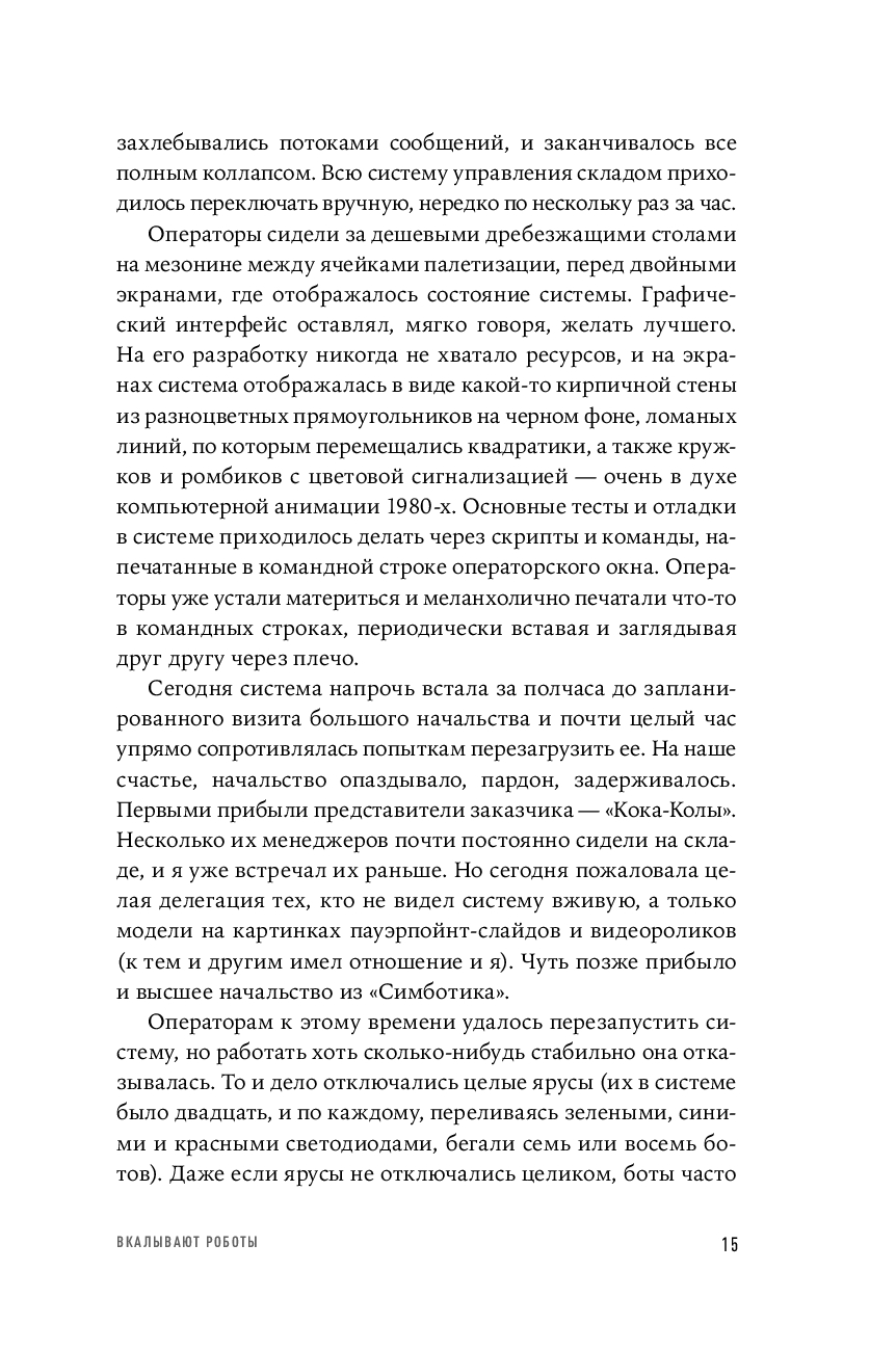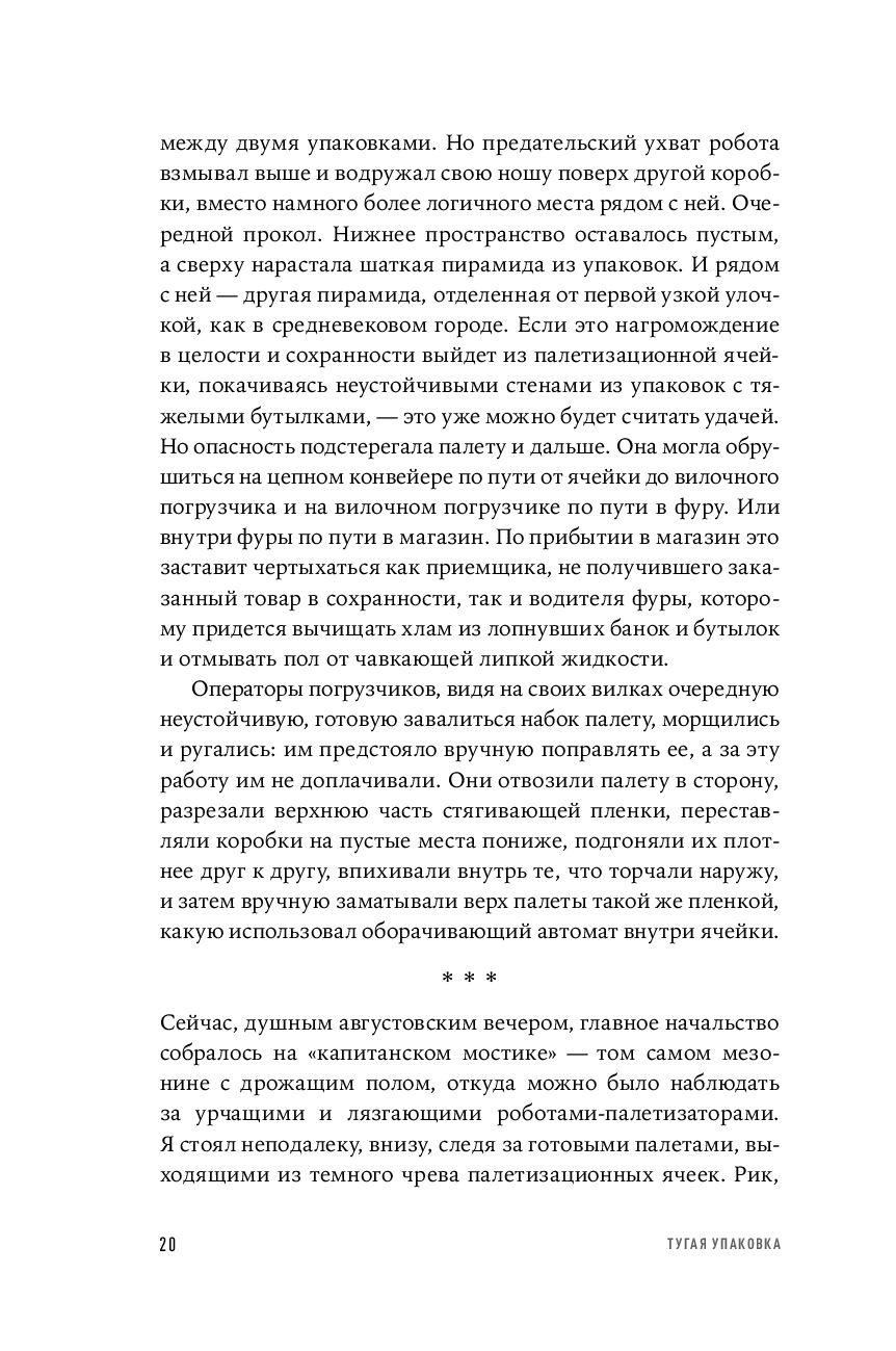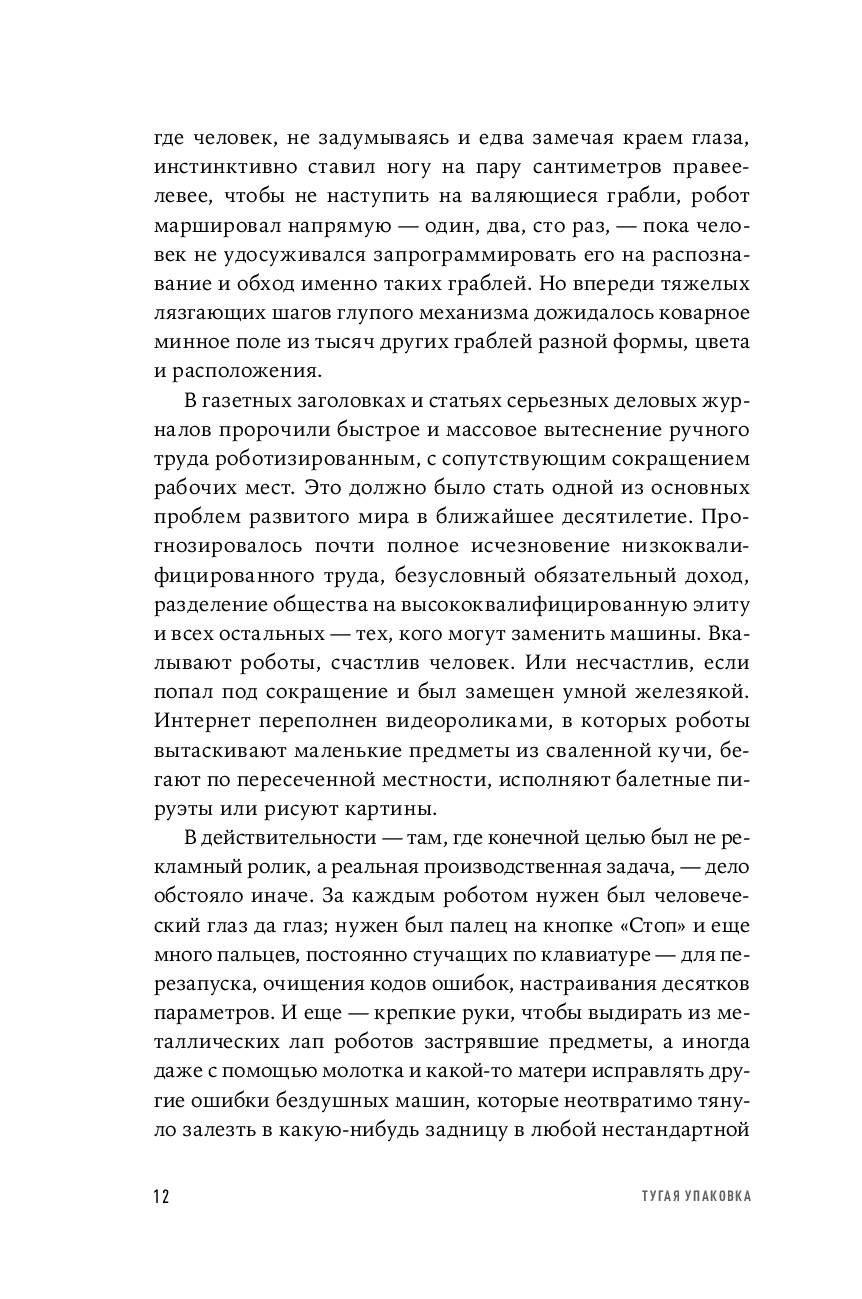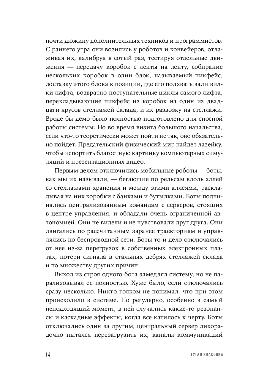 "Тугая упаковка" – это история технологического и коммерческого успеха компании, но прежде всего это история успеха автора книги, как-то совершенно неожиданно придумавшего очень сложный, но элегантный алгоритм, который и стал краеугольным камнем корпоративной интеллектуальной собственности. Книга рассказывает о не самой гламурной "области" современной корпоративной Америки – о логистике и автоматизации складов. А еще о команде высочайшей квалификации, превратившей этот алгоритм в рабочий код, и о том, как мучительно, но захватывающе развивается техническая мысль, и как она проходит жесткие фильтры реального производства.