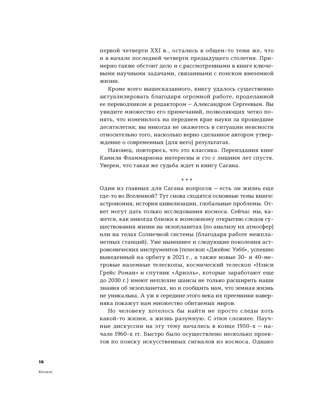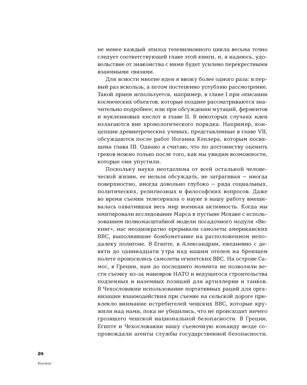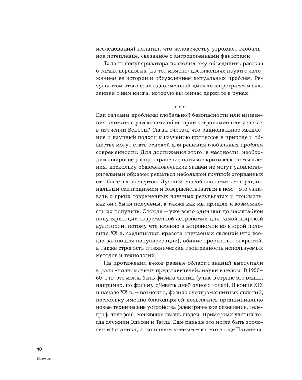 "Космос" – одна из самых известных научно-популярных книг всех времен. В ней прослеживается почти 14 миллиардов лет космической эволюции, превративших материю в сознание, и исследуются такие темы, как происхождение жизни, человеческий мозг, египетские иероглифы, миссии космических кораблей, смерть Солнца, эволюция галактик, а также обстоятельства и личности, которые помогли сформировать современную науку.