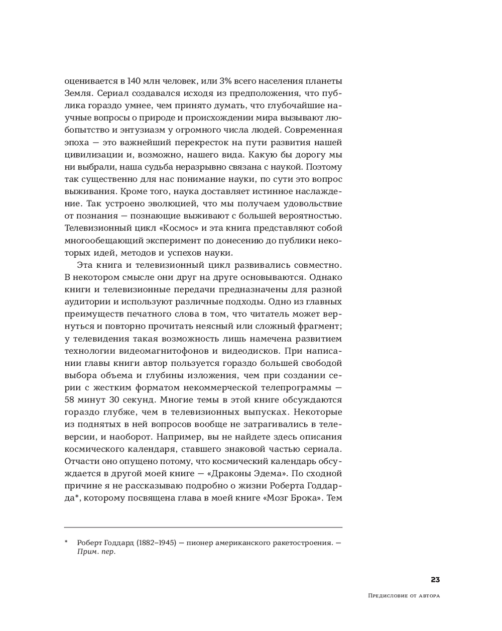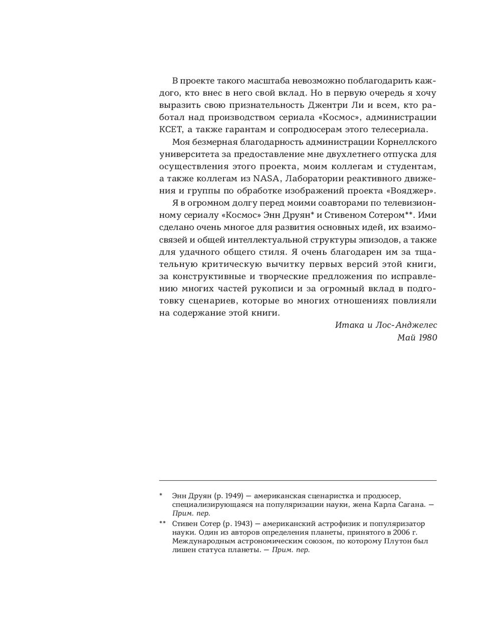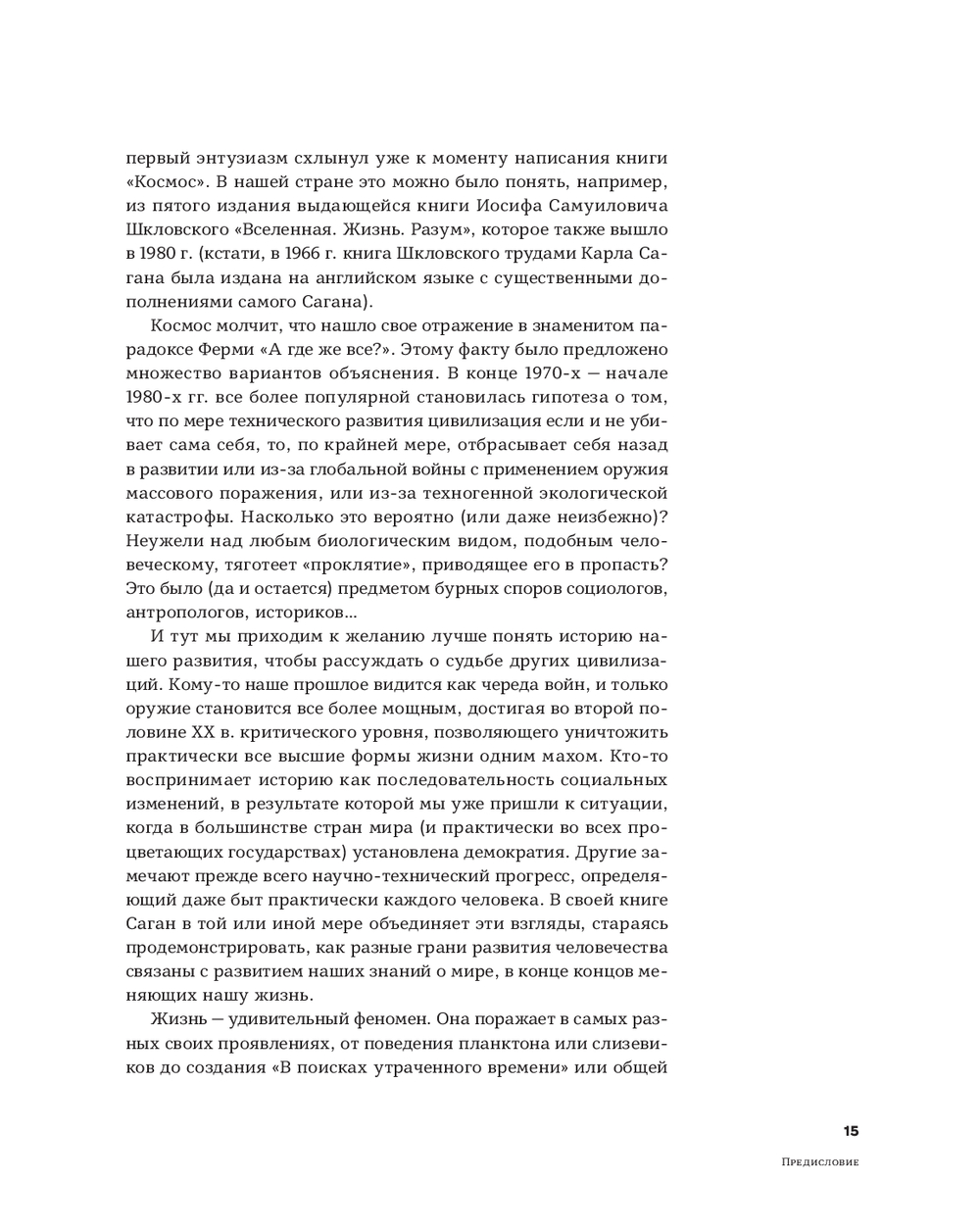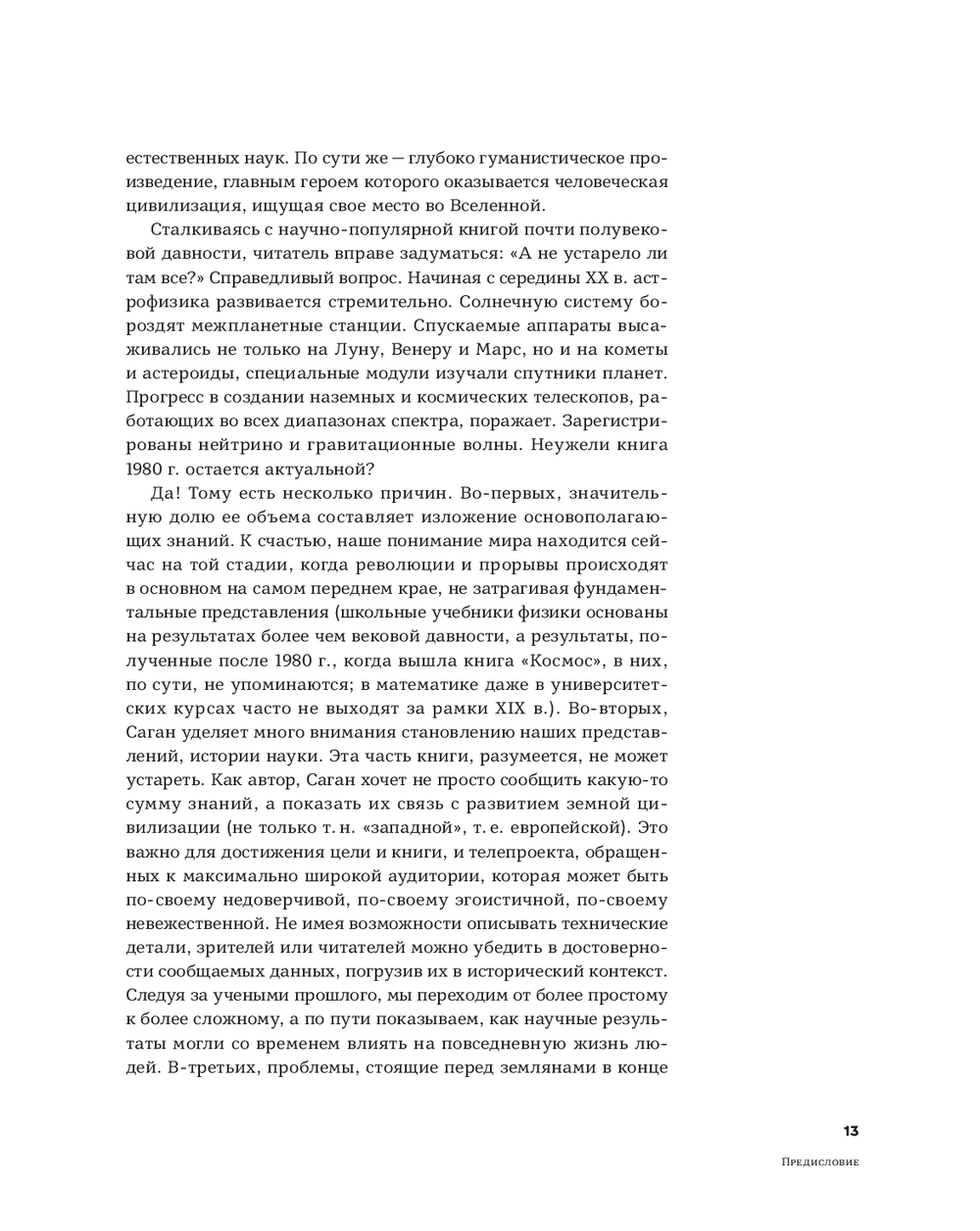 "Космос" – одна из самых известных научно-популярных книг всех времен. В ней прослеживается почти 14 миллиардов лет космической эволюции, превративших материю в сознание, и исследуются такие темы, как происхождение жизни, человеческий мозг, египетские иероглифы, миссии космических кораблей, смерть Солнца, эволюция галактик, а также обстоятельства и личности, которые помогли сформировать современную науку.