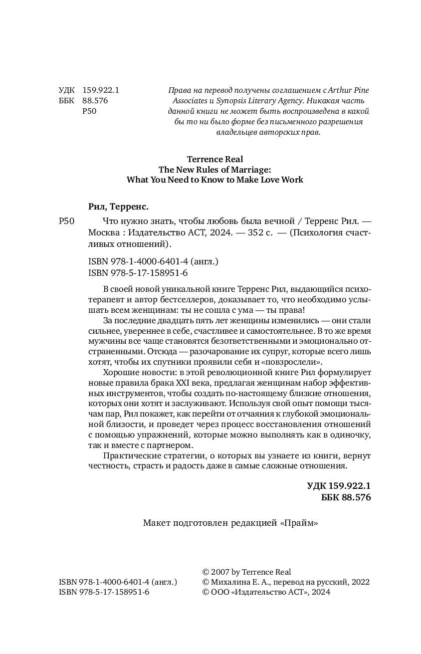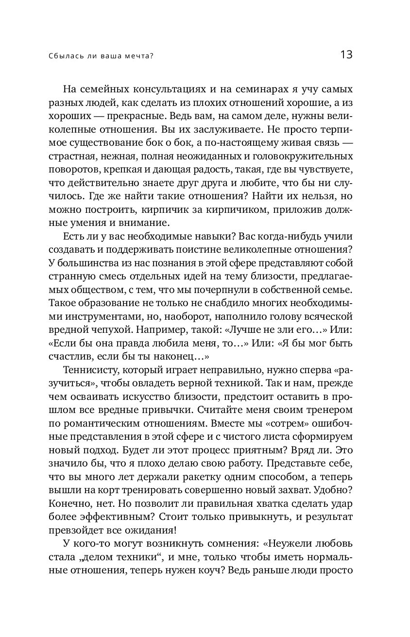 Хорошие новости: в этой революционной книге Рил формулирует новые правила брака XXI века, предлагая женщинам набор эффективных инструментов, с помощью которых они смогут создать по-настоящему близкие отношения, которых хотят и заслуживают. Автор выделяет пять типов мужчин, которых следует избегать, и делится практическими стратегиями, которые вернут честность, страсть и радость даже в самые сложные отношения. Используя свой опыт помощи тысячам пар, Рил покажет, как перейти от отчаяния к глубокой эмоциональной близости, и проведет вас через процесс восстановления отношений с помощью упражнений, которые вы можете выполнять как в одиночку, так и вместе с партнером.