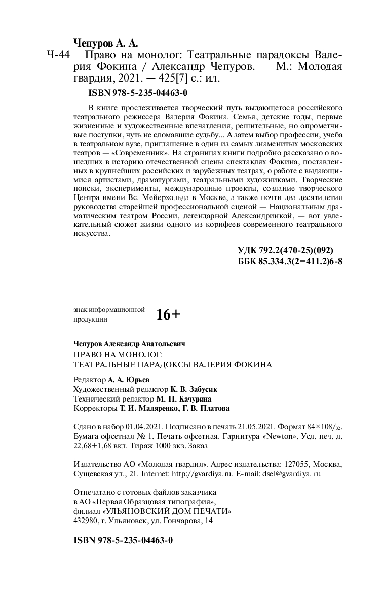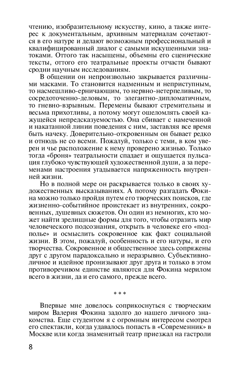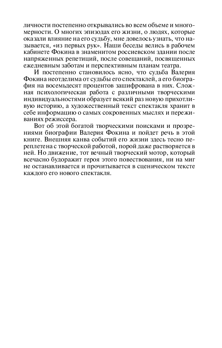 В книге прослеживается творческий путь выдающегося российского театрального режиссёра Валерия Фокина. Семья, детские годы, первые жизненные и художественные впечатления, решительные, но опрометчивые поступки, чуть не сломавшие судьбу… А затем выбор профессии, учёба в театральном вузе, приглашение в один из самых знаменитых московских театров – "Современник". На страницах книги подробно рассказано о вошедших в историю отечественной сцены спектаклях Фокина, поставленных в крупнейших российских и зарубежных театрах, о работе с выдающимися артистами, драматургами, театральными художниками. Творческие поиски, эксперименты, международные проекты, создание творческого Центра имени Вс. Мейерхольда в Москве, а также почти два десятилетия руководства старейшей профессиональной сценой – Национальным драматическим театром России, легендарной Александринкой, – вот увлекательный сюжет жизни одного из корифеев современного театрального искусства.