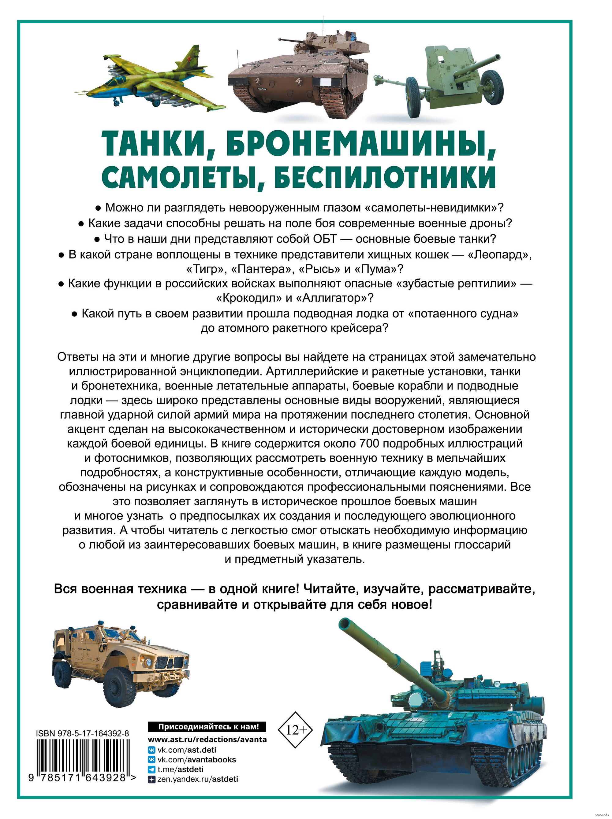 В этой увлекательной прекрасно иллюстрированной энциклопедии наглядно представлены все основные виды вооружений, созданные людьми за последнее столетие: ствольная и буксируемая артиллерия, самоходные артиллерийские и ракетные установки, танки и бронетехника, военные летательные аппараты, боевые корабли и подводные лодки. Красочные иллюстрации, а в книге их около 700, выполнены художниками, которые специализируются на изображении современной и исторической военной техники, а это значит, что от их профессионального взгляда не ускользнет ни одна, даже мельчайшая, конструктивная особенность, а раскраска боевых машин и опознавательные знаки на них будут в точности соответствовать реальным прототипам.