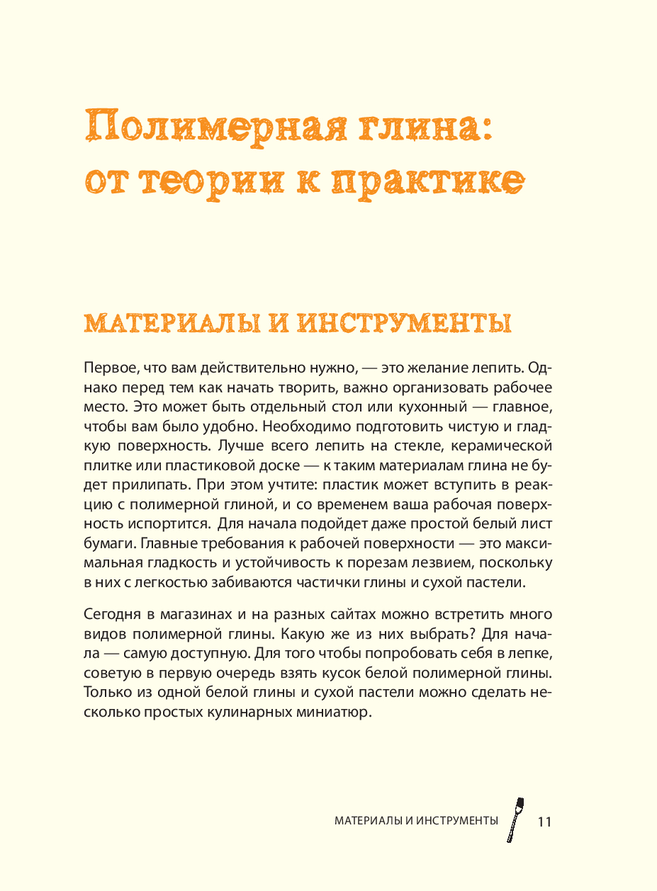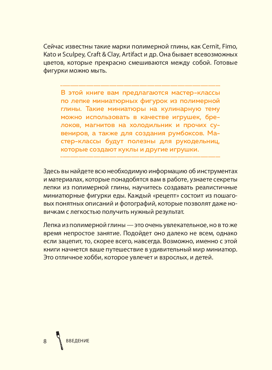 Вас ждут 27 подробных иллюстрированных мастер-классов по лепке блюд русской и зарубежной кухонь. Подробный гид по материалам и инструментам поможет разобраться с процессом лепки даже новичкам, а лайфхаки и подсказки от автора дадут ответ на все возникающие вопросы!