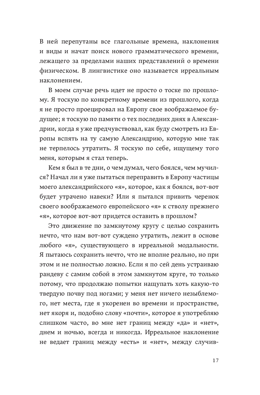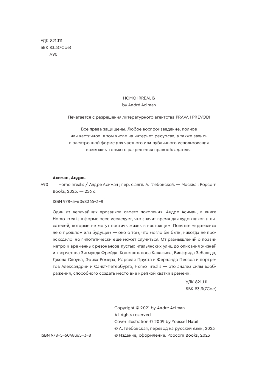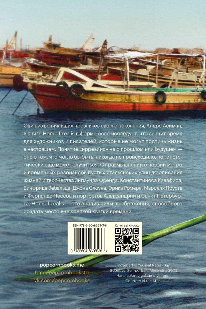 Один из величайших прозаиков своего поколения, Андре Асиман, в книге Homo Irrealis в форме эссе исследует, что значит время для художников и писателей, которые не могут постичь жизнь в настоящем. Понятие "ирреалис" не о прошлом или будущем – оно о том, что могло бы быть, никогда не происходило, но гипотетически еще может случиться. От размышлений о поэзии метро и временных резонансов пустых итальянских улиц до описания жизней и творчества Зигмунда Фрейда, Константиноса Кавафиса, Винфрида Зебальда, Джона Слоуна, Эрика Ромера, Марселя Пруста и Фернандо Пессоа и портретов Александрии и Санкт-Петербурга, Homo Irrealis – это анализ силы воображения, способного создать место вне крепкой хватки времени.