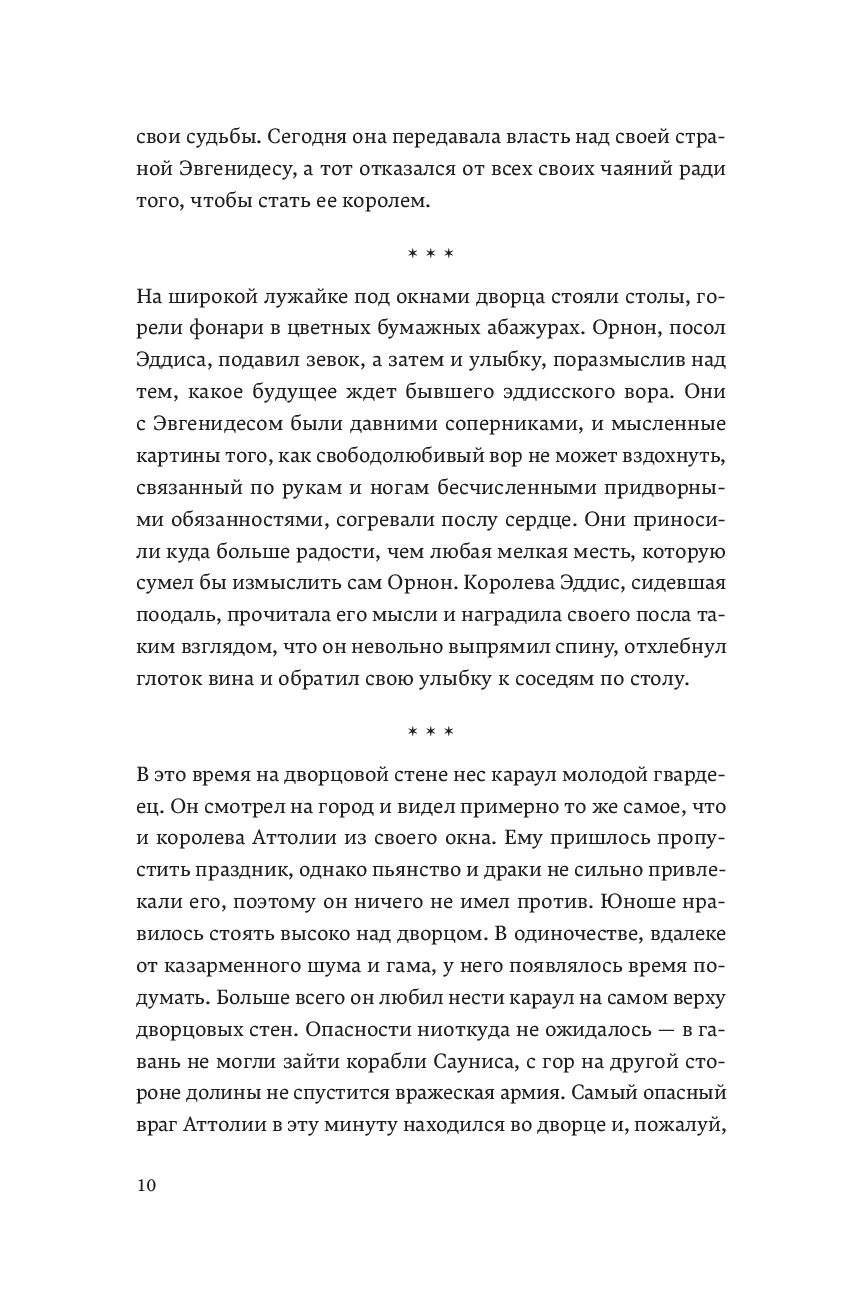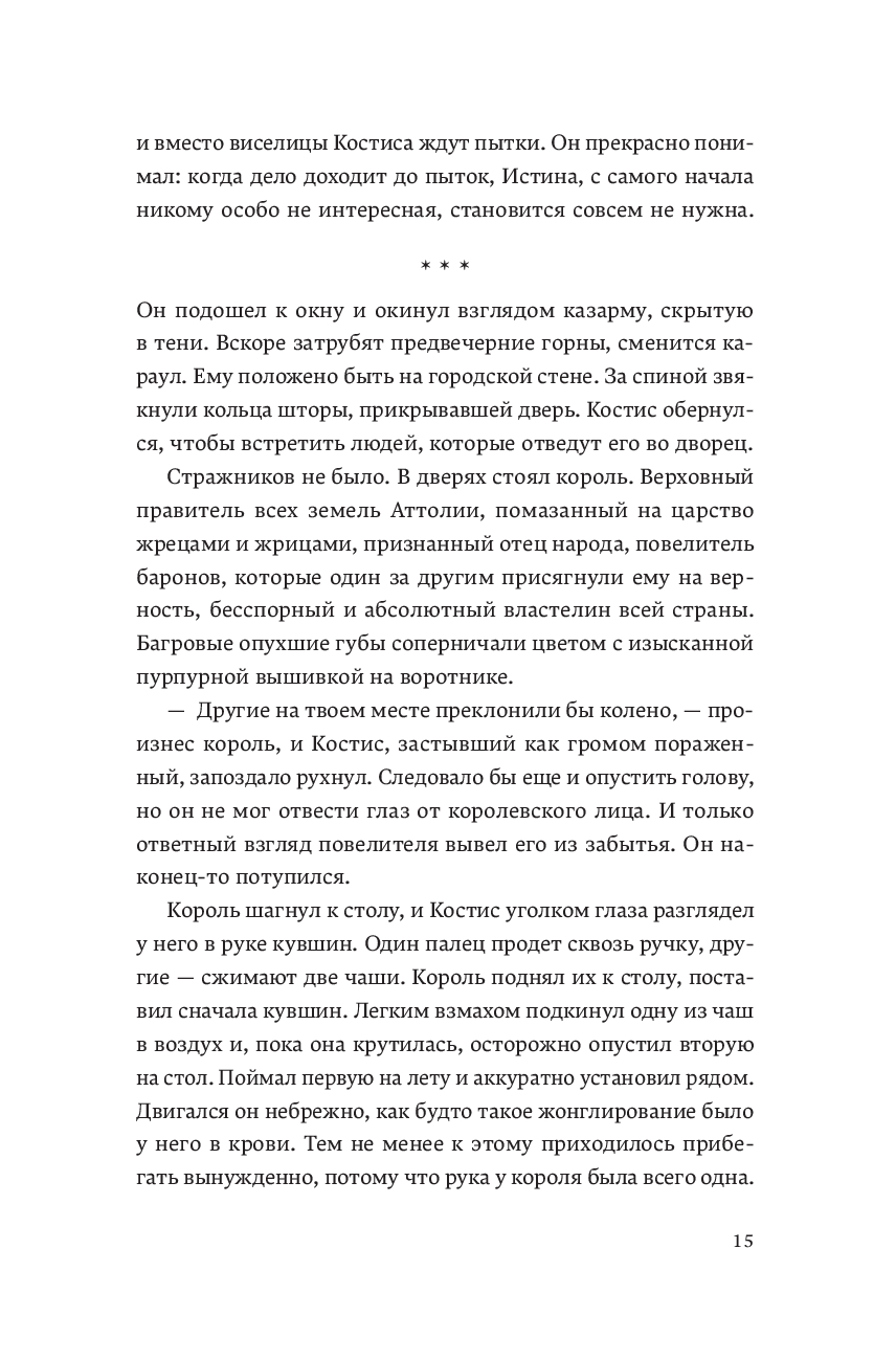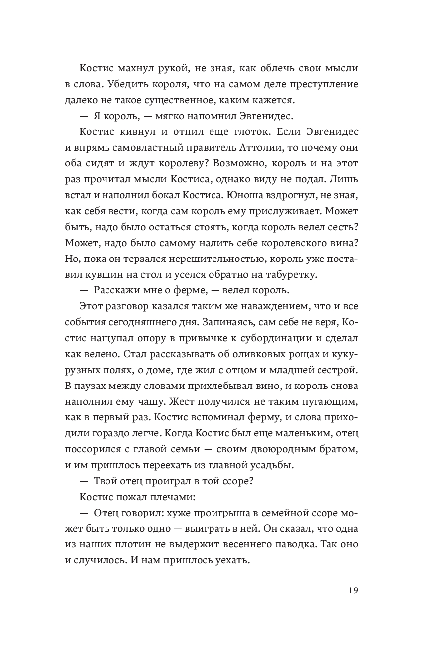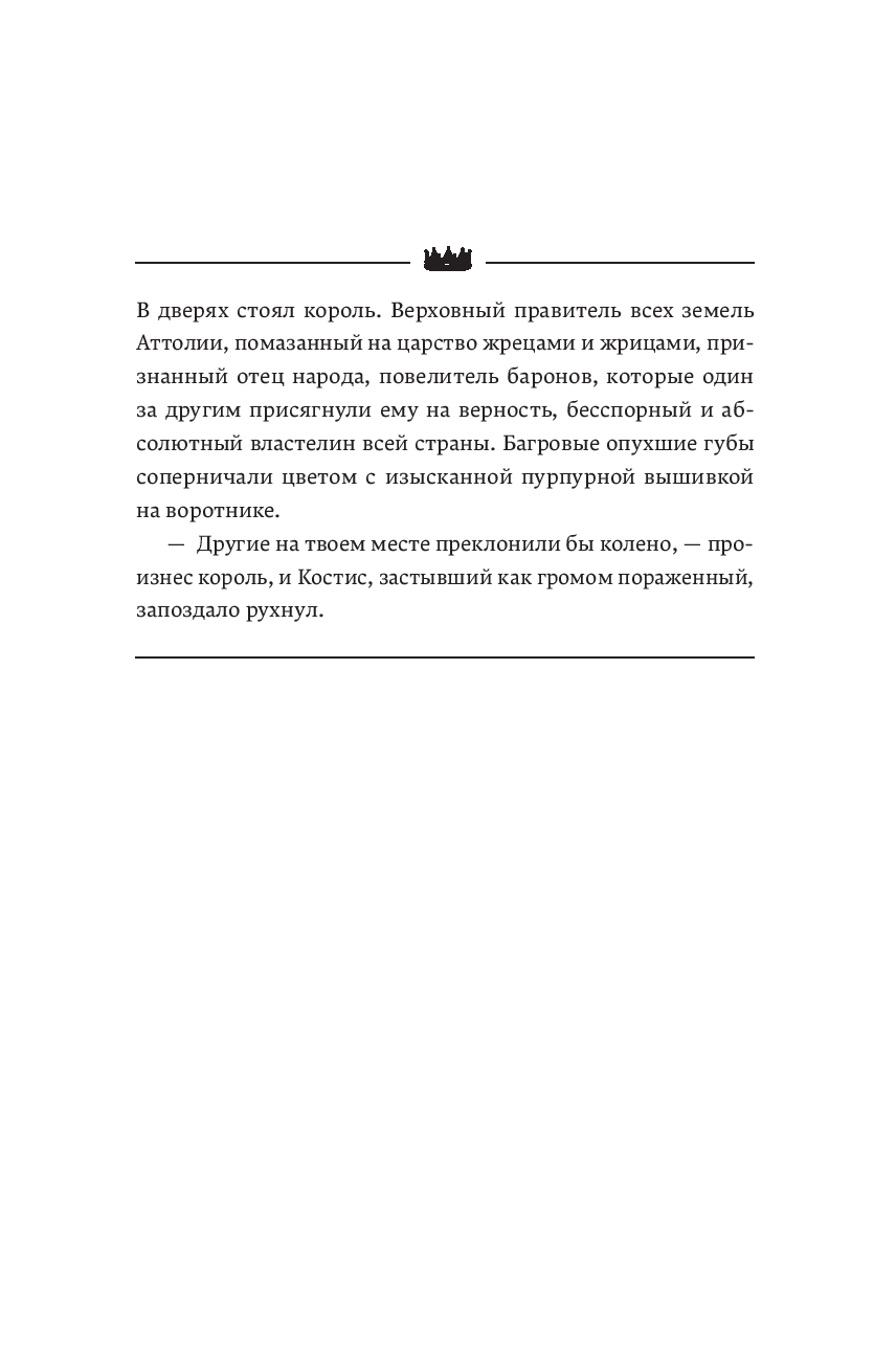 С помощью коварства и хитрости Эвгенидес, эддисский вор, стал новым королем Аттолии. Только желал он королеву, а не корону, но запутался в паутине интриг, которую сам создал, и затем еще втянул наивного молодого стражника в самый центр политической бури. Бедный Костис понимает, что он стал жертвой капризов короля, но его презрение к Эвгенидесу постепенно перекрывается уважением – новый король на деле гораздо сложнее и глубже, чем кажется на первый взгляд. Скоро коррумпированный двор Аттолии узнает, что ни одна тонкая и опасная интрига не страшна Эвгенидесу.