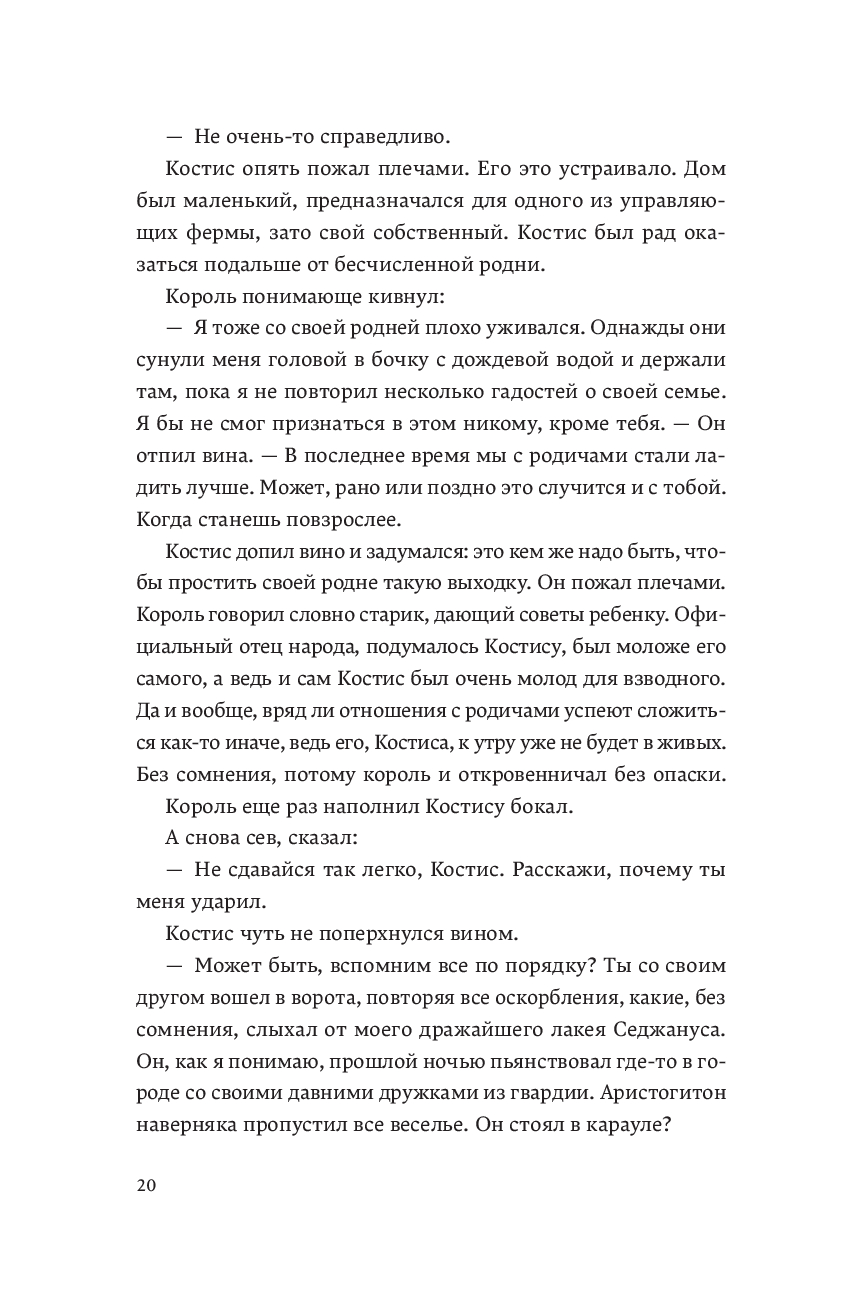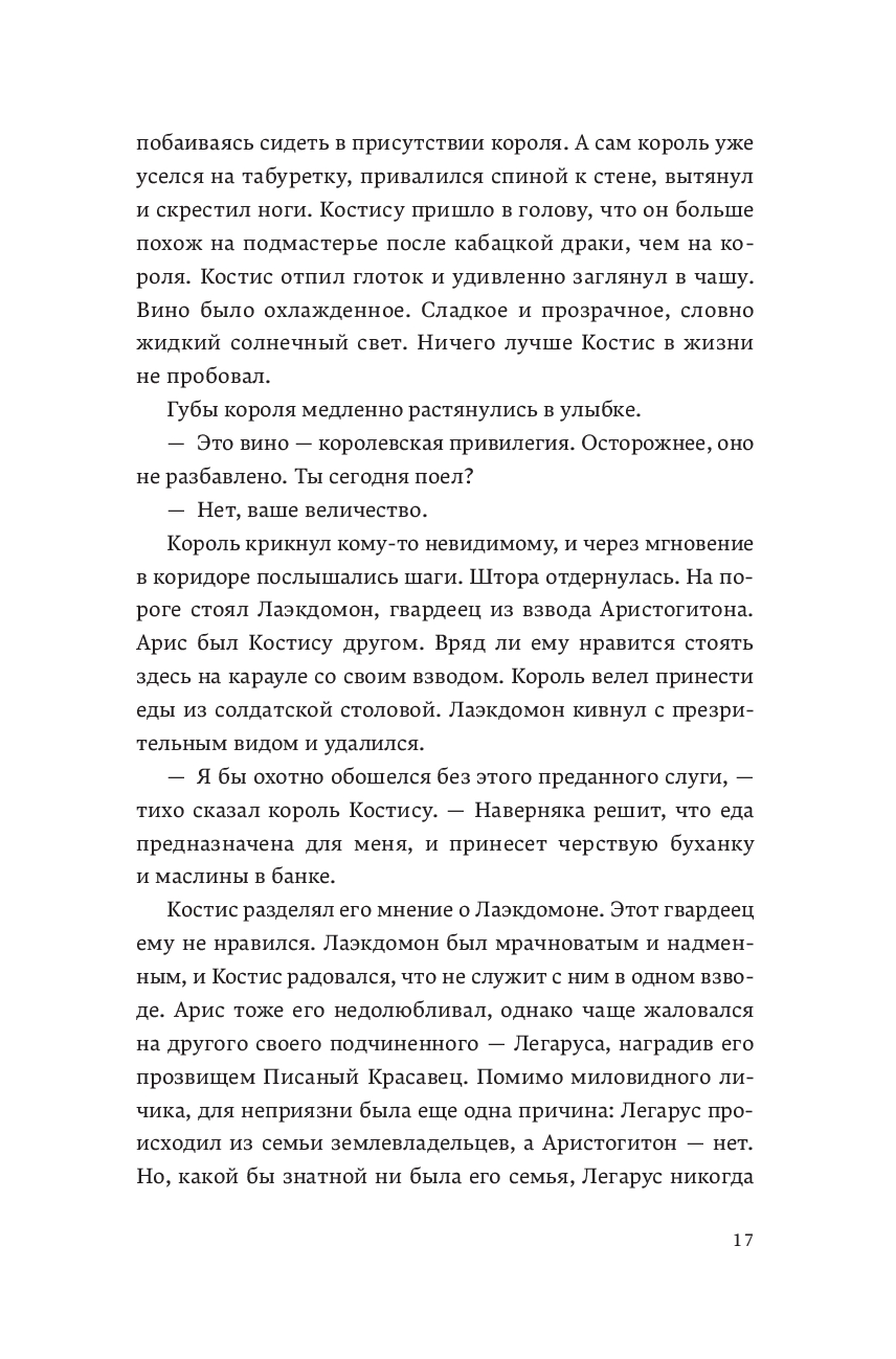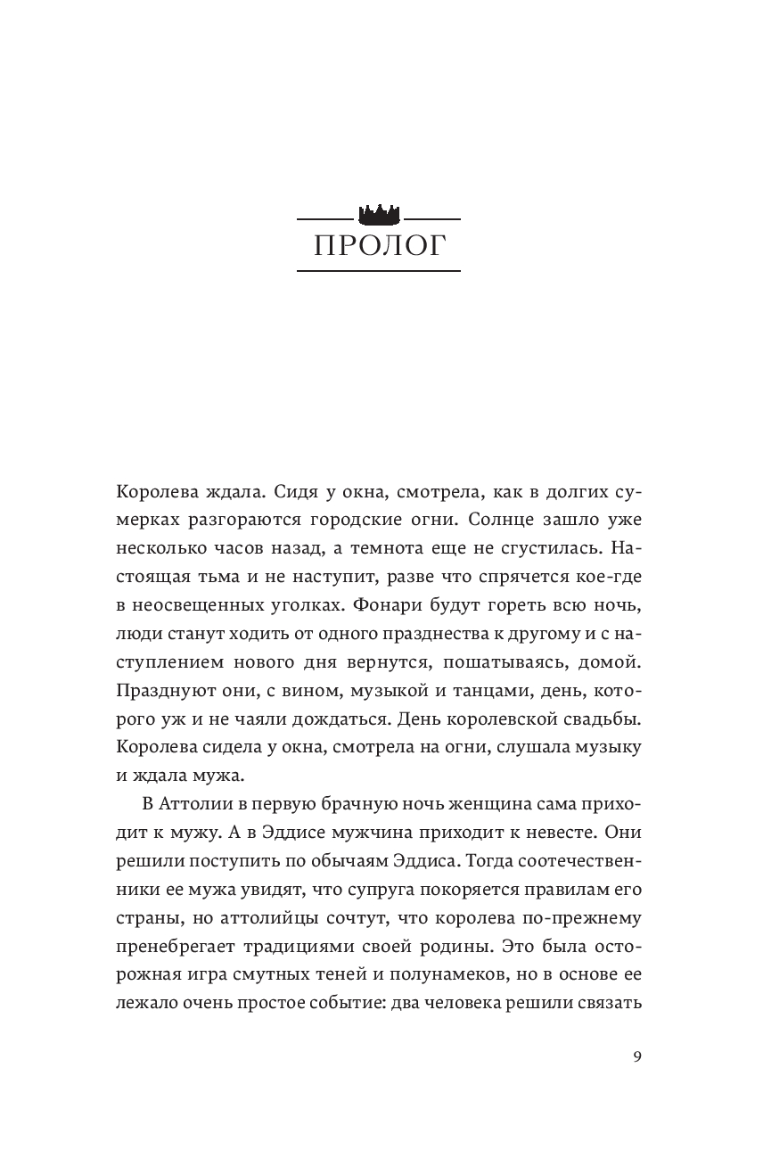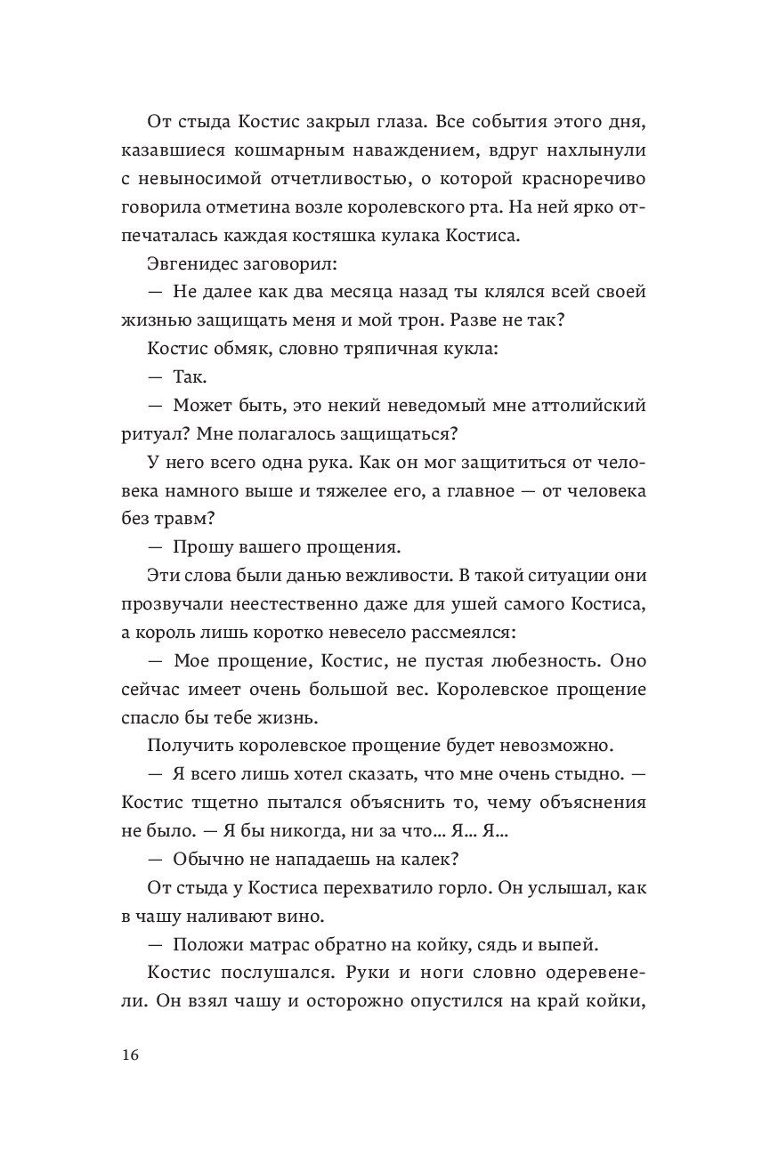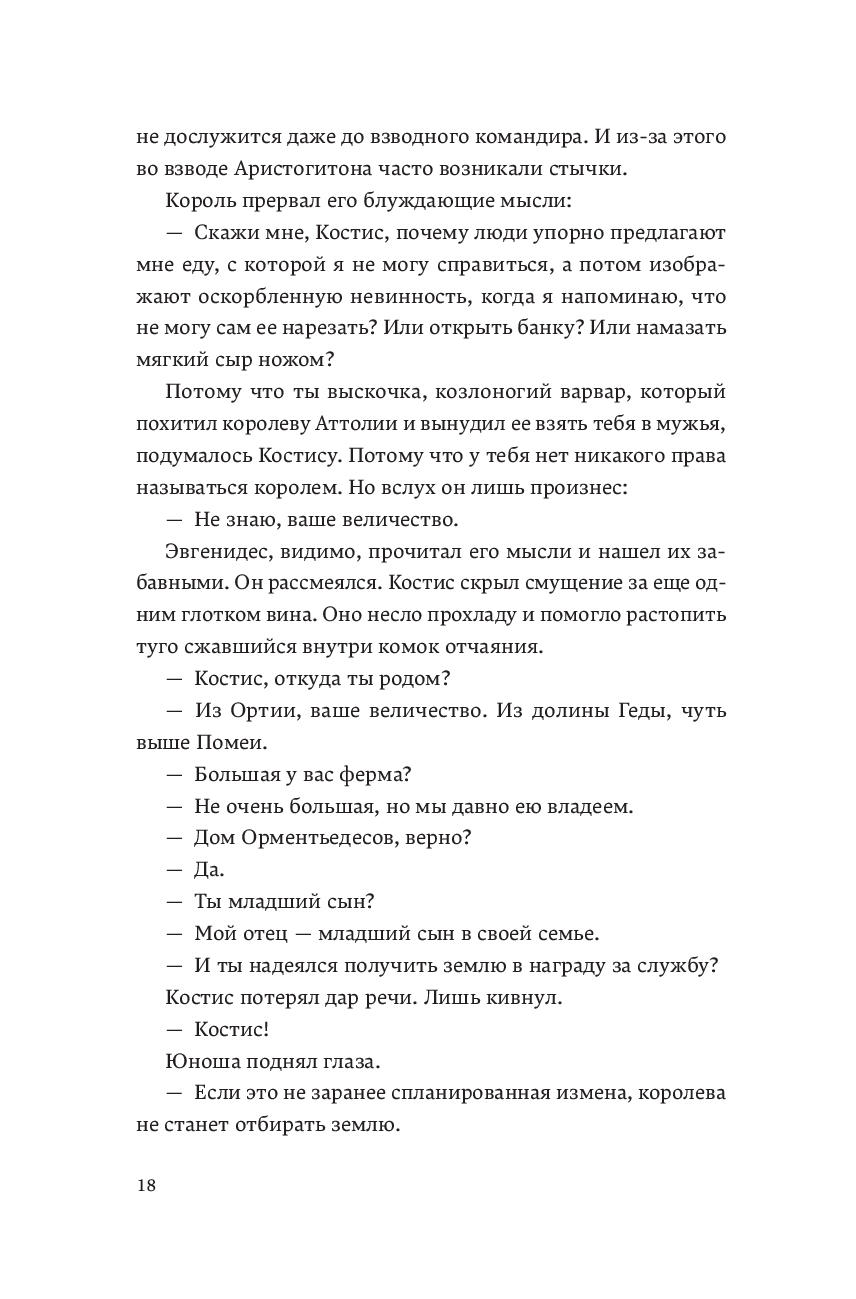 С помощью коварства и хитрости Эвгенидес, эддисский вор, стал новым королем Аттолии. Только желал он королеву, а не корону, но запутался в паутине интриг, которую сам создал, и затем еще втянул наивного молодого стражника в самый центр политической бури. Бедный Костис понимает, что он стал жертвой капризов короля, но его презрение к Эвгенидесу постепенно перекрывается уважением – новый король на деле гораздо сложнее и глубже, чем кажется на первый взгляд. Скоро коррумпированный двор Аттолии узнает, что ни одна тонкая и опасная интрига не страшна Эвгенидесу.