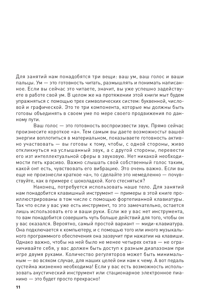 Название раскрывает читателям три основных инструмента, которые понадобятся для освоения знаний: ваш ум, ваш голос и ваши пальцы. И, конечно, активное желание разобраться в вопросе. Автор не изобретает новых идей, но блестяще связывает между собой положения физики звука, гармонии, ритмики, голосоведения, полифонии, сольфеджио, музыкальной формы и инструментоведения в духе идей о Harmonia Mundi. И всё это в перспективе от Античности до наших дней.
