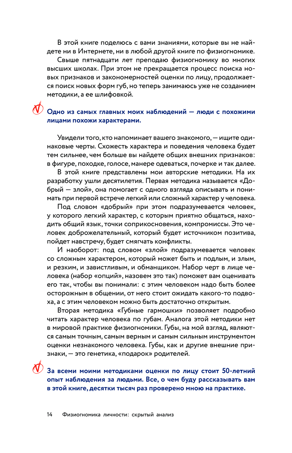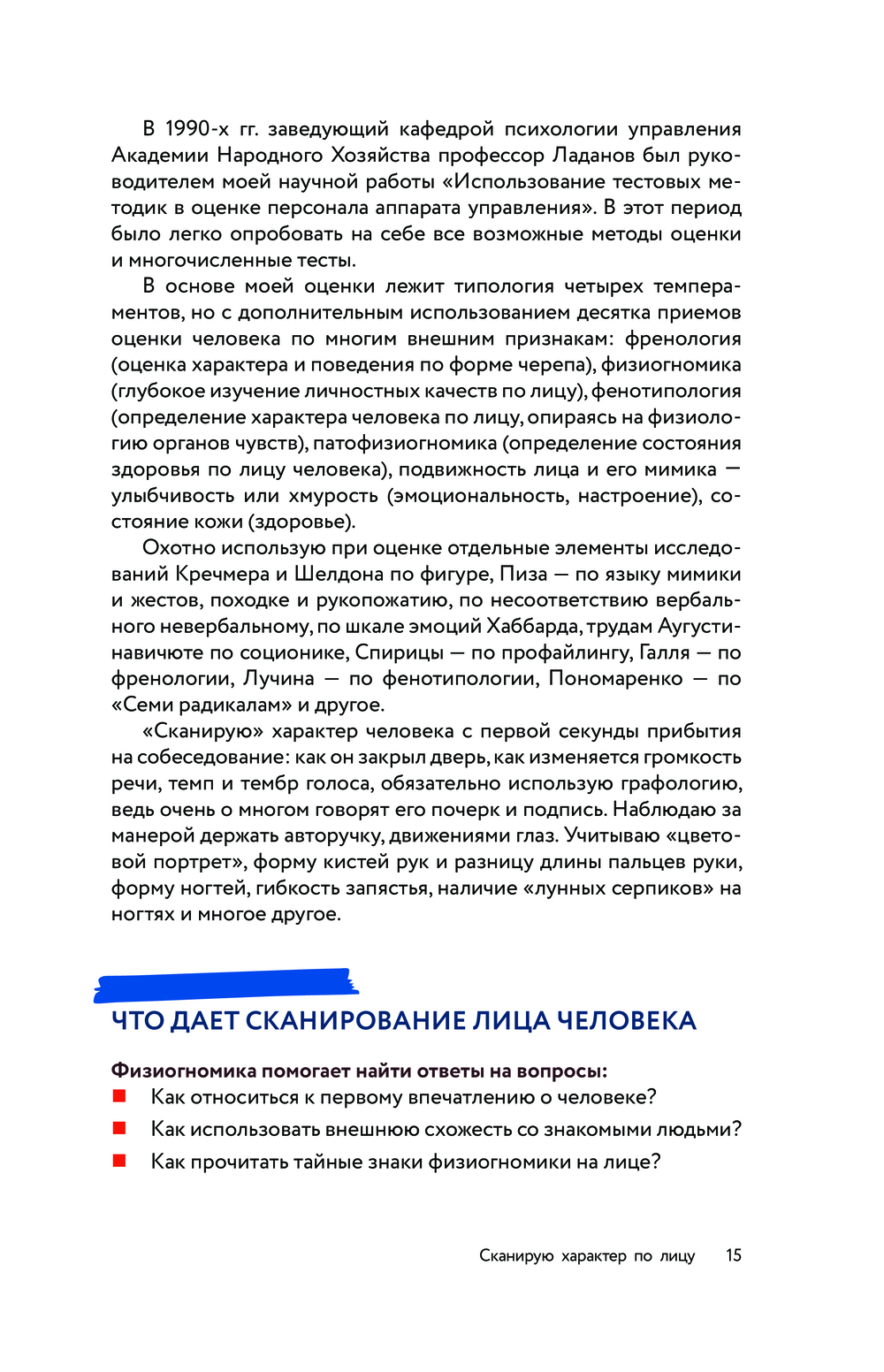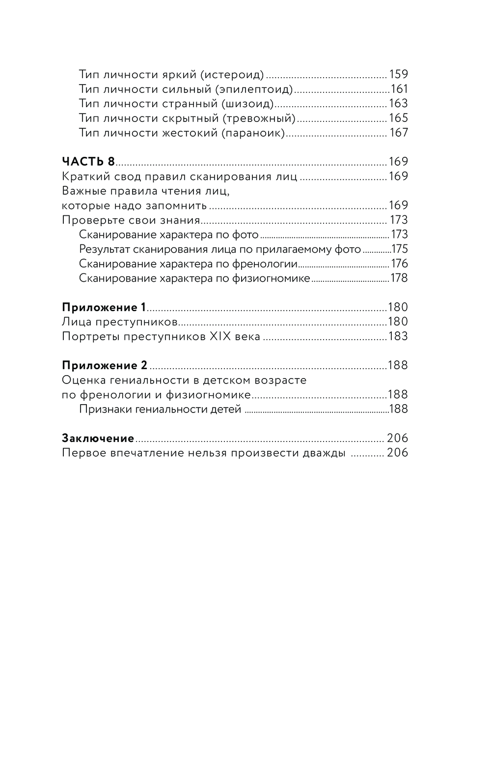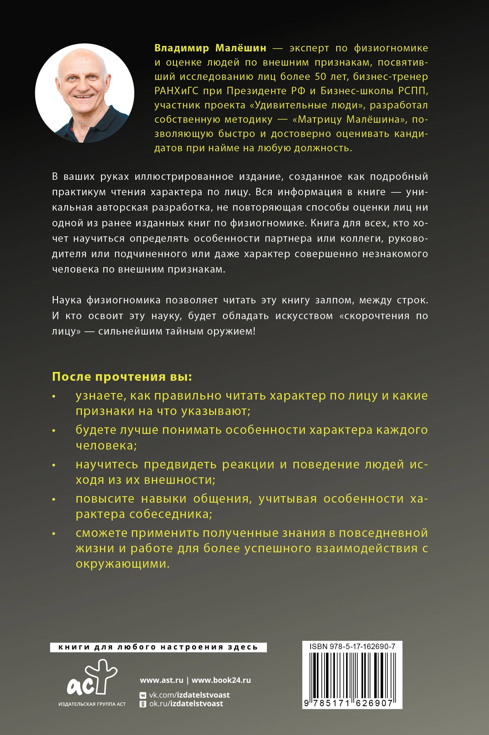 В ваших руках иллюстрированное издание, созданное как подробный практикум чтения характера по лицу. Вся информация в книге – уникальная авторская разработка, не повторяющая способы оценки лиц ни одной из ранее изданных книг по физиогномике. Книга для всех, кто хочет научиться определять особенности партнера или коллеги, руководителя или подчиненного или даже характер совершенно незнакомого человека по внешним признакам. Наука физиогномика позволяет читать эту книгу залпом, между строк. И кто освоит эту науку, будет обладать искусством "скорочтения по лицу" – сильнейшим тайным оружием!