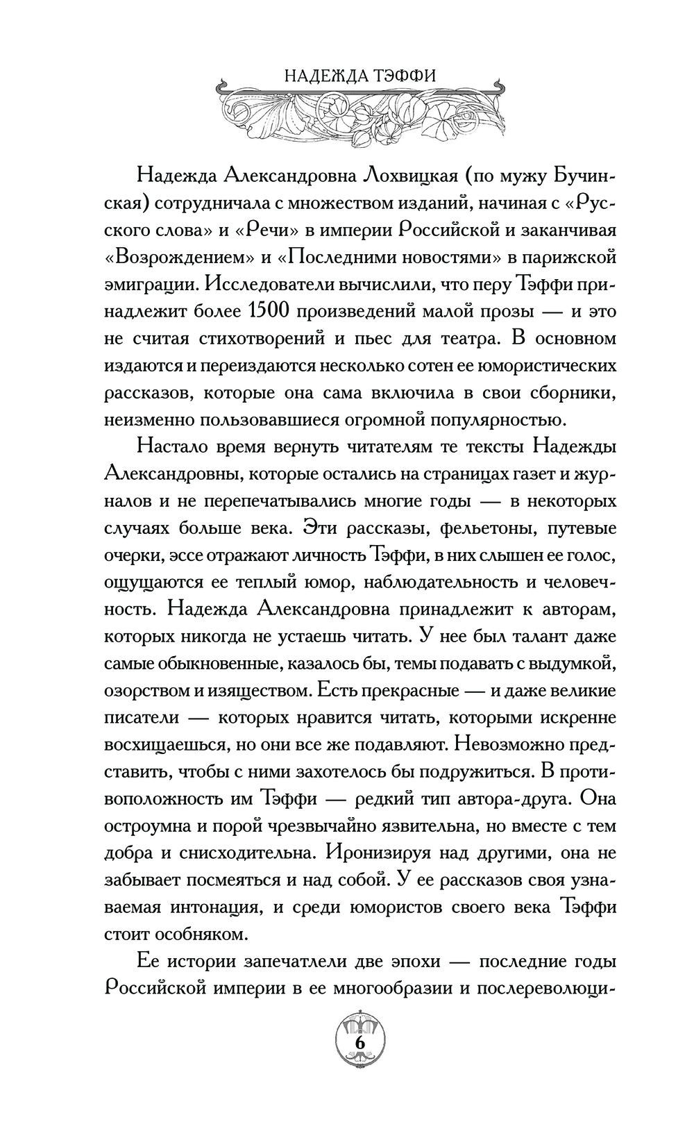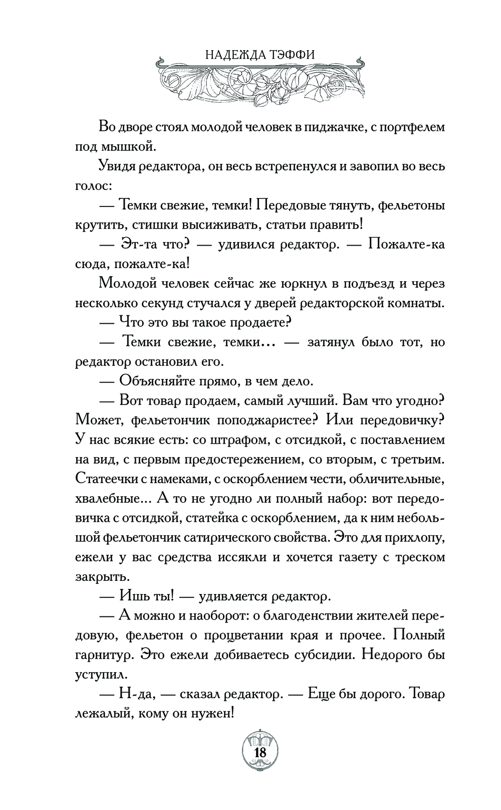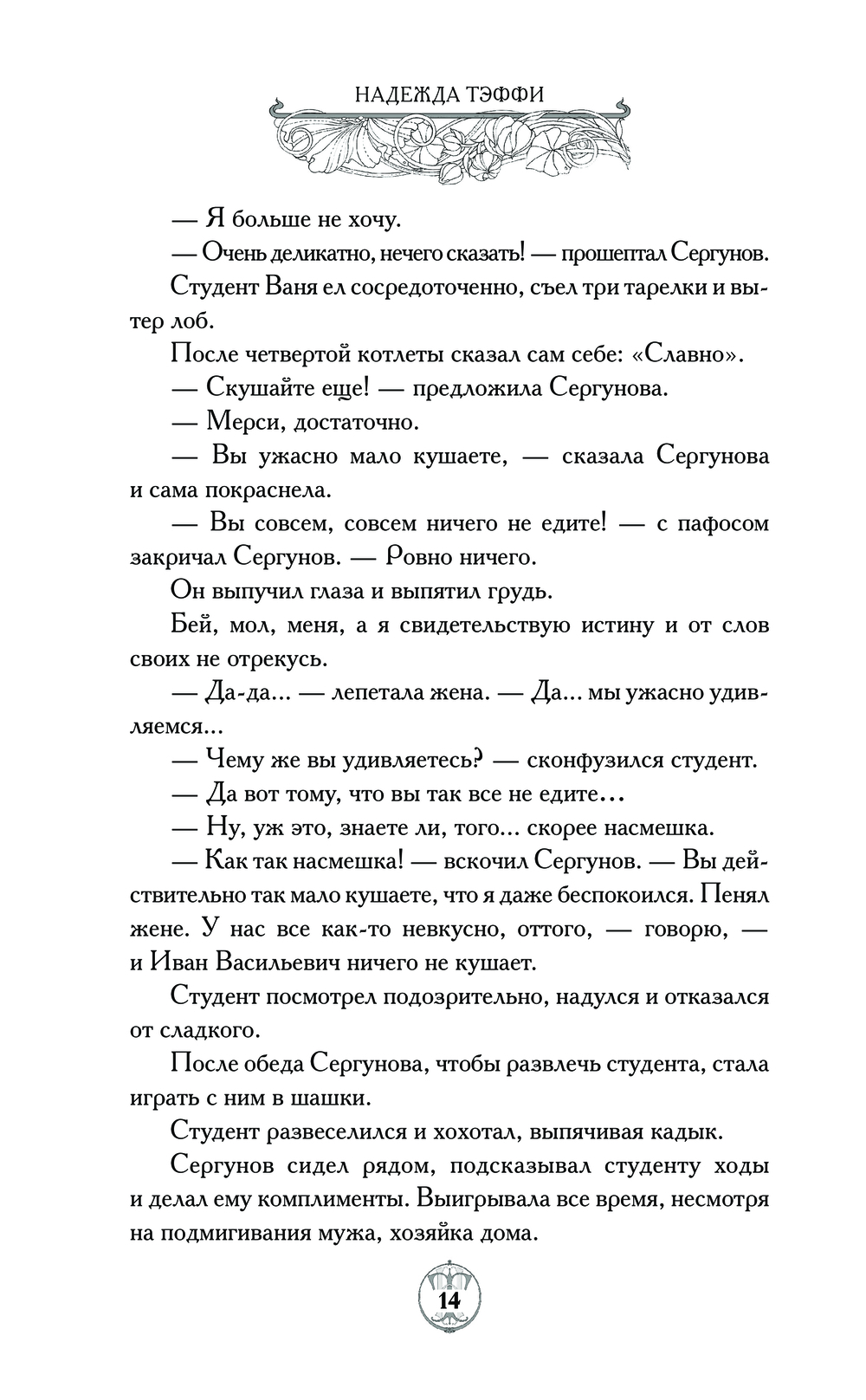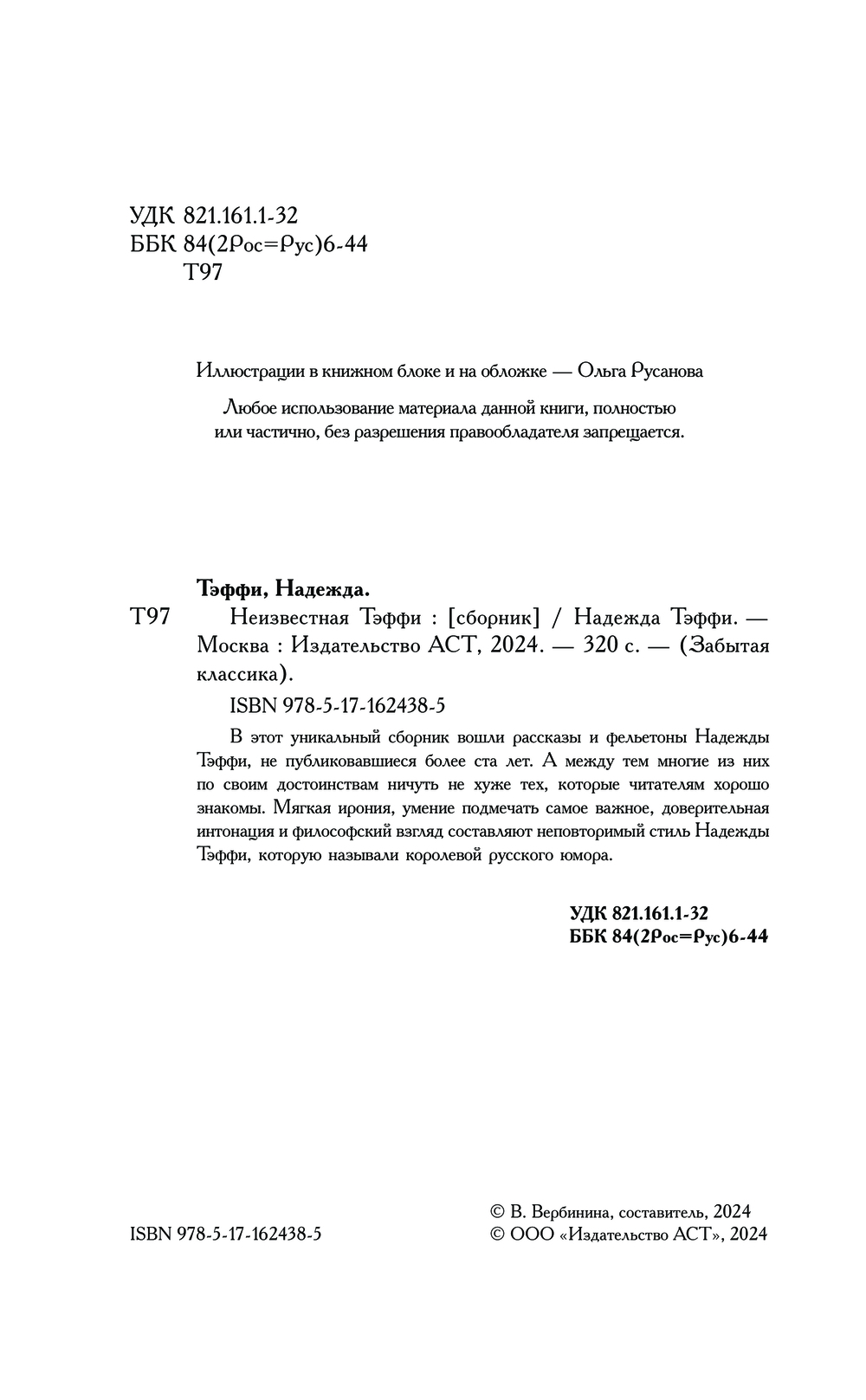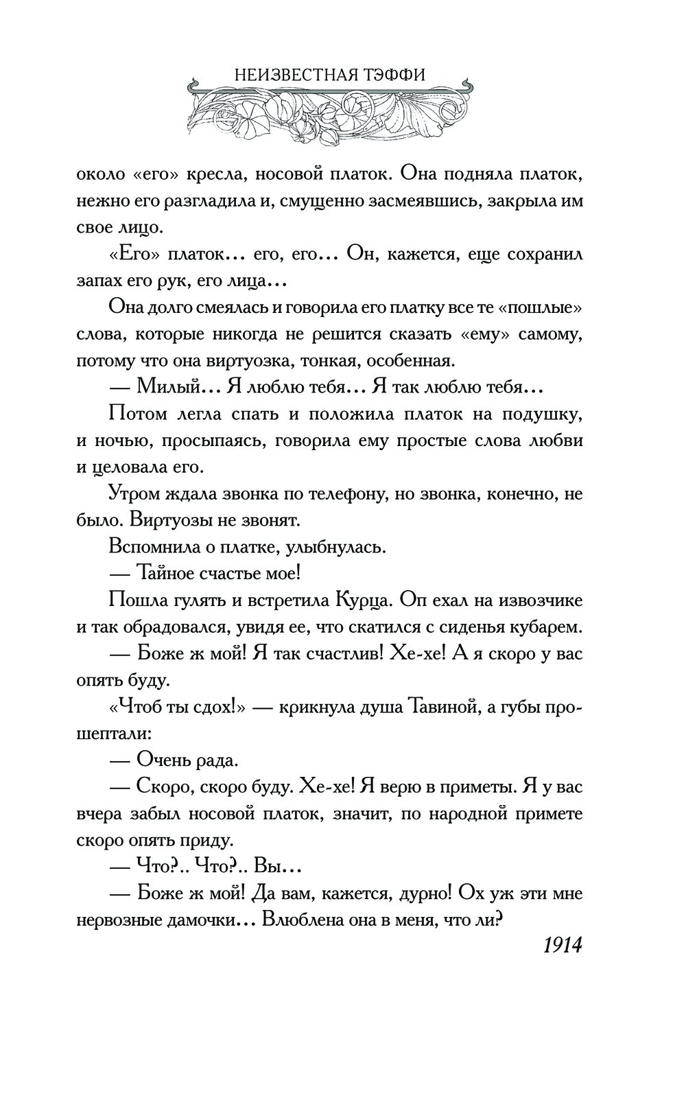 В этот уникальный сборник вошли рассказы и фельетоны Надежды Тэффи, не публиковавшиеся более ста лет. А между тем многие из них по своим достоинствам ничуть не хуже тех, которые читателям хорошо знакомы. Мягкая ирония, умение подмечать самое важное, доверительная интонация и философский взгляд составляют неповторимый стиль Надежды Тэффи, которую называли королевой русского юмора.