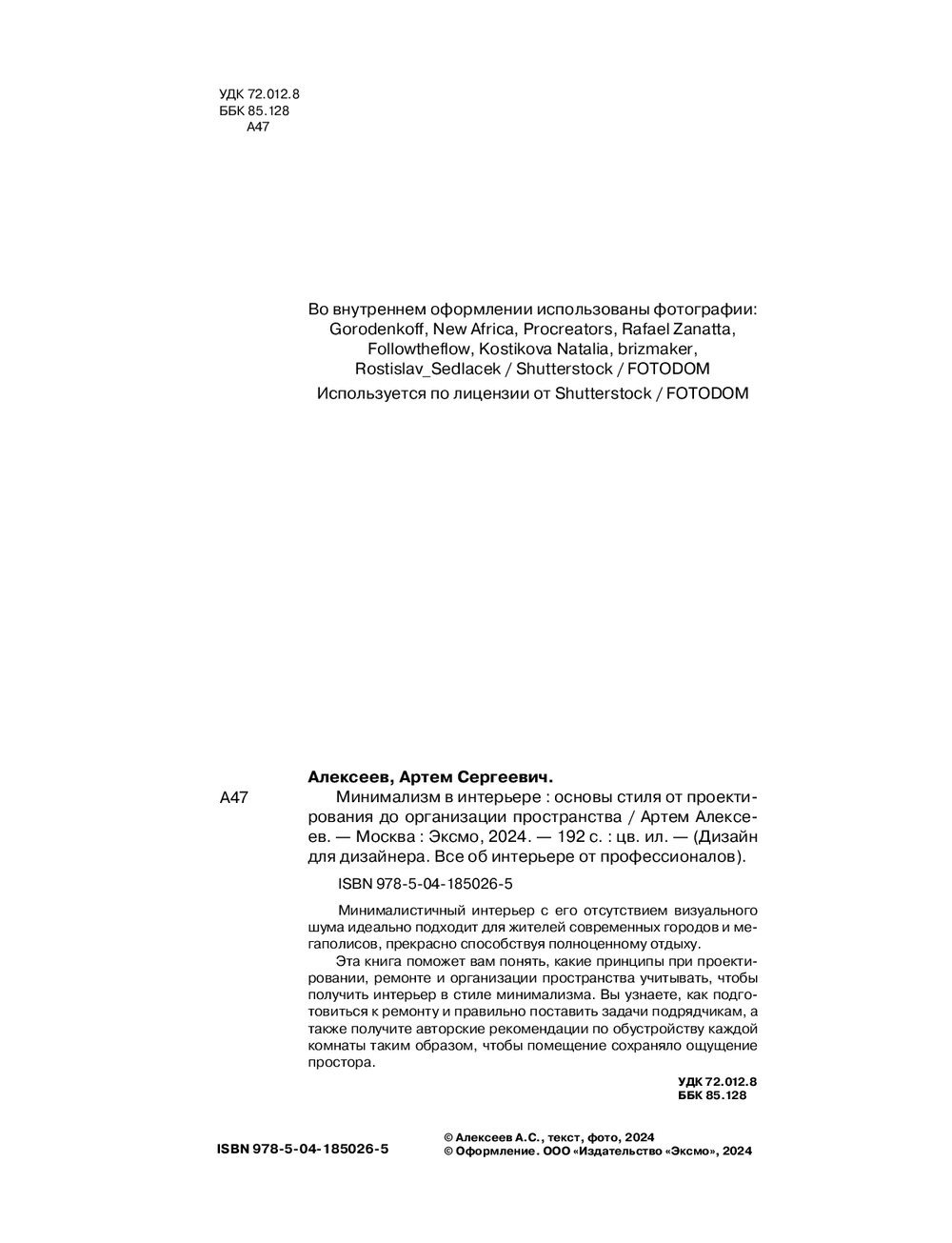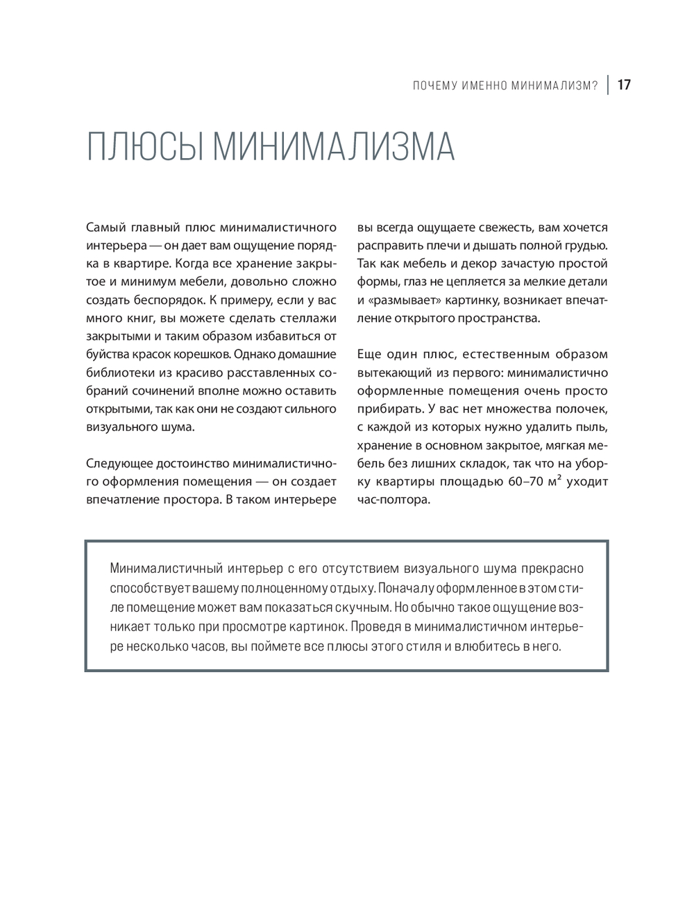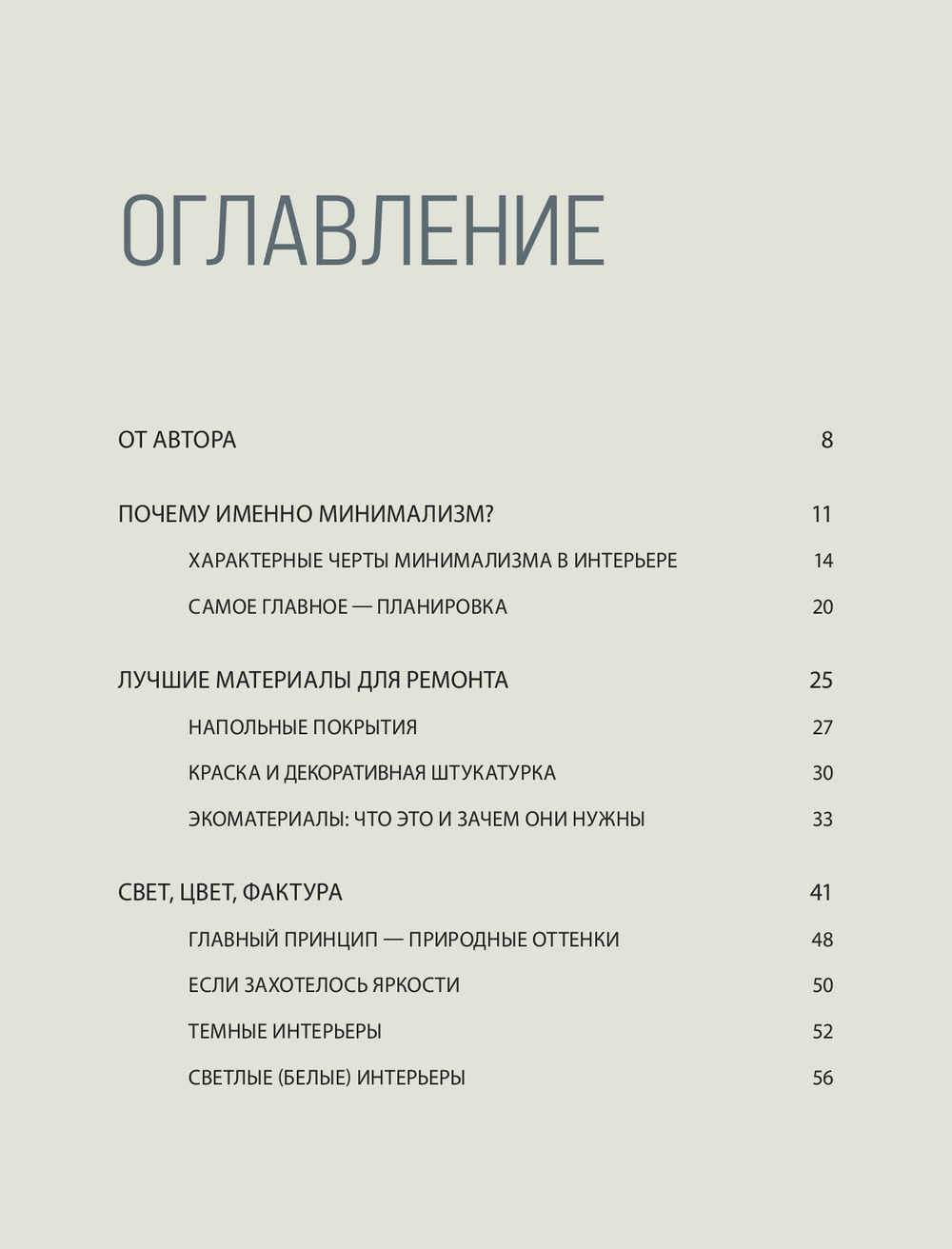 Эта книга поможет вам понять, какие принципы при проектировании, ремонте и организации пространства учитывать, чтобы получить интерьер в стиле минимализм. Вы узнаете, как подготовиться к ремонту и правильно поставить задачи подрядчикам, а также получите авторские рекомендации по обустройству каждой комнаты таким образом, чтобы помещение сохраняло ощущение простора.
