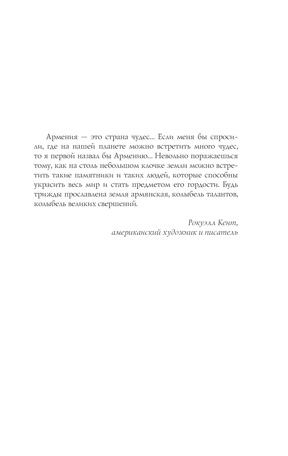 Армения – это страна чудес... Если меня бы спросили, где на нашей планете можно встретить много чудес, то я первой назвал бы Армению... Невольно поражаешься тому, как на столь небольшом клочке земли можно встретить такие памятники и таких людей, которые способны украсить весь мир и стать предметом его гордости. Будь трижды прославлена земля армянская, колыбель талантов, колыбель великих свершений. Рокуэлл Кент.