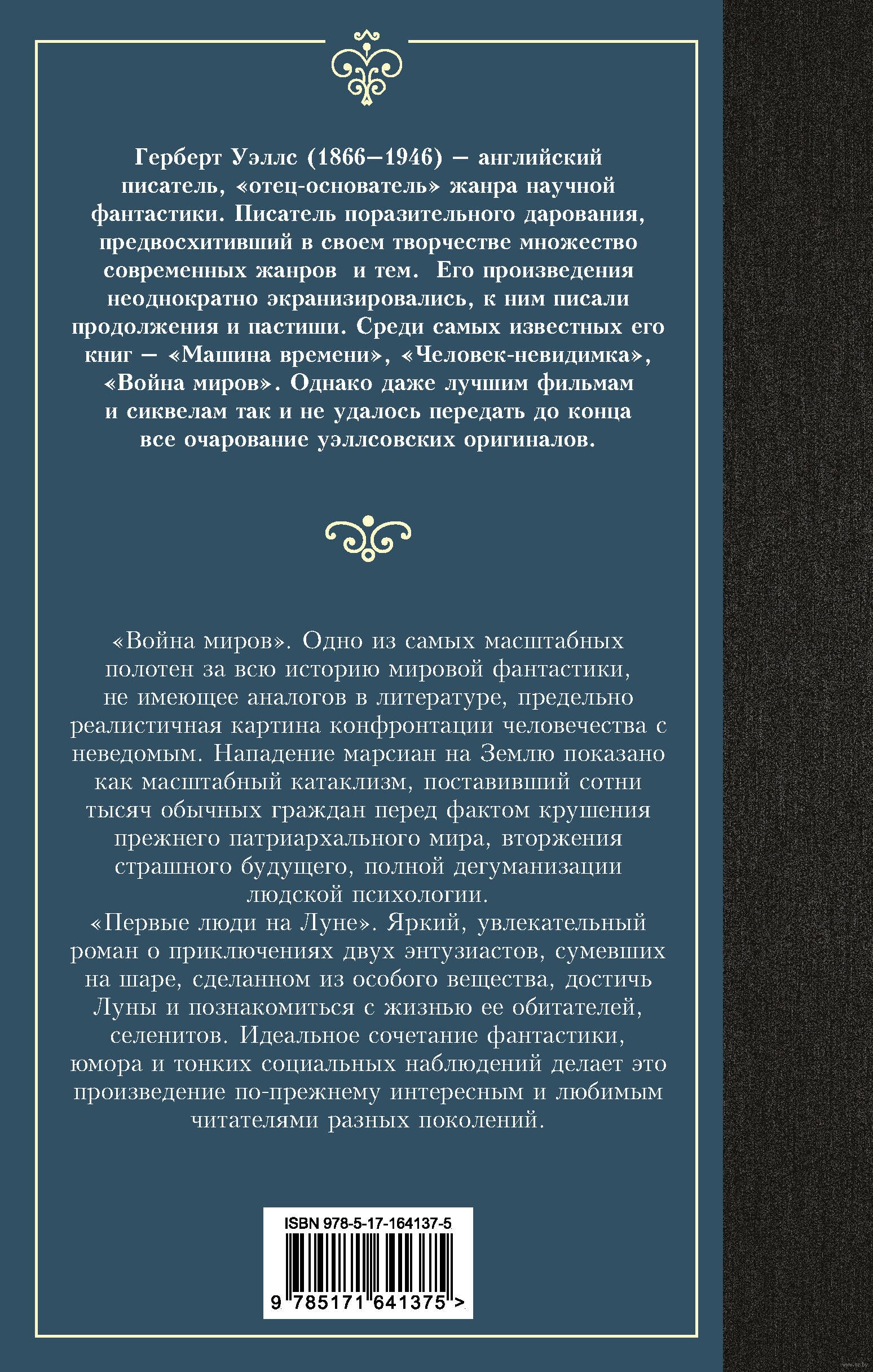 "Первые люди на Луне". Яркий, увлекательный роман о приключениях двух энтузиастов, сумевших на шаре, сделанном из особого вещества, достичь Луны и познакомиться с жизнью ее обитателей, селенитов. Идеальное сочетание фантастики, юмора и тонких социальных наблюдений делает это произведение по-прежнему интересным и любимым читателями разных поколений.