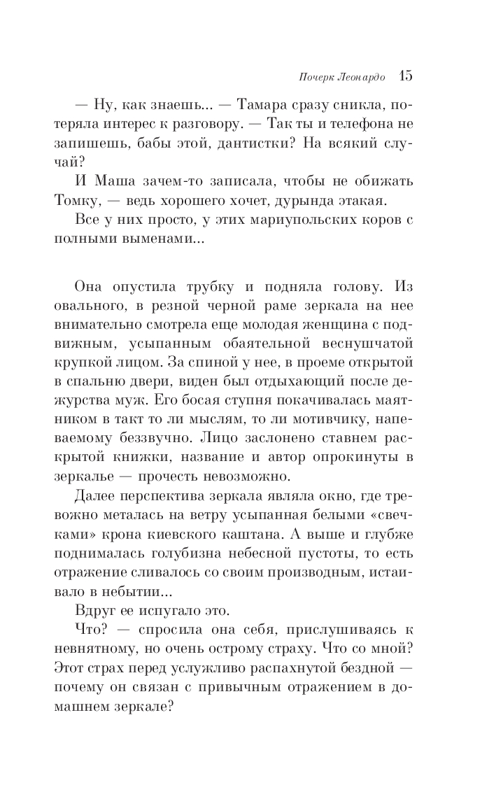 Она пишет зеркальным почерком, от которого у непосвященных кружится голова. У нее блестящие способности к математике и физике, она гениальная циркачка, невероятный каскадер, она знает о зеркалах все, что можно о них знать. Она умеет видеть прошлое и прозревать будущее. Киев, Москва, Франкфурт, Индианаполис, Монреаль – она летит по жизни, неприкаянная и несвободная, видит больше, чем обычный человек способен вообразить, – и ненавидит за это себя и того, кто наделил ее такой способностью.