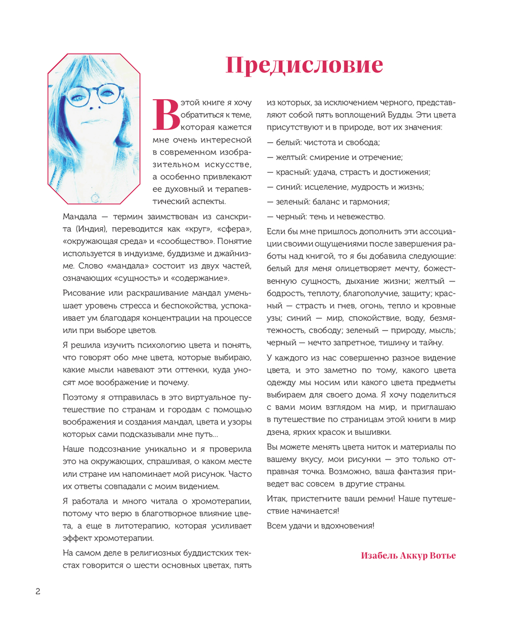 Новинка от известной французской вышивальщицы, дизайнера и автора более 20 книг – Изабель Аккур-Вотье! Это не просто руководство, а ваш проводник в увлекательном путешествии по миру мандал, созданных для достижения гармонии и преодоления стресса.