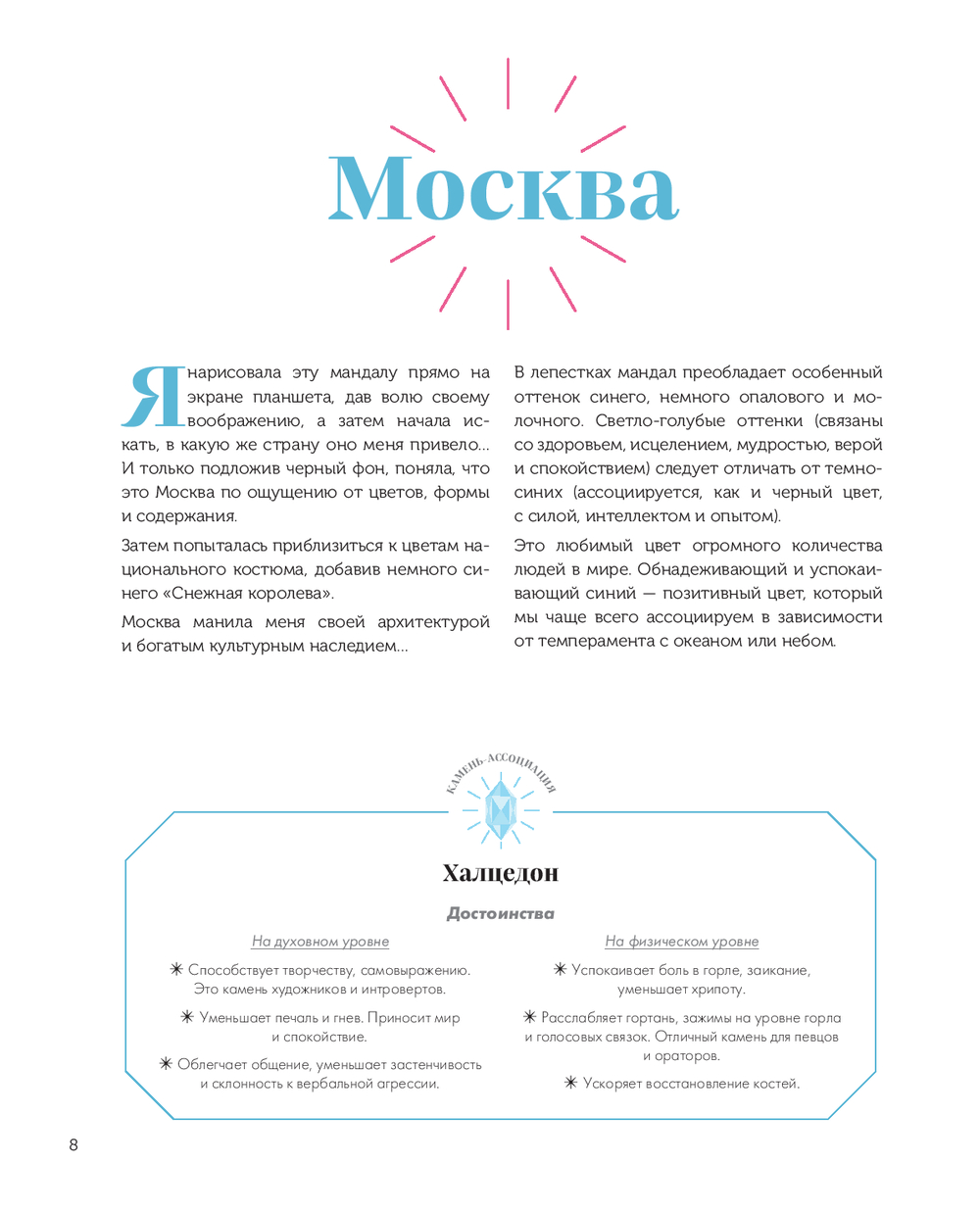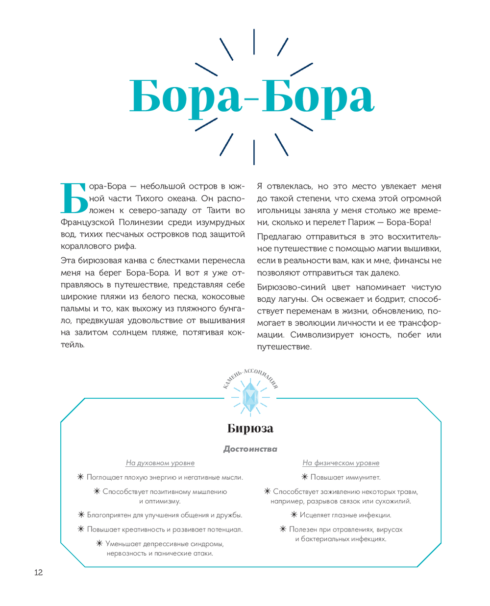 Вас ждут 20 невероятных авторских дизайнов, снабженных цветными схемами и цветовыми картами. Каждый из представленных в книге проектов представляет собой уникальную вышивку-ассоциацию с тем или иным причудливым уголком света. Многообразие цветов, форм и размеров мандал позволит вам создать неповторимые вышивки, которые украсят ваш интерьер и добавят в жизнь ярких красок.
