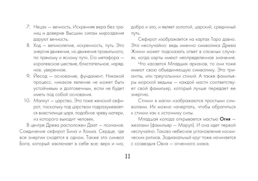 Каждый элемент Таро "Сердце ведьмы" наполнен магией. Рубашка – изображение Древа Жизни Сефирот, а на фоне карт Младших Арканов есть алхимические символы, которые соответствуют энергии карты и усиливают ее.