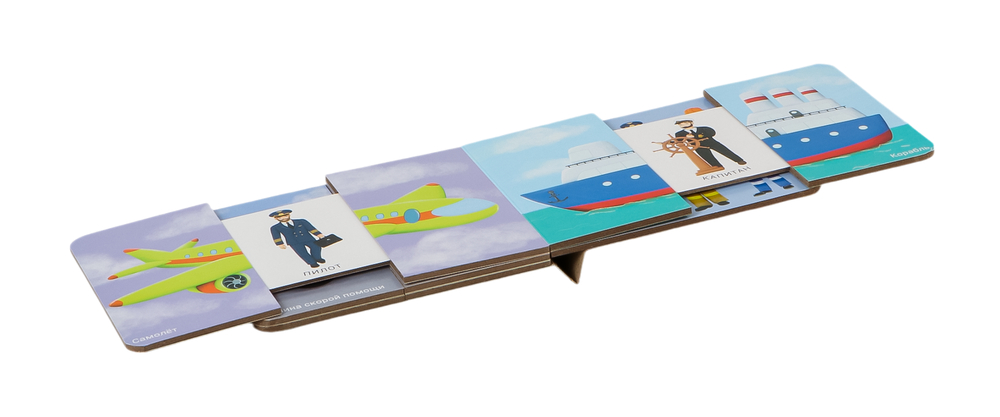 Раздвижная книжка-картонка познакомит вашего малыша с разными видами транспорта. Ребёнок узнает, как называют людей, которые управляют автомобилем, пожарной и полицейской машинами, самолётом и кораблём. Ваш малыш получит первые знания о профессиях людей.
