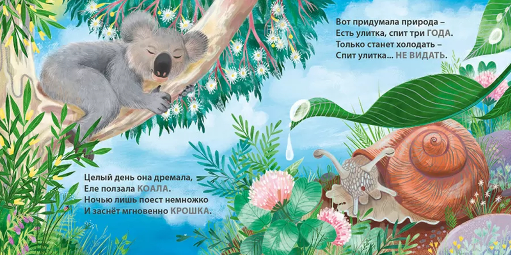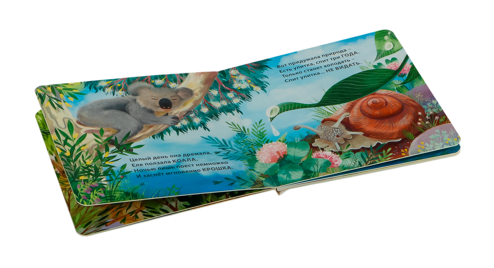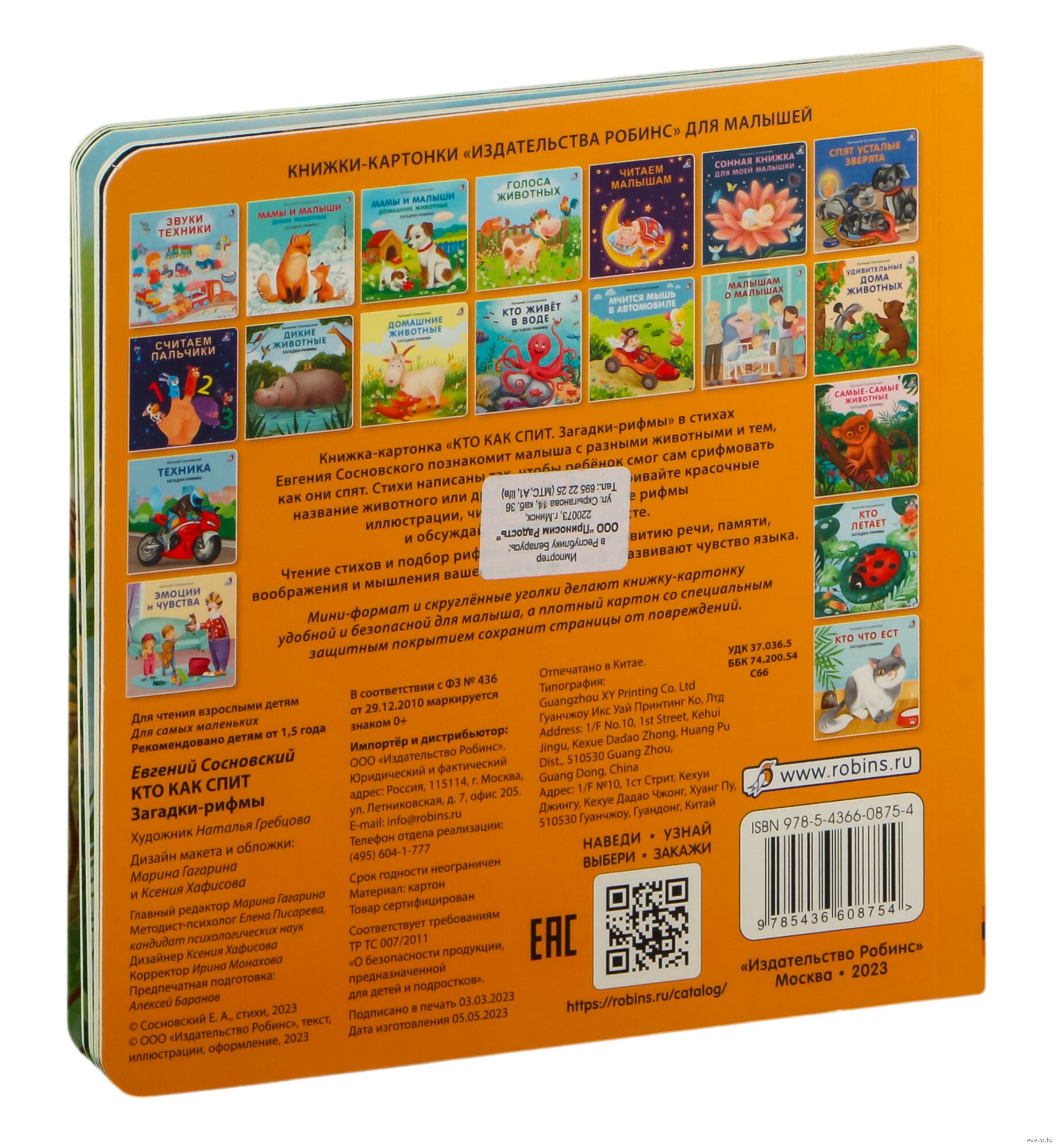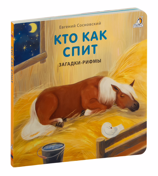Книжка-картонка в стихах Евгения Сосновского познакомит малыша с разными животными и тем, как они спят. Стихи написаны так, чтобы ребёнок смог сам срифмовать название животного или другие слова.