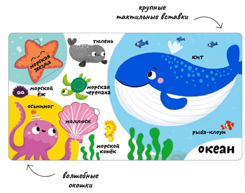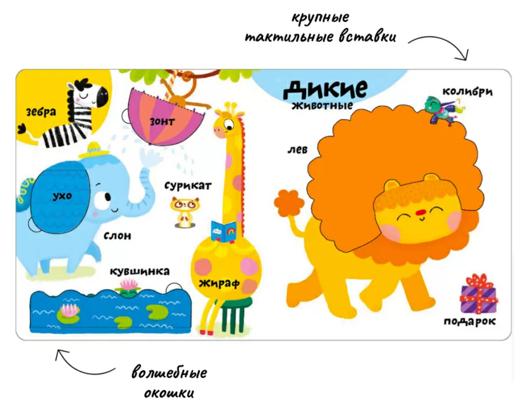 Благодаря ярким иллюстрациям, тактильным вставкам и большим окошкам ребёнок с лёгкостью пополнит свой словарный запас, изучит много нового и познавательного.