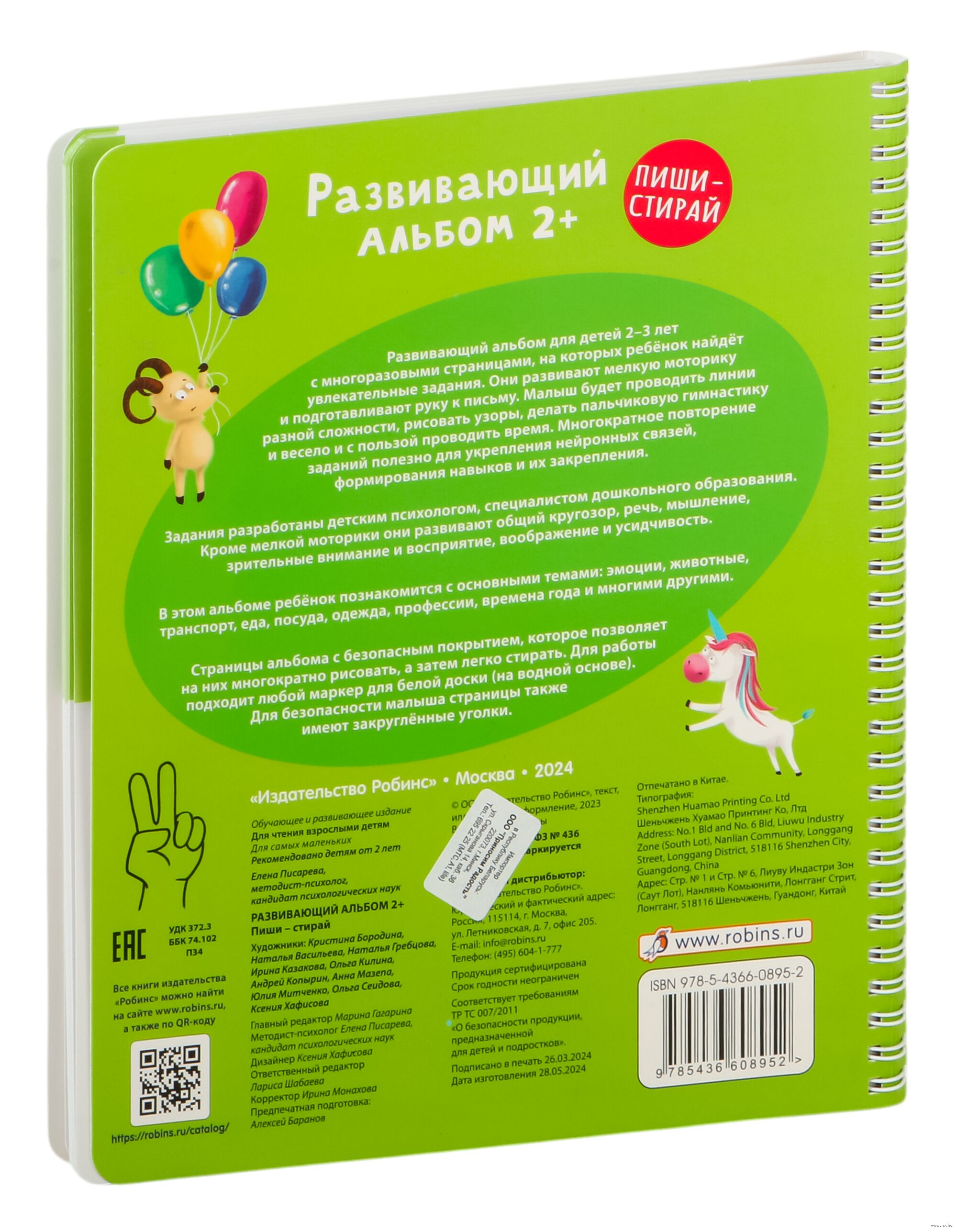 Развивающий альбом для детей 2-3 лет с многоразовыми страницами, на которых ребёнок найдёт увлекательные задания. Они развивают мелкую моторику и подготавливают руку к письму. Малыш будет проводить линии разной сложности, рисовать узоры, делать пальчиковую гимнастику и весело и с пользой проводить время. Многократное повторение заданий полезно для укрепления нейронных связей, формирования навыков и их закрепления.