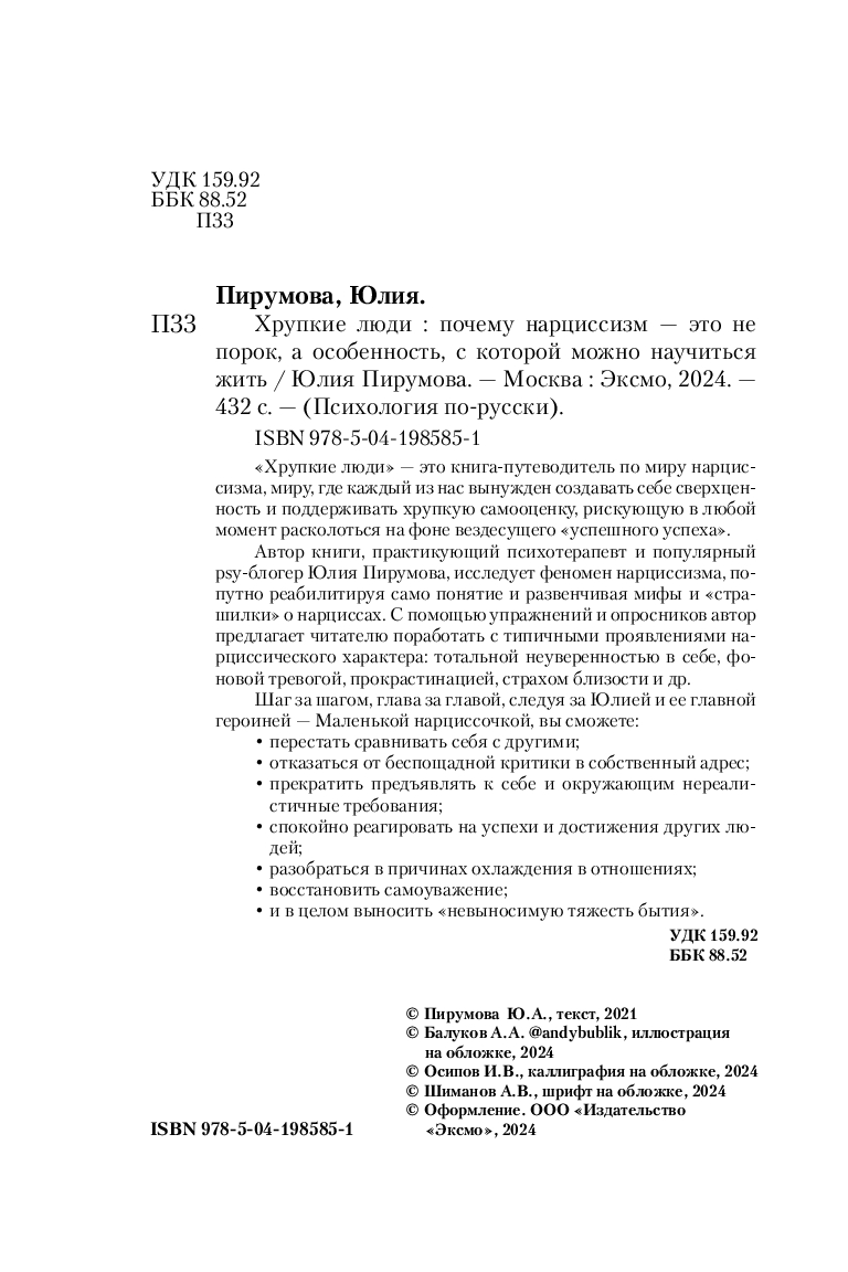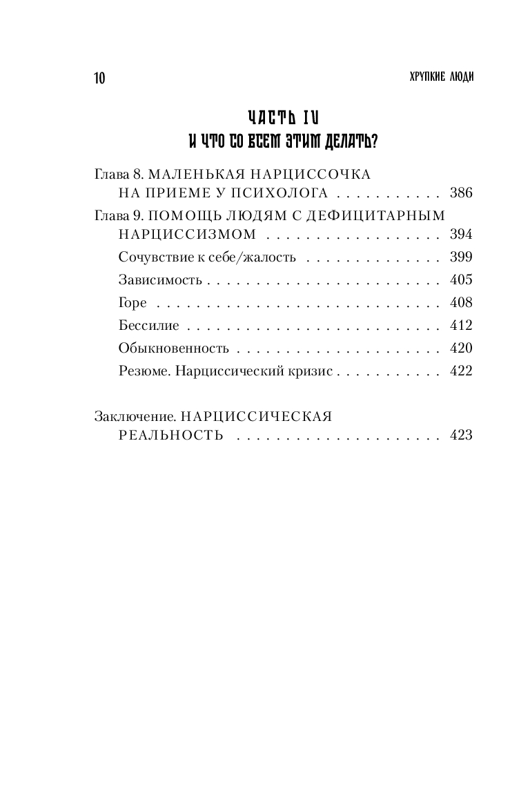 "Хрупкие люди" – это книга-путеводитель по миру нарциссизма. Миру, где каждый из нас вынужден создавать себе сверхценность и поддерживать хрупкую самооценку, рискующую в любой момент расколоться на фоне вездесущего "успешного успеха".